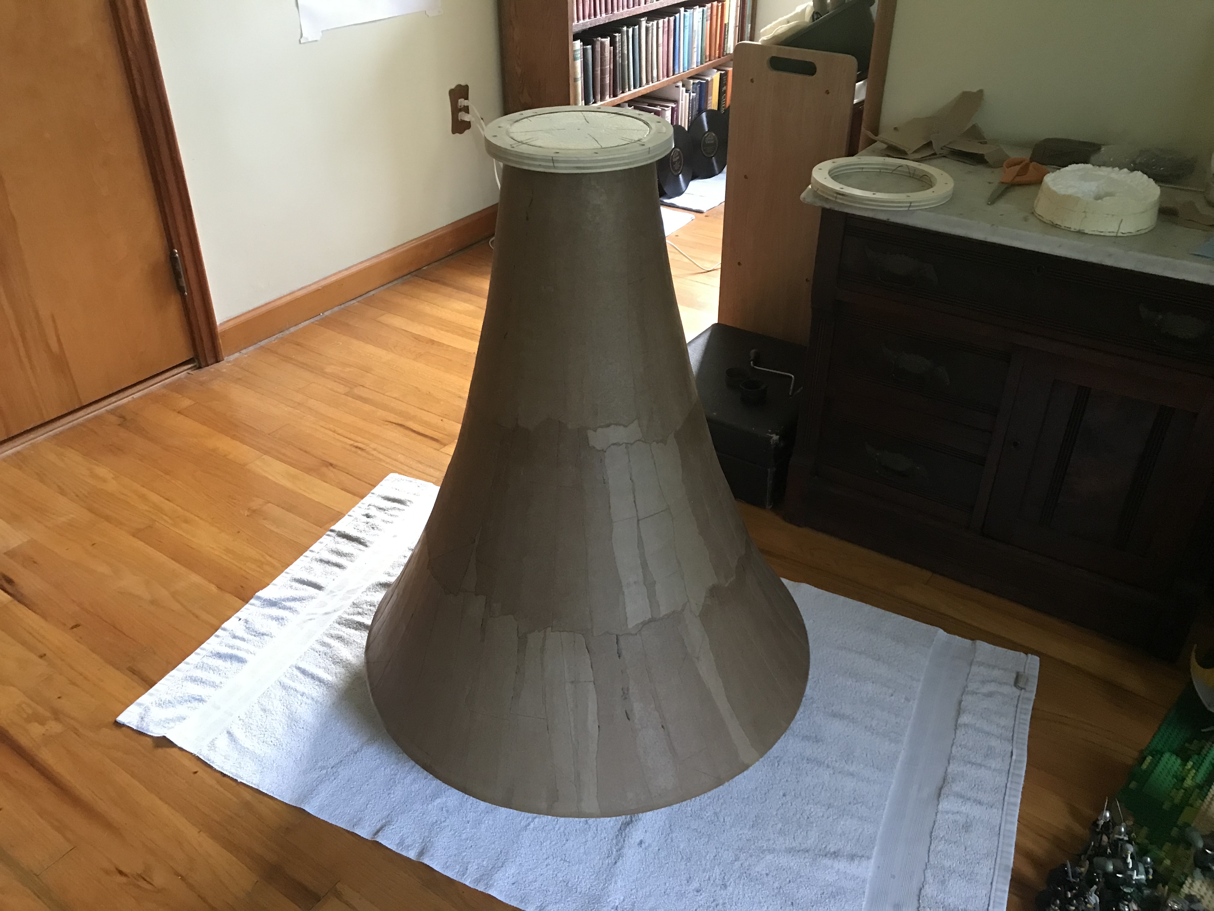 I started work on the mouth section, and just added the third layer (fifth and sixth, counting individual sheets) to-day; I mismeasured when cutting out the wood ring for the mouth—gave it a 12.75” radius instead of 13.75”—but then realized that I can just cut off the extra paper from each layer before adding the next, and fold a final layer over the cut edge after the horn is off the former.