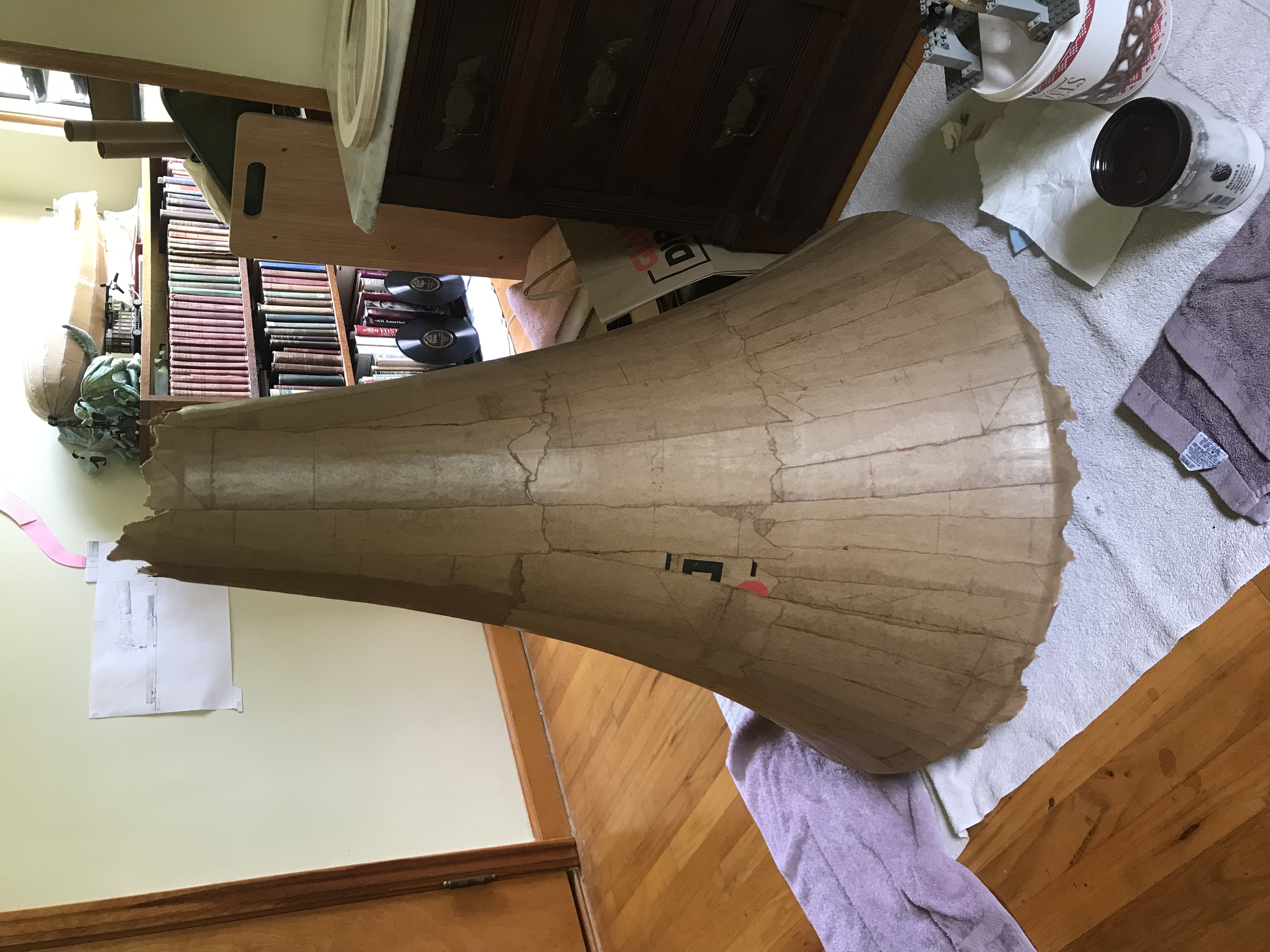 Once the lower layers have dried, adding more wet layers on top makes the first layers expand, so the mouth keeps expanding and rippling as paper is added, but so far, it seems to shrink back and pull tight against the former—Could this be why homemade paper horns tend have wrinkly inner surfaces? And if so, has anyone else noticed it happening and found a way to prevent it?
