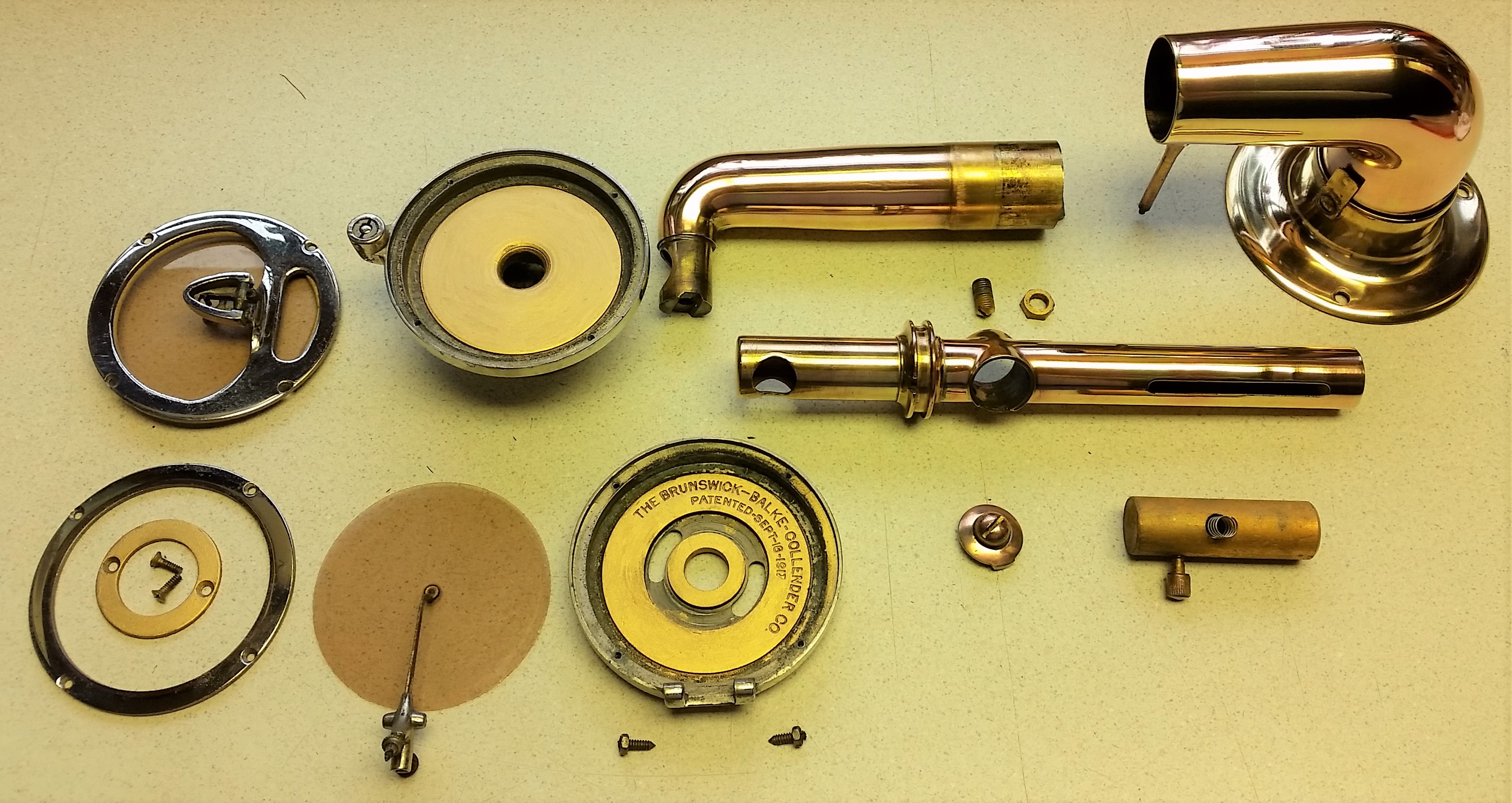 Next I broke down the tonearm and reproducers. A very interesting configuration. A lot of engineering went into this thing to be able to play all 3 disc formats. The gold plate was pretty much gone on most of the assembly. I used MAAS polish on each piece and everything polished up back to the brass base. The reproducer head is pot metal with nickel plate. Not crumbling but has pitting. Not much I could do there but polish the nickel that was there. The seals were hard as a rock. The Mica is perfect with no delamination or cracks. The screws broke loose with out much problem which was good because of them being in pot metal for all these years. I looked at the diamond tip and the sapphire tip under magnification the they both look real good. I will have to test them though.