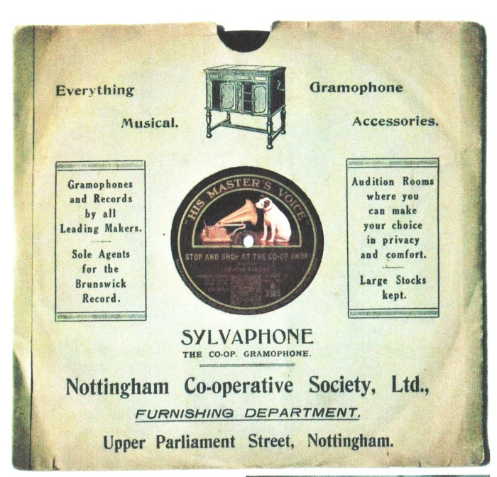 Here is one for the Nottingham Co-Operative Society, together with an advertisement for the Sylvaphone gramophones manufactured by the Co-Operative Wholesale Society at their Hay Mills, Birmingham factory.wrichard wrote: Thu Mar 20, 2025 10:05 am Brightside and Carbrook Cooperative Society. Vacated Sheffield city stores a few years ago. Don't know what happened to Stainforth Road. Anybody else got any Cooperative sleeves?
