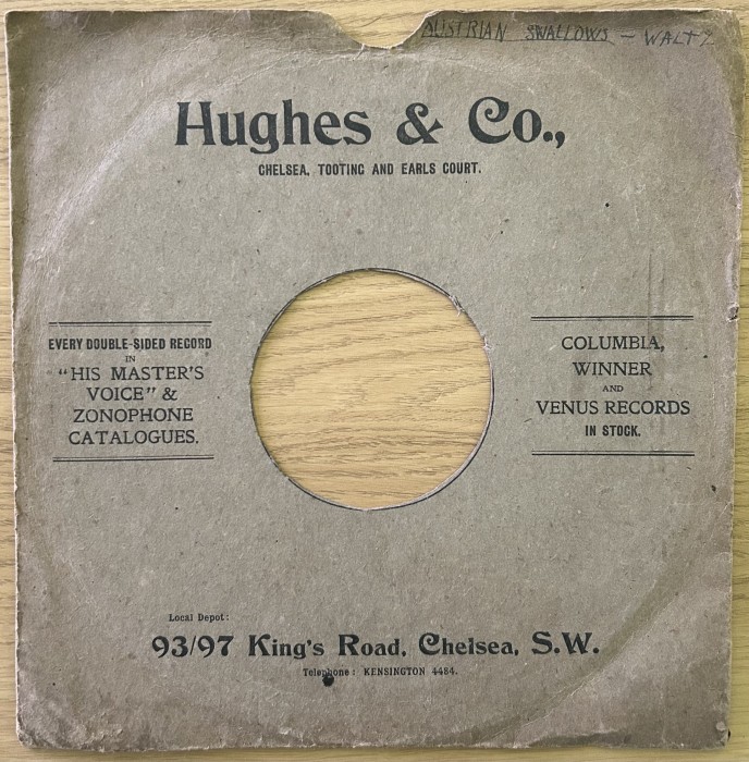 I have been unable to discover anything about Hughes & Co, but the fact that they stocked Venus records dates the cover to between 1917 and 1920. Here is an example of this short lived label :