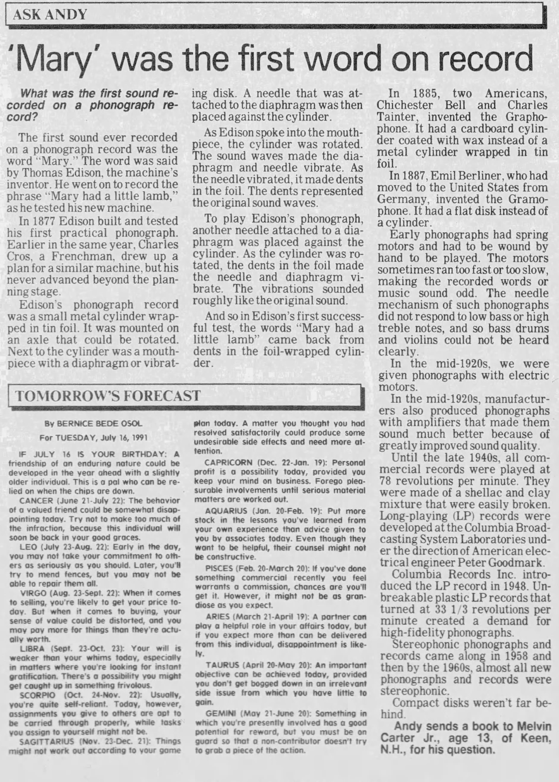 Some blurb about how Mary was the first word recorded on Edison’s original machine. And NO I did not write this article, I could barely talk in 1991!