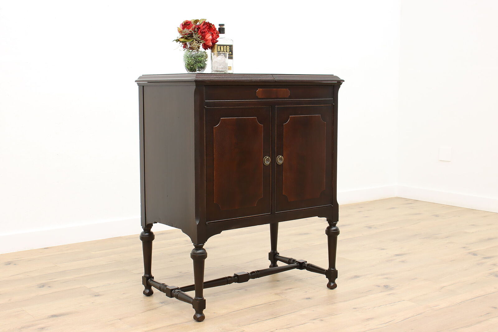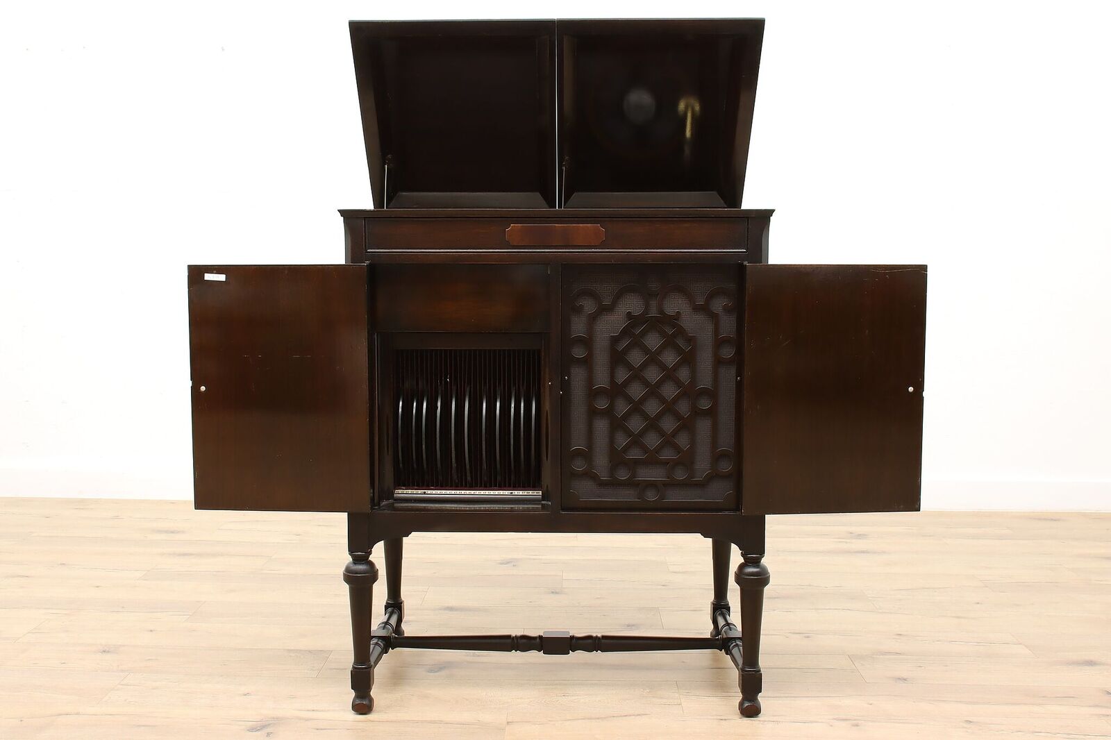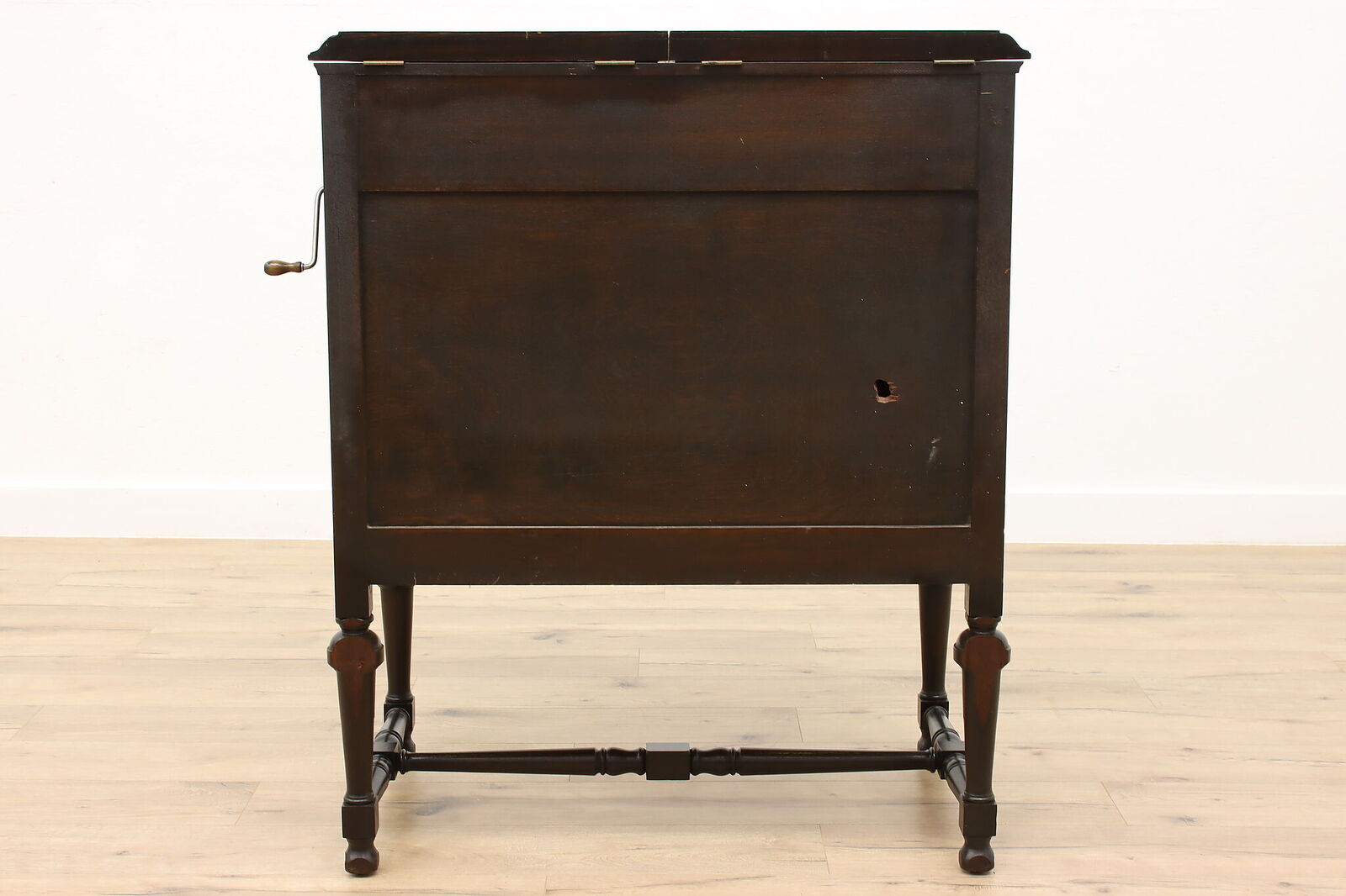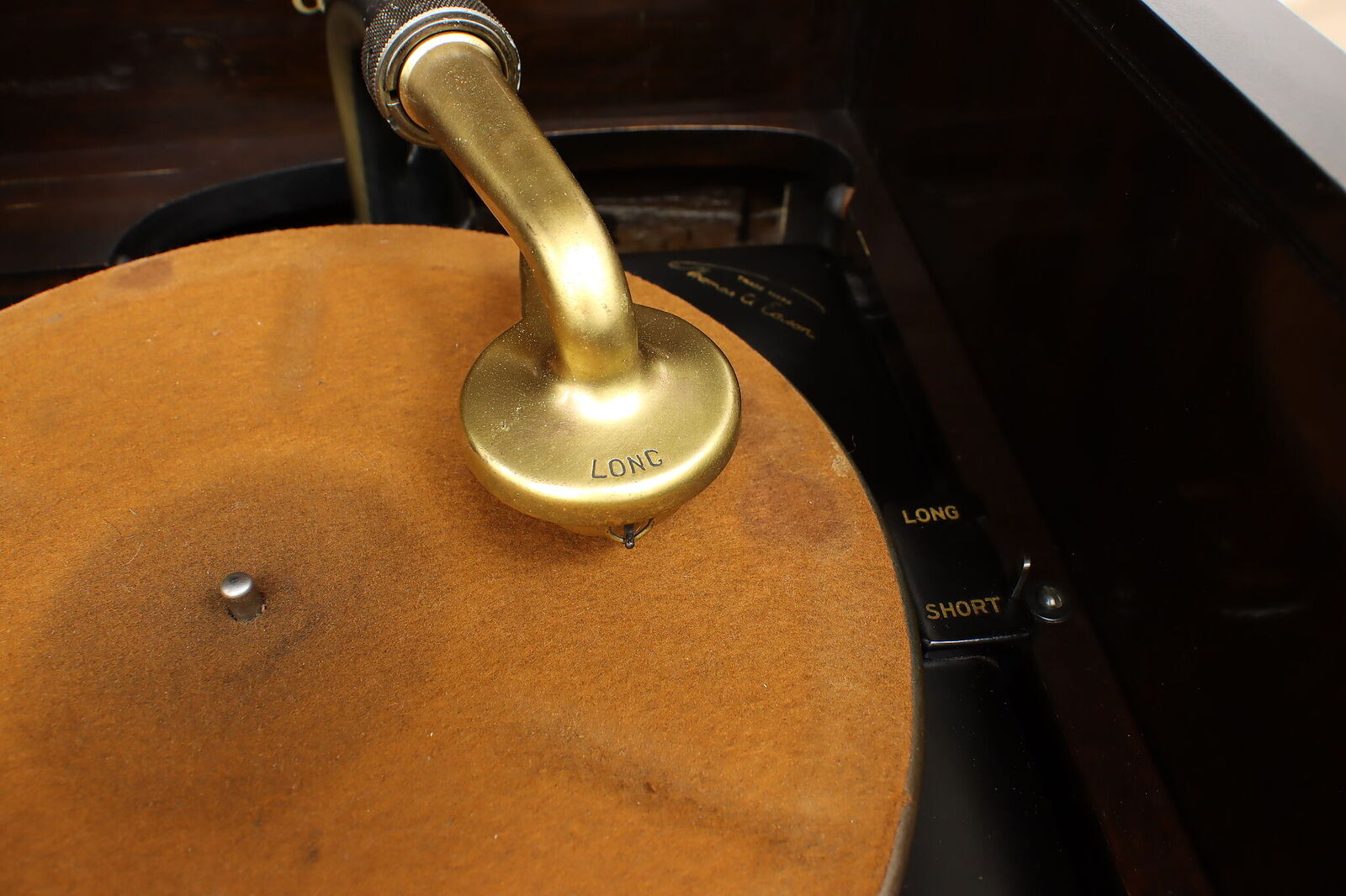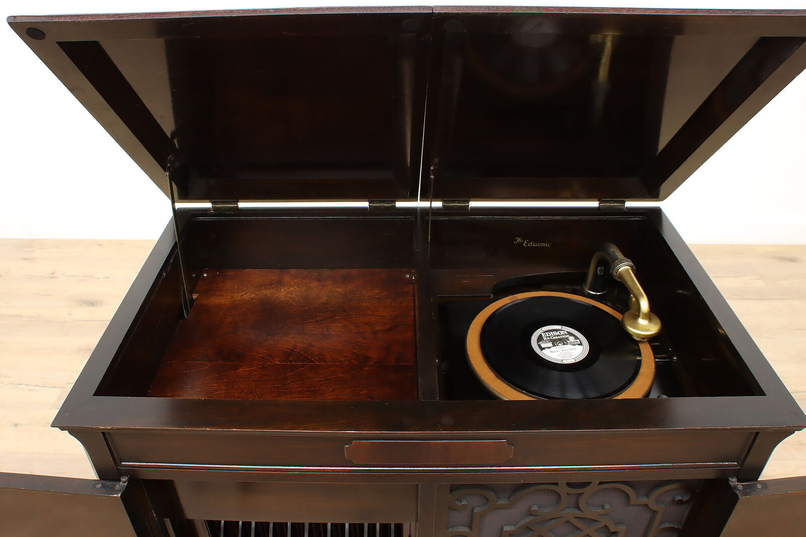 The machine is fitted with long play gearing and comes with a long play reproducer. Grille and grillecloth look good. I was actually tempted to explore consolidating my three Edison disc players into just that one until I read "Top surface has been refinished for durability. The rest of the original crazed varnish has been cleaned and preserved with a coat of clear finish." Admittedly, it looks fine in the pictures, but we all know that pictures usually look better than "in person." Other issues: I think the crank is from an earlier Edison machine--at least, it looks more like the one from my C-250 than the one on my Schubert. Somebody has punched a hole in the back. The door pulls are not original. I've never seen a Beethoven in the flesh; did they have "through the top" record storage like that of the Schubert? If so, it's been boarded over in this machine. The seller advises, "Top left section could be useful as a small bar area." :roll: