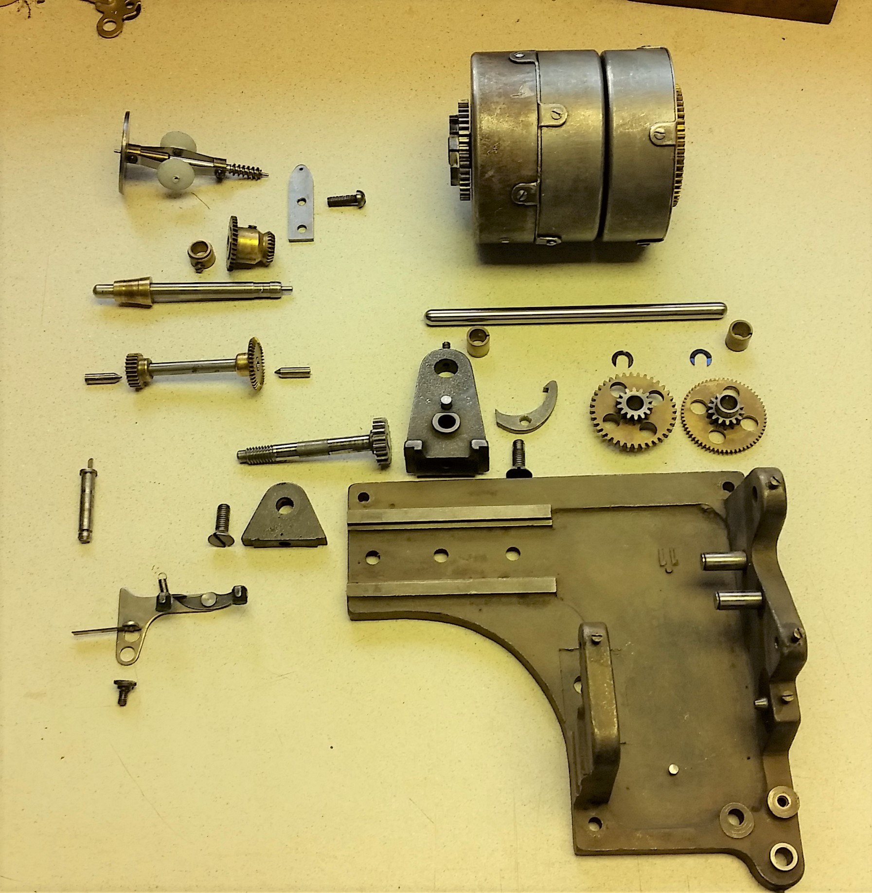 I carefully broke the motor down always looking at gear mesh and back lash to understand critical adjustments that I would need to understand for reassembly. This thing was pretty mucked up. I first cleaned each piece with kerosene just to get to were I could see what I had. Then I cleaned each part with acetone to remove all the crud from every edge and gear tooth. Took a little bit using tooth pick and tooth brushes to get it all off. What I found was a very impressive design for this motor. I think far superior to the Edison or Victor that I have rebuilt. I like the brass gears running on steel pinions. Much like the best clock movements I have worked with.