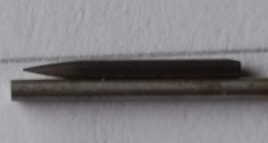 Here is a picture of one of the needles next to the shaft of a 5/64" drill bit for comparison. It looks as if it is of larger diameter than the drill bit, but it isn't. The drill bit won't fit in my AV, but the needle will.