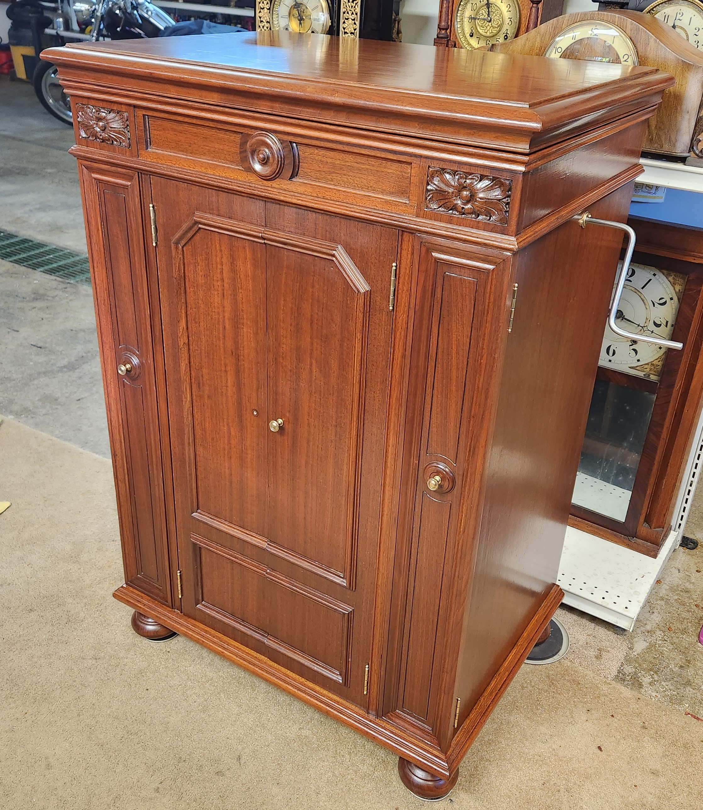Now the last part of the cabinet is to make new back panels. What I have is not repairable. I have already got the veneer, it is a long grain veneer that will match the grain pattern of the front and sides. I just got to decide what base wood to use, It needs to be ⅜". I don't know if high end plywood or some other composite woods would be best. I still have some missing hardware issues but I have been putting that off being consumed be the cabinet pieces.