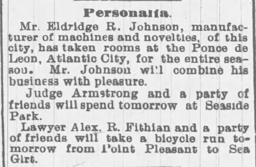 June 19, 1897: Eldridge Johnson will be staying at this hotel!