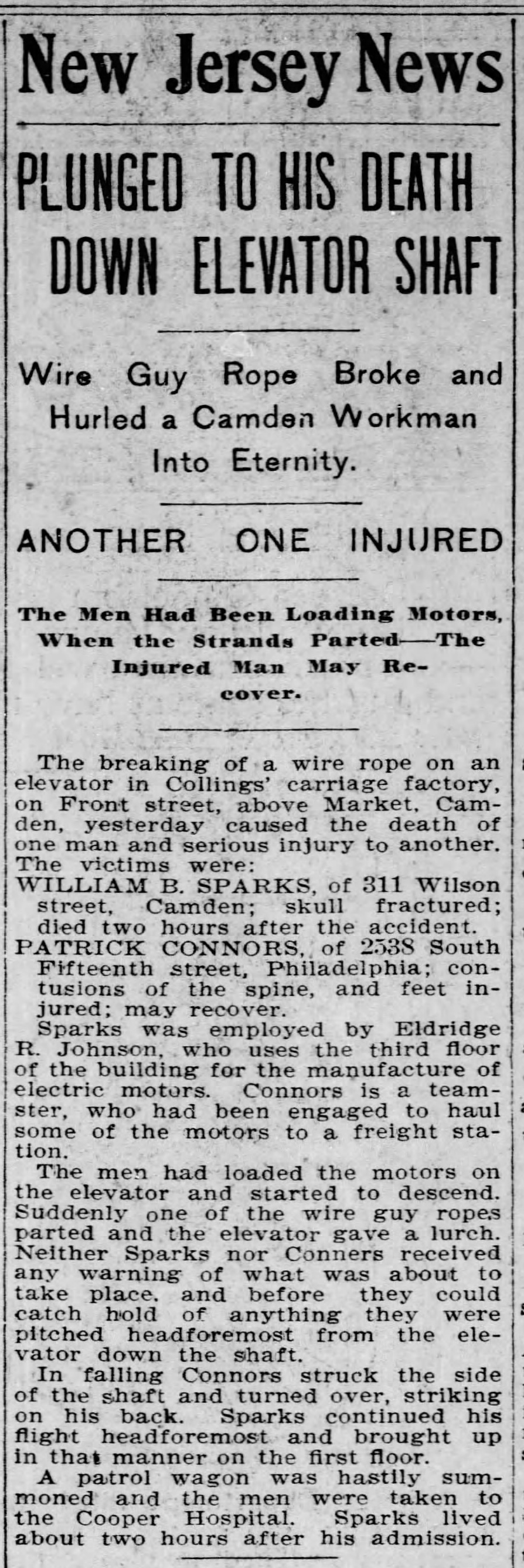 December 16, 1897: an employee of Eldridge Johnson dies in a elevator accident