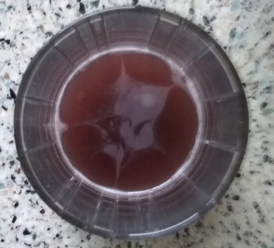 It is hard to see to the bottom of the liquid because the dye used was not colour fast, but there is about a 1/16" of black sludge at the bottom of the glass.