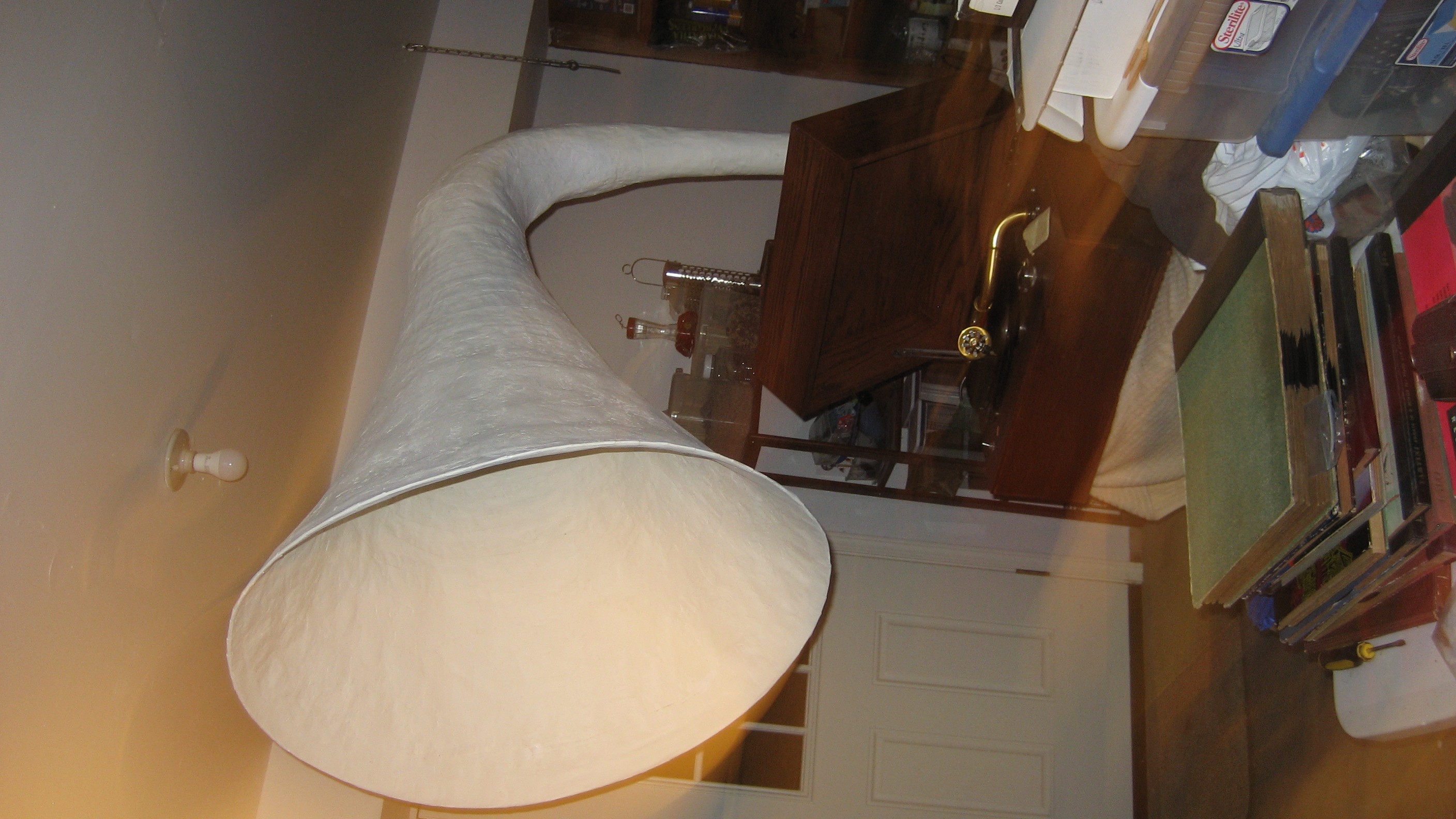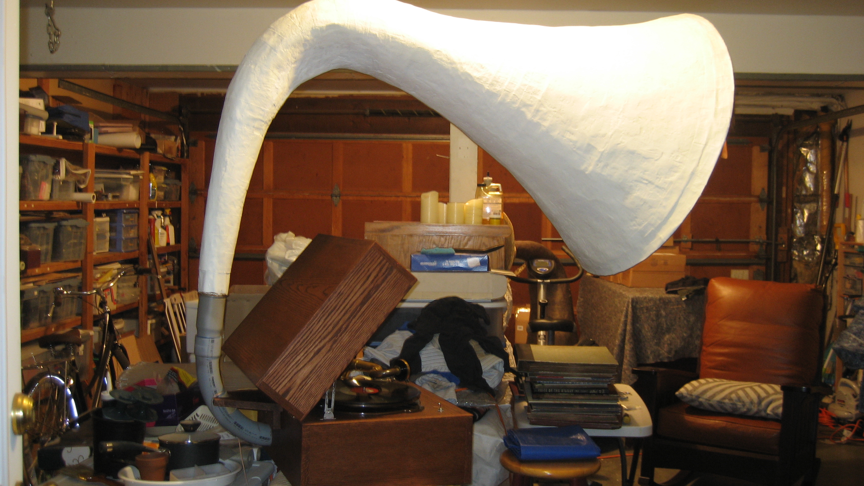 Calculating the length of the horn is proving a little troublesome for me, as I still don’t know if I should calculate the taper of the horn (in this case meaning just the large external structure) from where the horn begins at the end of the conduit from the one arm, and how the ultimate tone arm and conduit length will effect the ideal shape of the rest of the horn. I suppose the best practice would be to start with a soundbox, figure in the length of the tonearm and conduit needed, and then calculate the rest of the horn based on the conduit opening, but as of yet I still don’t have a truly suitable tone arm, and want to make the system compatible with a number of different sound boxes. It’s likely that making the parts function their best somewhat independent of the other parts is a goal at odds with achieving the best sound quality.
