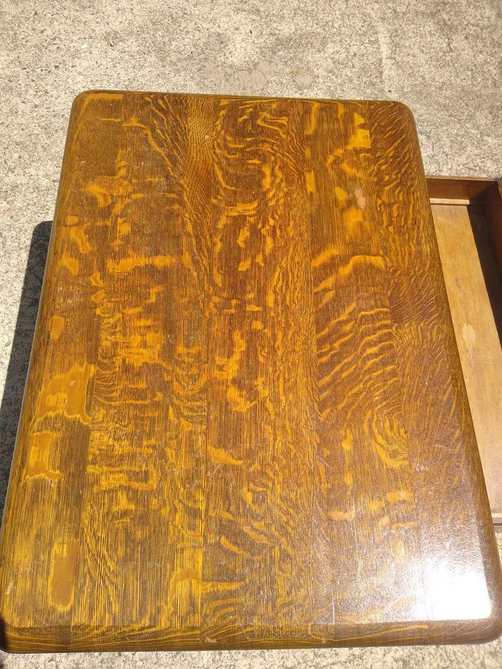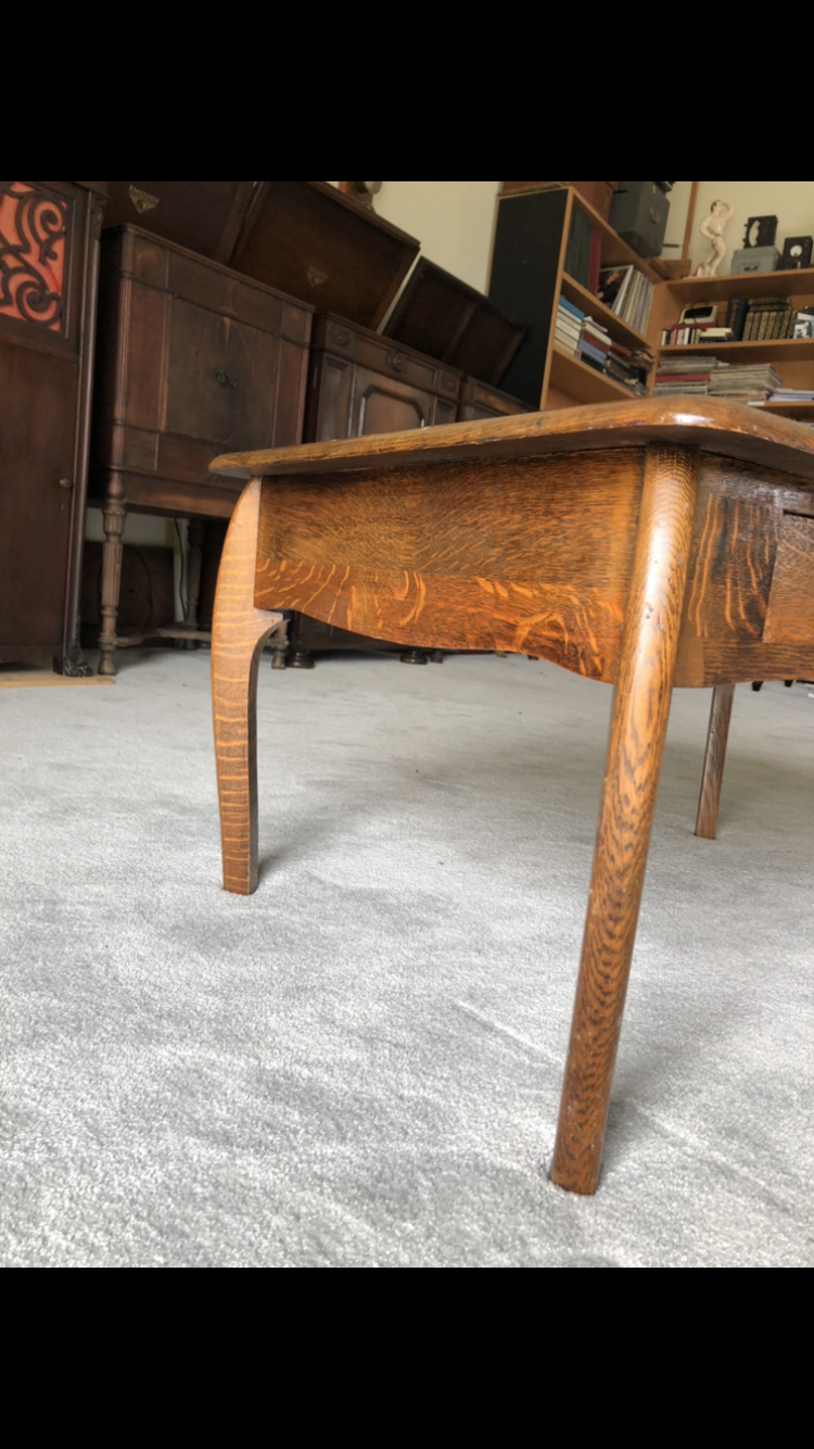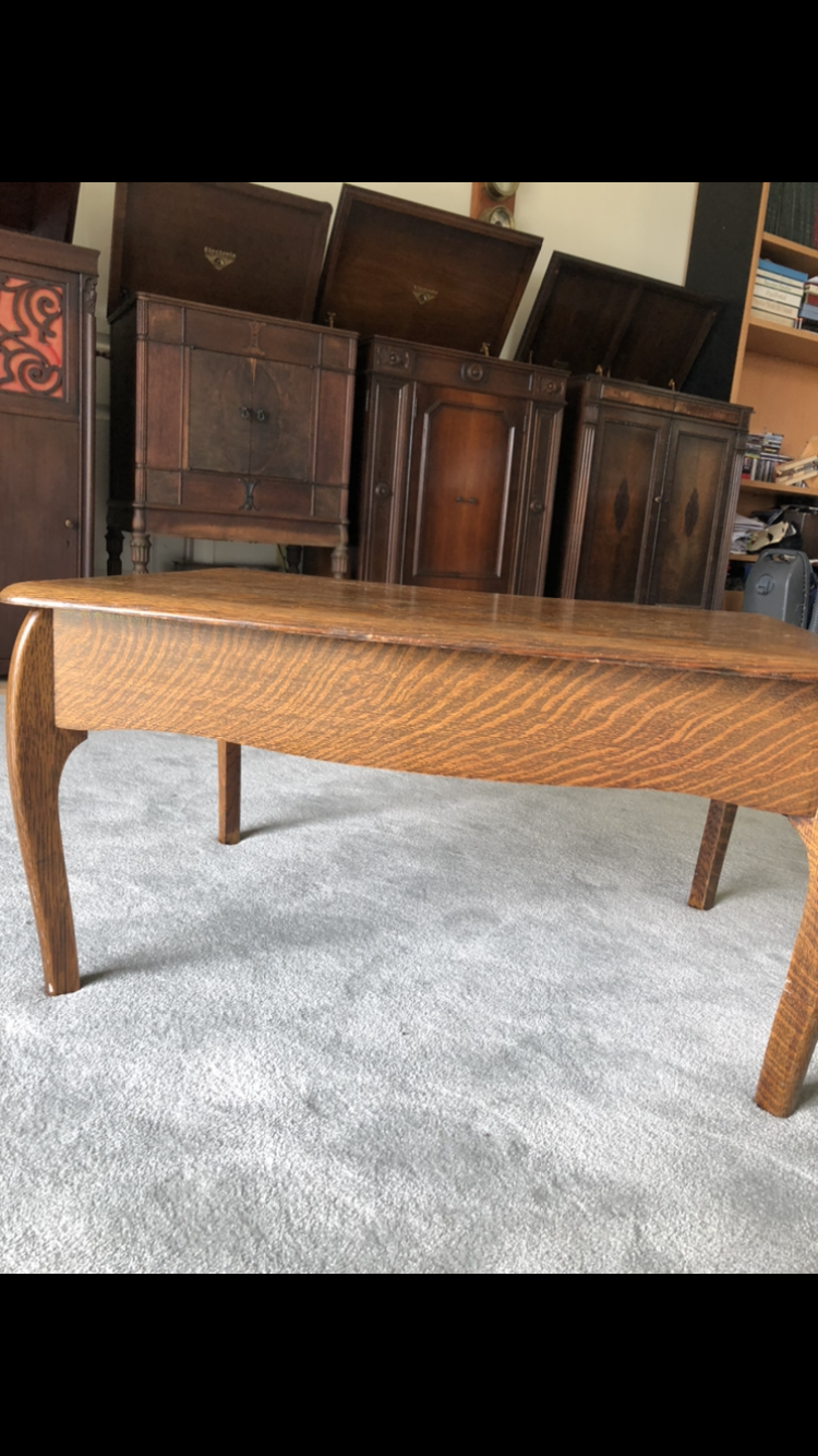 Secondly, I found a good solution for making the new top. I have been looking around marketplace for awhile trying to find an old piece of furniture to use for a top. I just bought this coffee table (they used a library table top for it) and will be able to make a new top from it. I'll bring it to my woodworking friend who will help me cut it and route the edge to match the old top. I know that this will not be a "correct" top, but I think it will turn out quite nicely. I will be getting the table towards the end of July. I am hoping I can have the top made and potentially glue the cabinet back together before the summer is over.