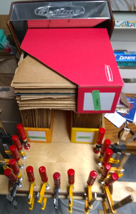 More work is required. I dampened the inside of the lid again, laid down layers of paper towel to absorb excess water and distribute humidity more evenly, covered all with wax paper, and inserted a board cut to the shape of the case bottom and lid. Then I placed the old bed slats strategically and clamped it all down. I also placed boxes of 78s in the case. We shall how this goes.
