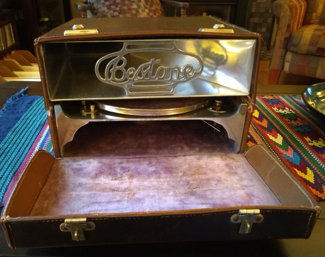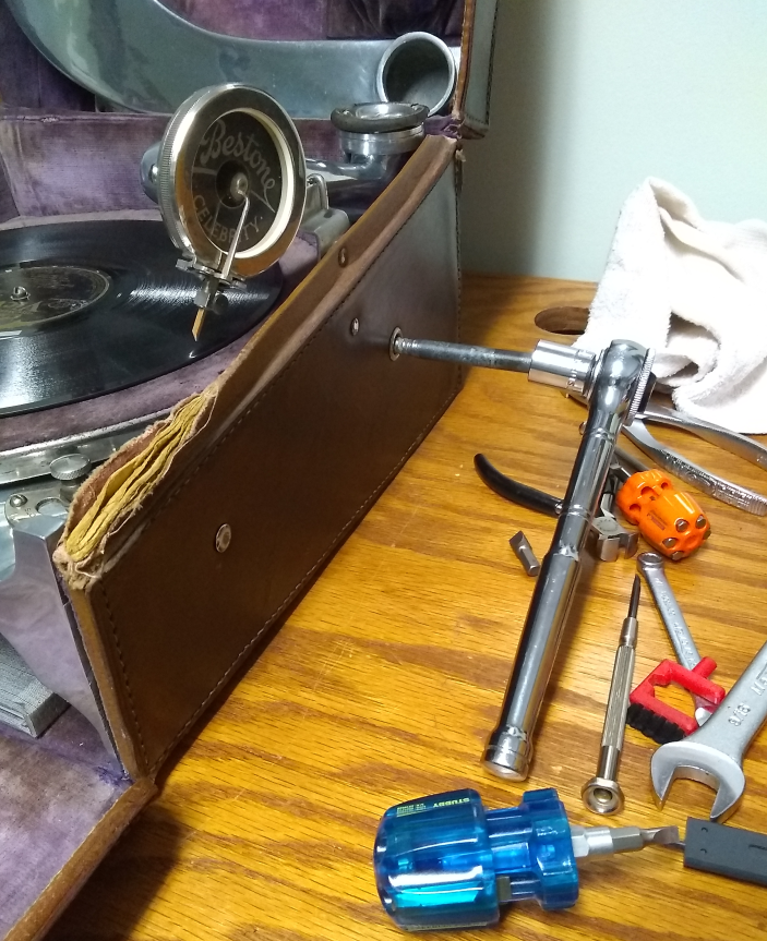 The motor runs fairly quietly under a load, and the tic, tic, tic noise is either gone or inaudible. It runs stably at 78 RPM without much wow and flutter. The spring is quiet both winding and playing, but it is a very small spring, and in the machine's current condition it struggles to play 12" records, particularly electrically recorded ones. The motor really does need a complete overhaul and tune up.