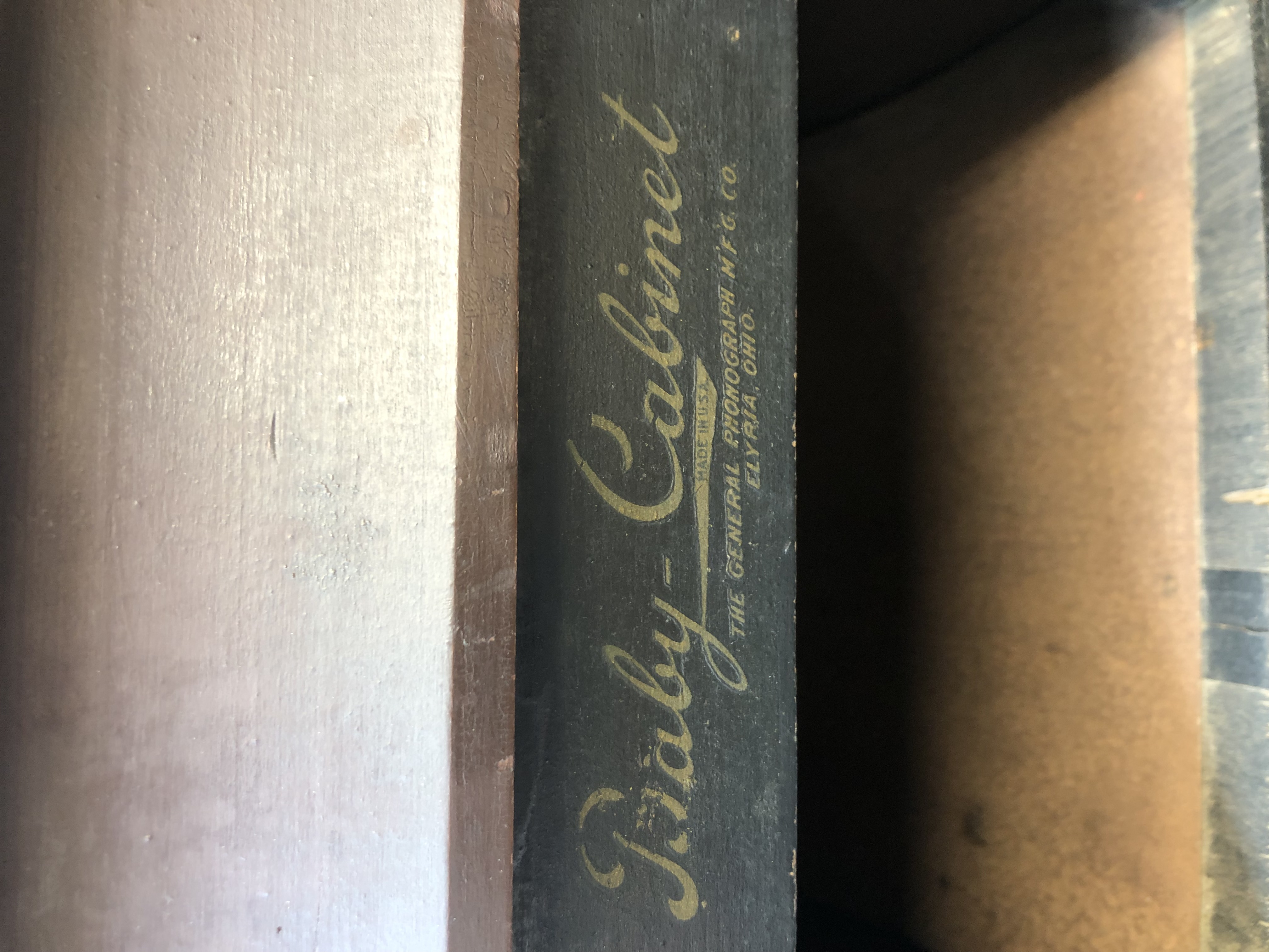 I recently picked up a child's phonograph called a Baby - Cabinet. It looks like a small Victrola and plays small 5" records. It seems there were 2 styles made - one with a small horn attached to the tonearm, and one with an internal horn style design(which is what I have). I'd like to restore/replace the logo decal as mine is nearly gone.
