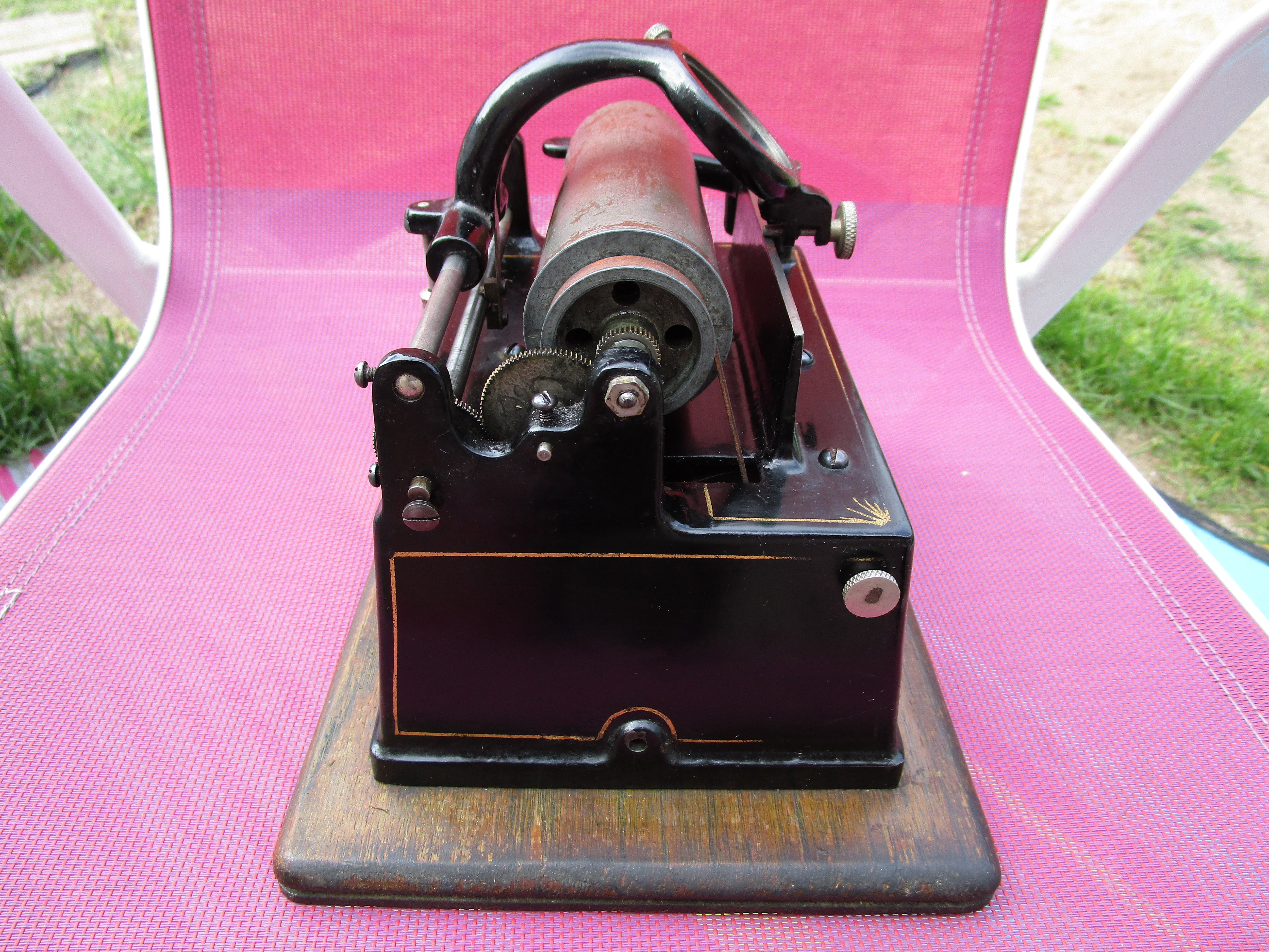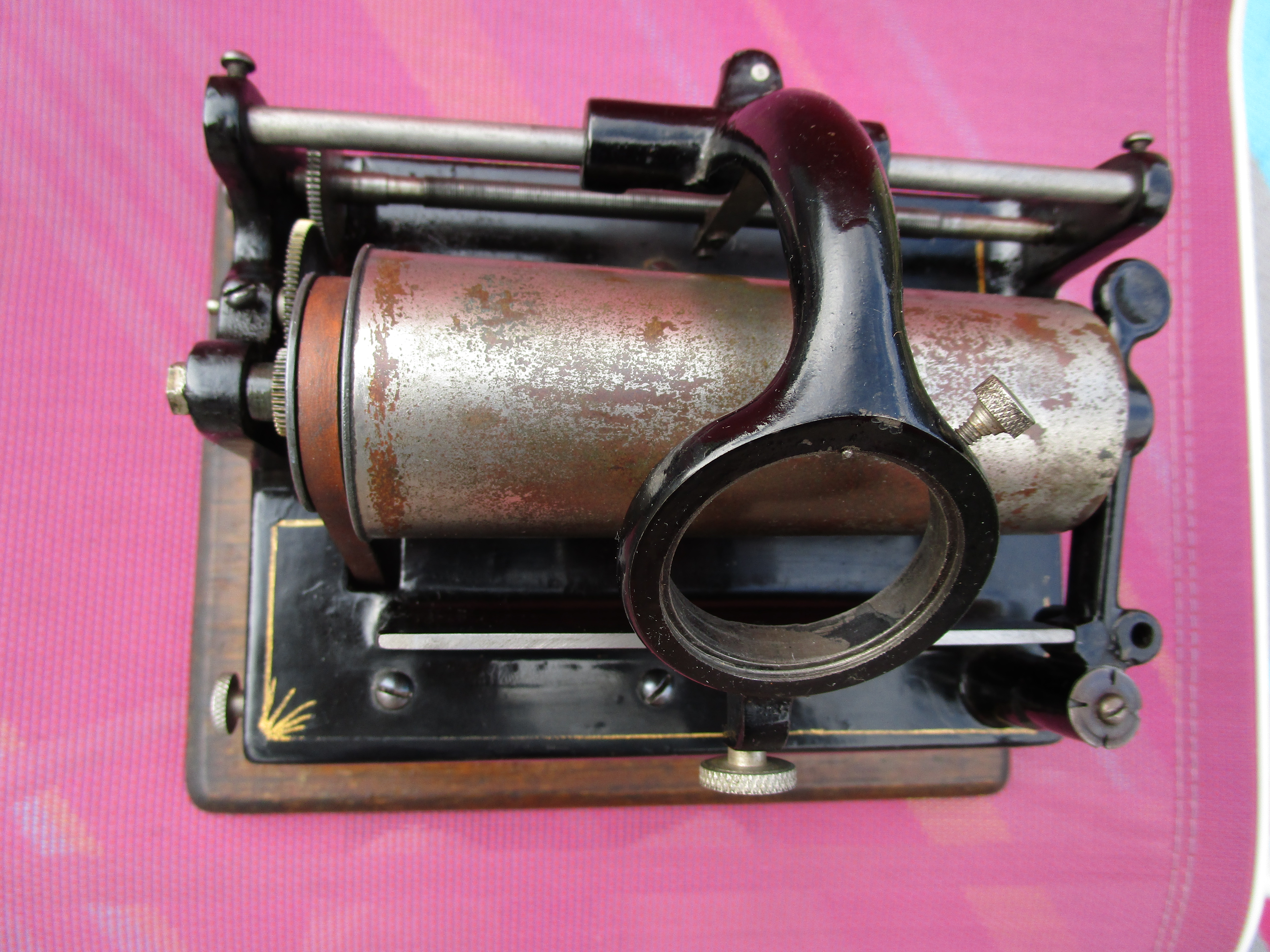 Overall very good original condition on this early key wind Edison Gem model A. All original including key. I replaced the leather belt. Winds up, works and plays beautifully. Smooth, quiet motor for a model A Gem. No reproducer or horn with this. Mandrel has most of the original nickel plating worn off. I'll try to record and post a video of this machine working when I get a chance. PM with interest, PayPal Friends or check, USPS extra at cost.