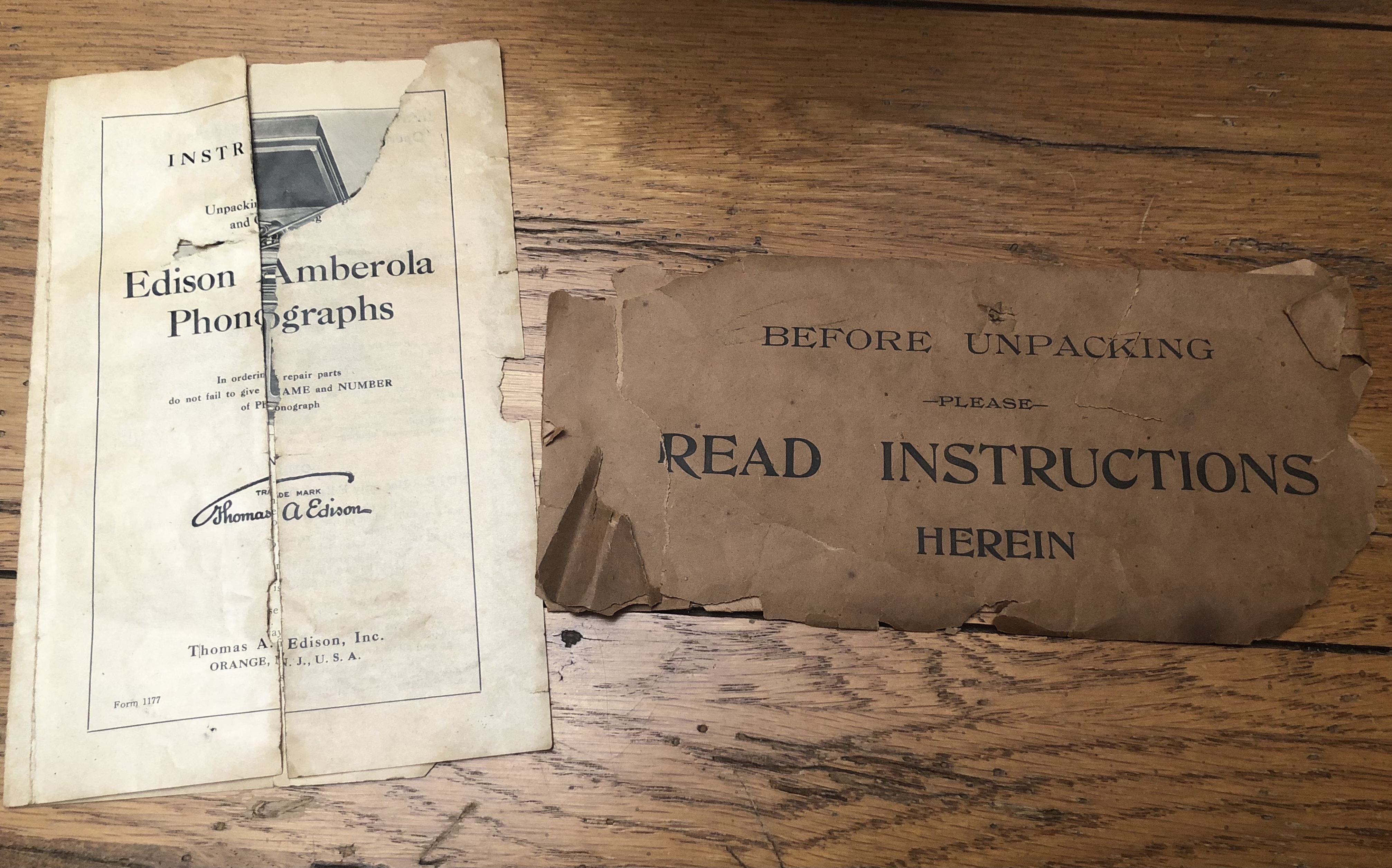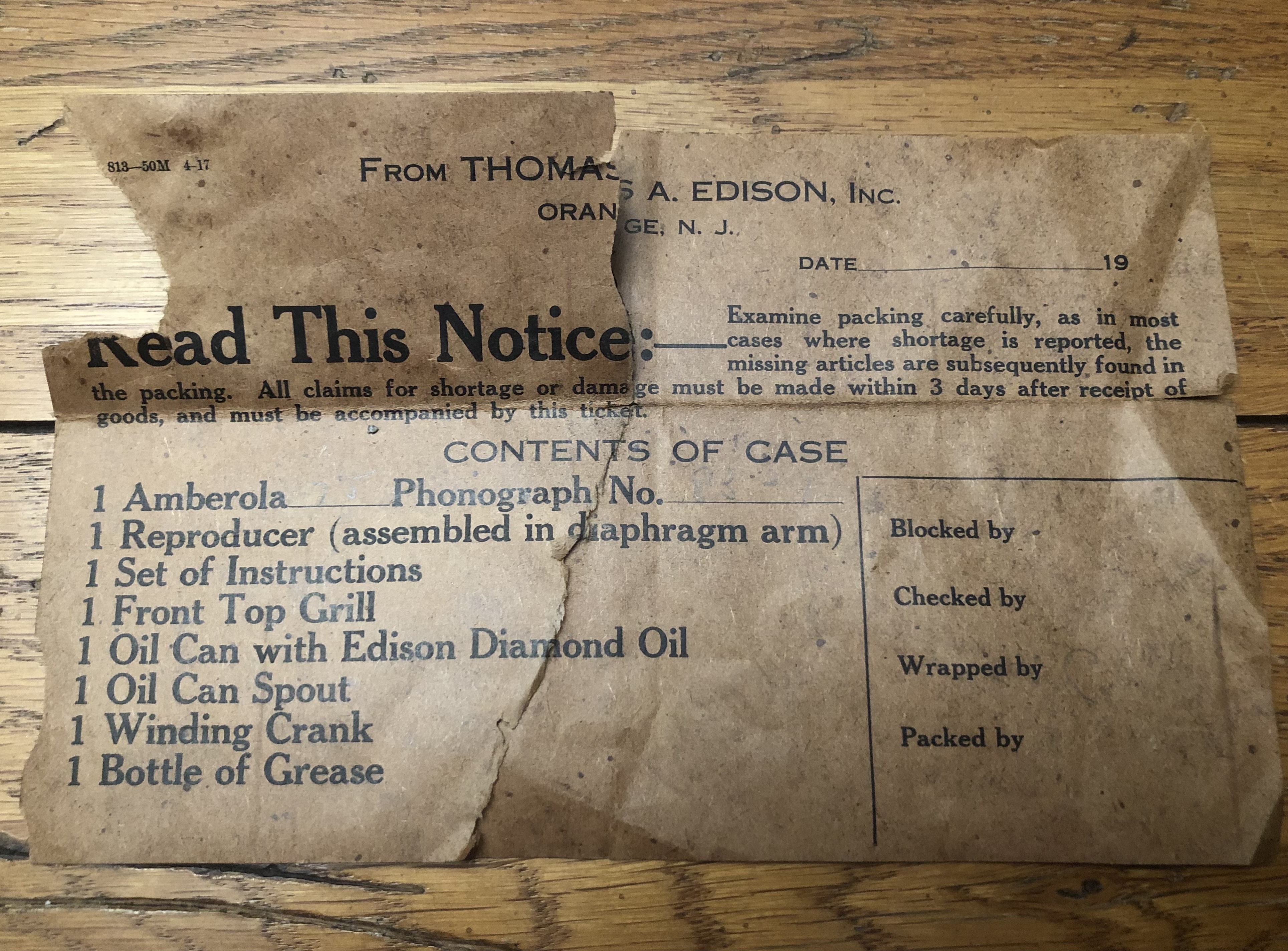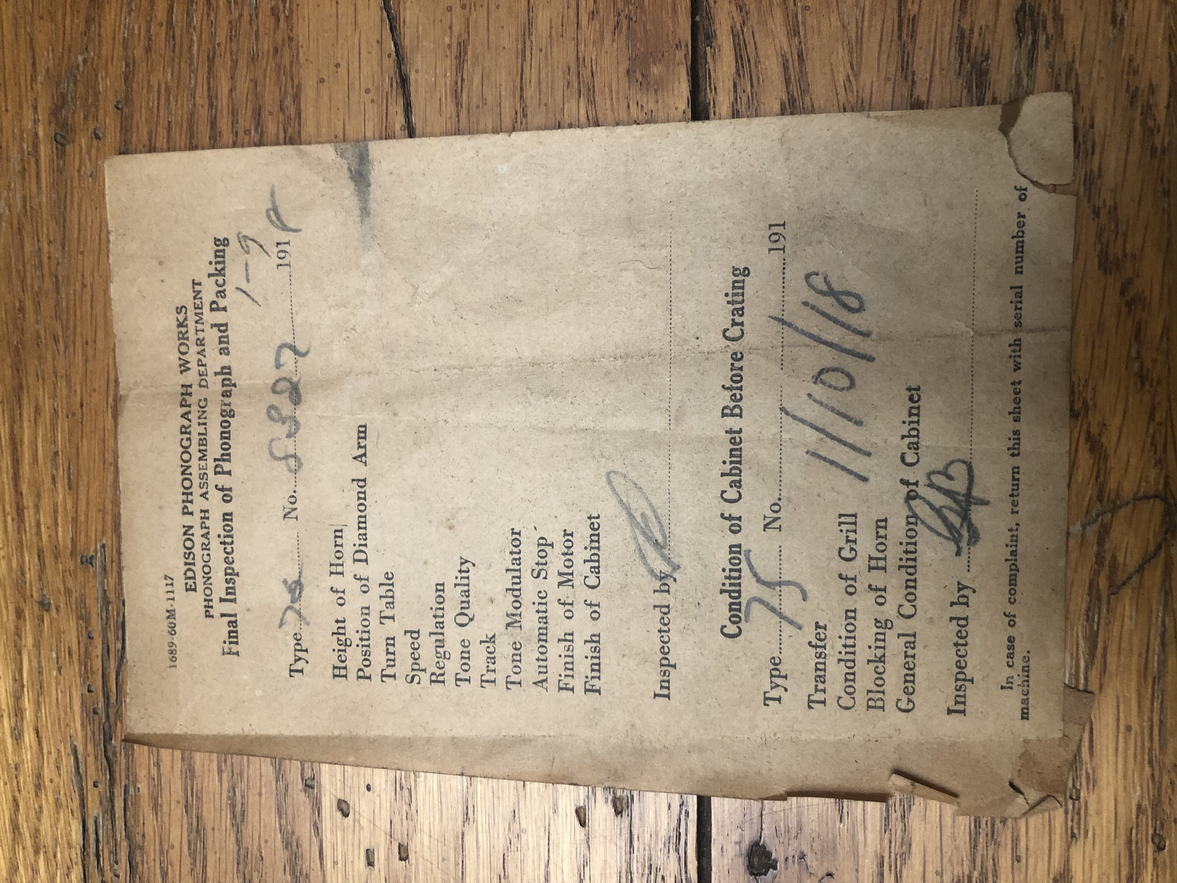 Found these original shipping and operating papers in, back behind the horn on my recent, single family owned, Amberola 75 purchase. It helps give an exact date to this serial number.