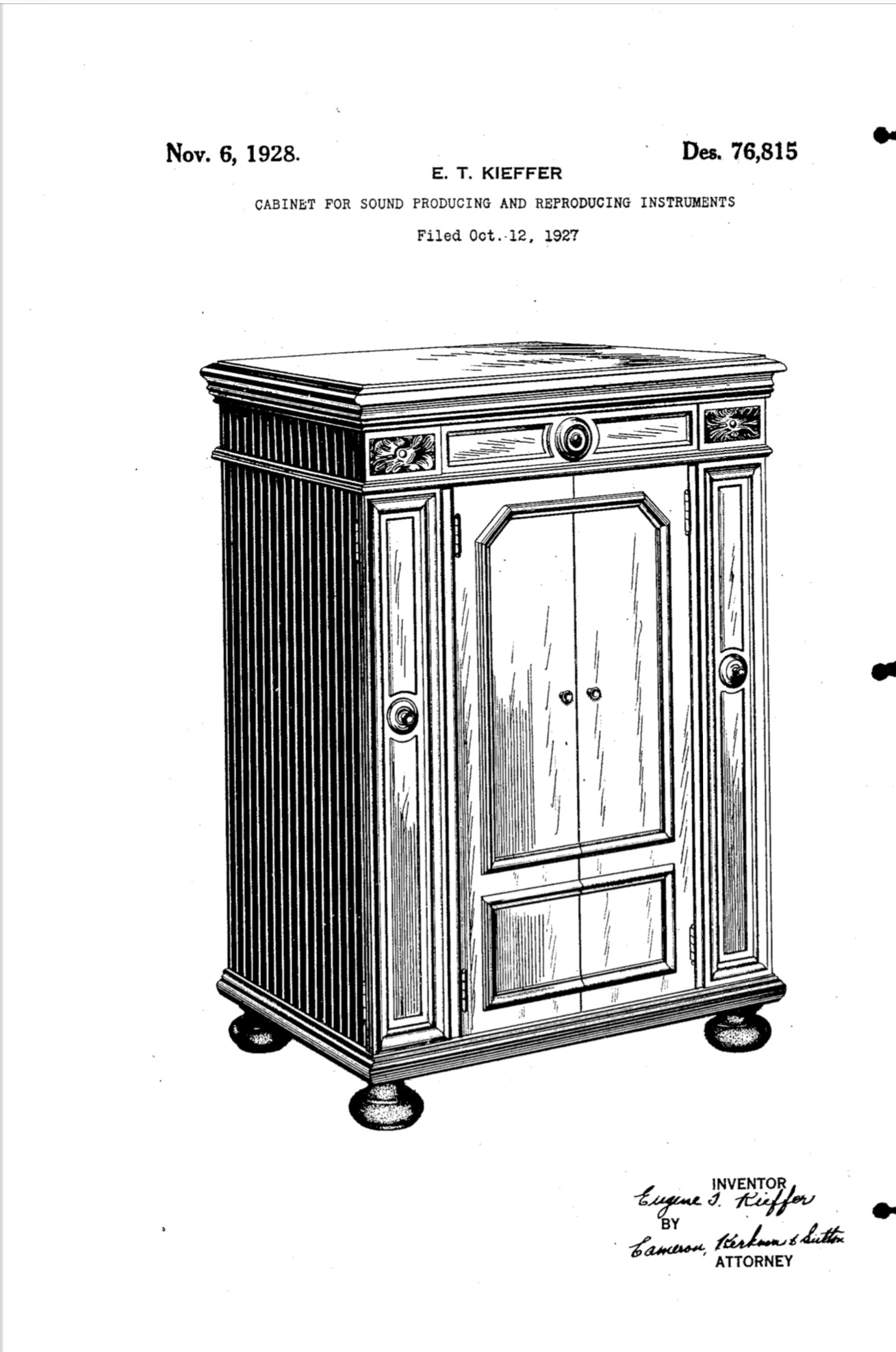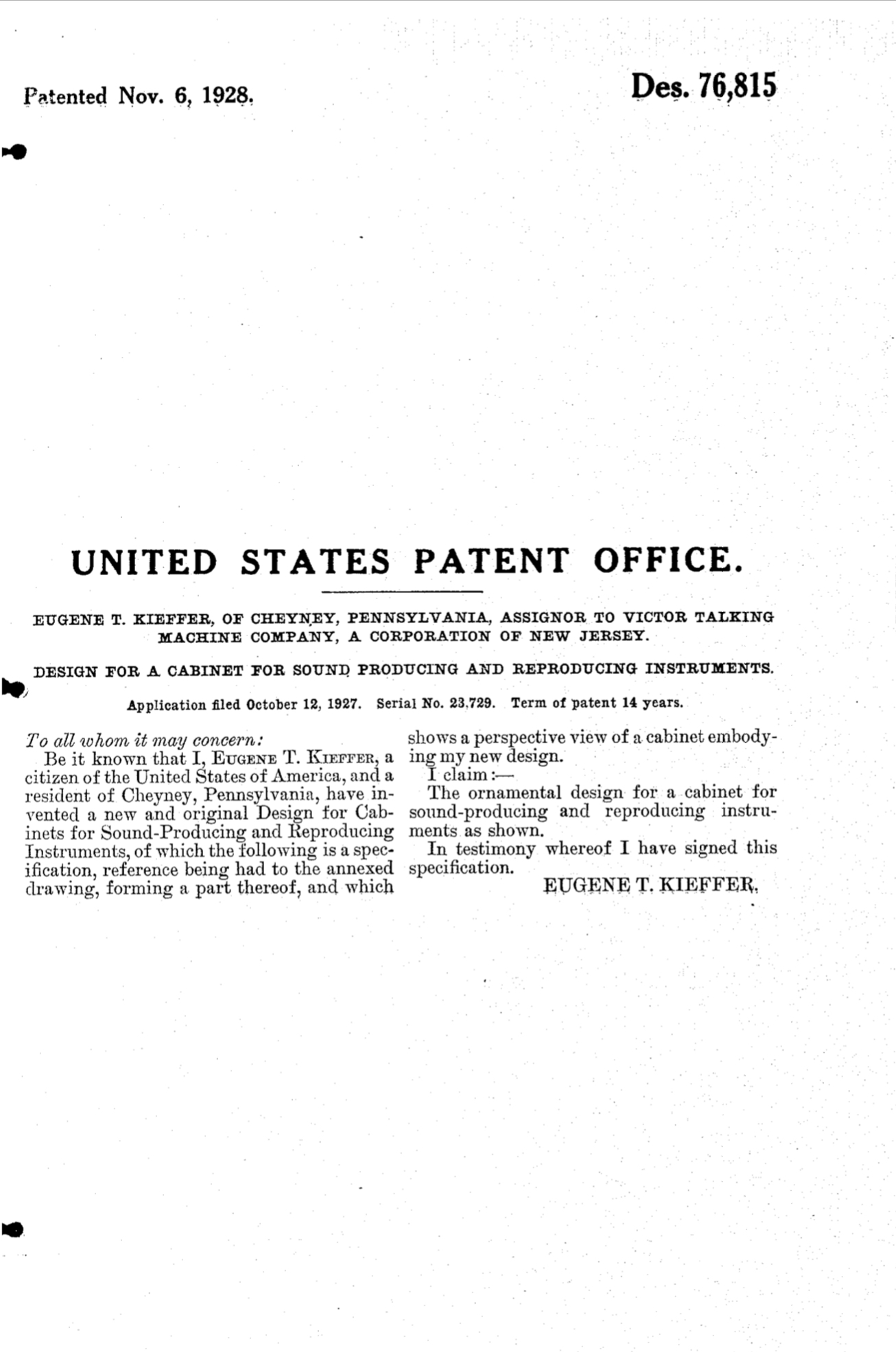 Here is the Design Patent issued to Eugene Kieffer and assigned to Victor for the four-door Credenza Victrola cabinet (also 8-30 and 8-60). It is interesting that the Design Patent application was filed in late 1927 when the machines were already well in production. The patent was issued a year later in November 1928 and by this time the design was obsolete. Perhaps it was done to prevent competitors from making look-a-likes.