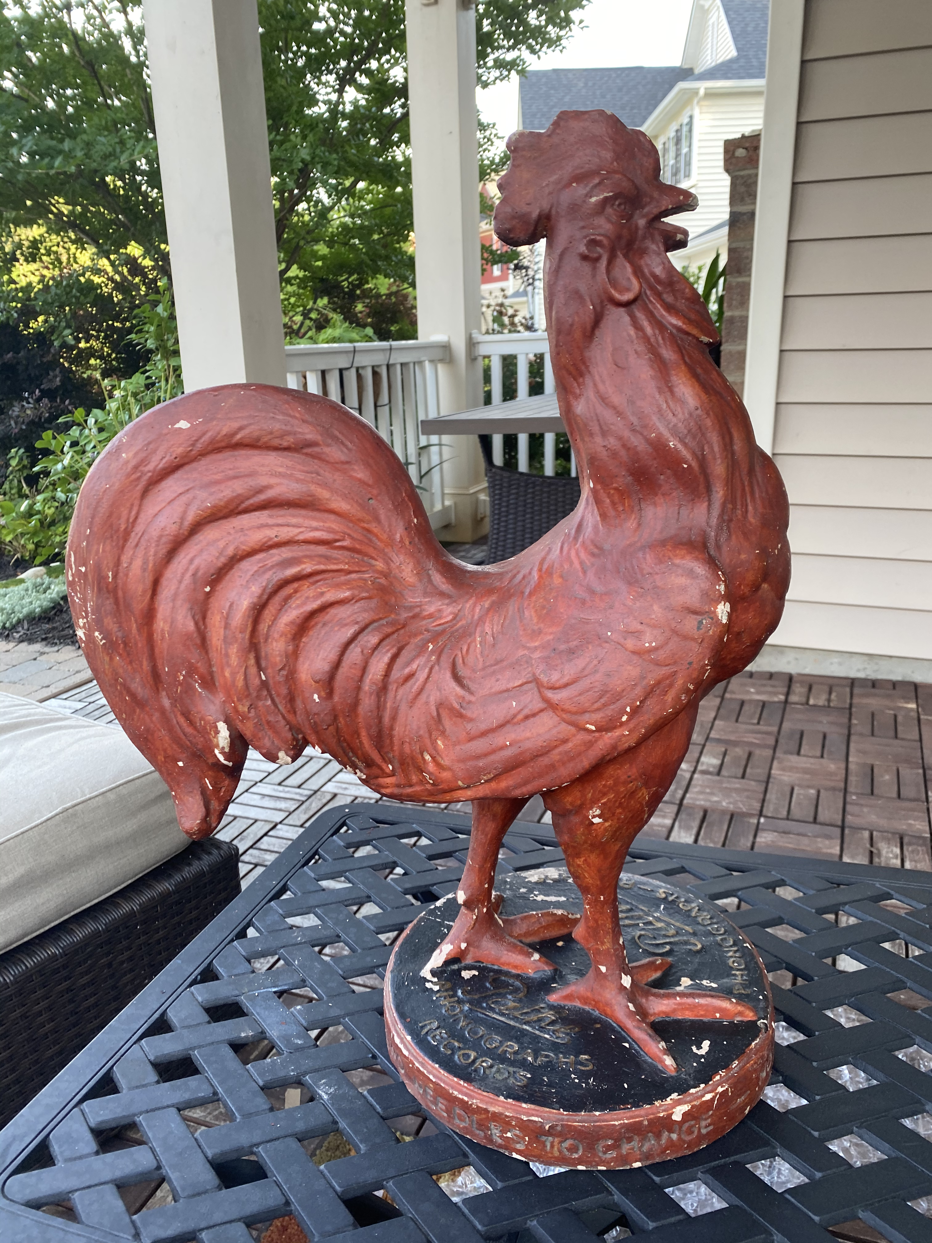 I don't know if Pathé used plaster rooster store displays in Europe, but they probably decided to use them in the U.S. to compete with Victor's store display logo - Nipper...