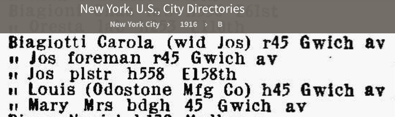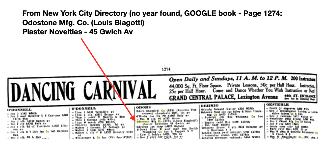 From info gathered from the 1916 New York City Directory, Louis Biagotti is listed at 45 Greenwich Ave., along with Odostone Mfg. Co. makers of "Plaster Novelties". His brother is also listed as a "plasterer". The word odostone apparently refers to ground sea shells/oyster shells, which was probably used to make plaster and would have been an abundant, free source of material.