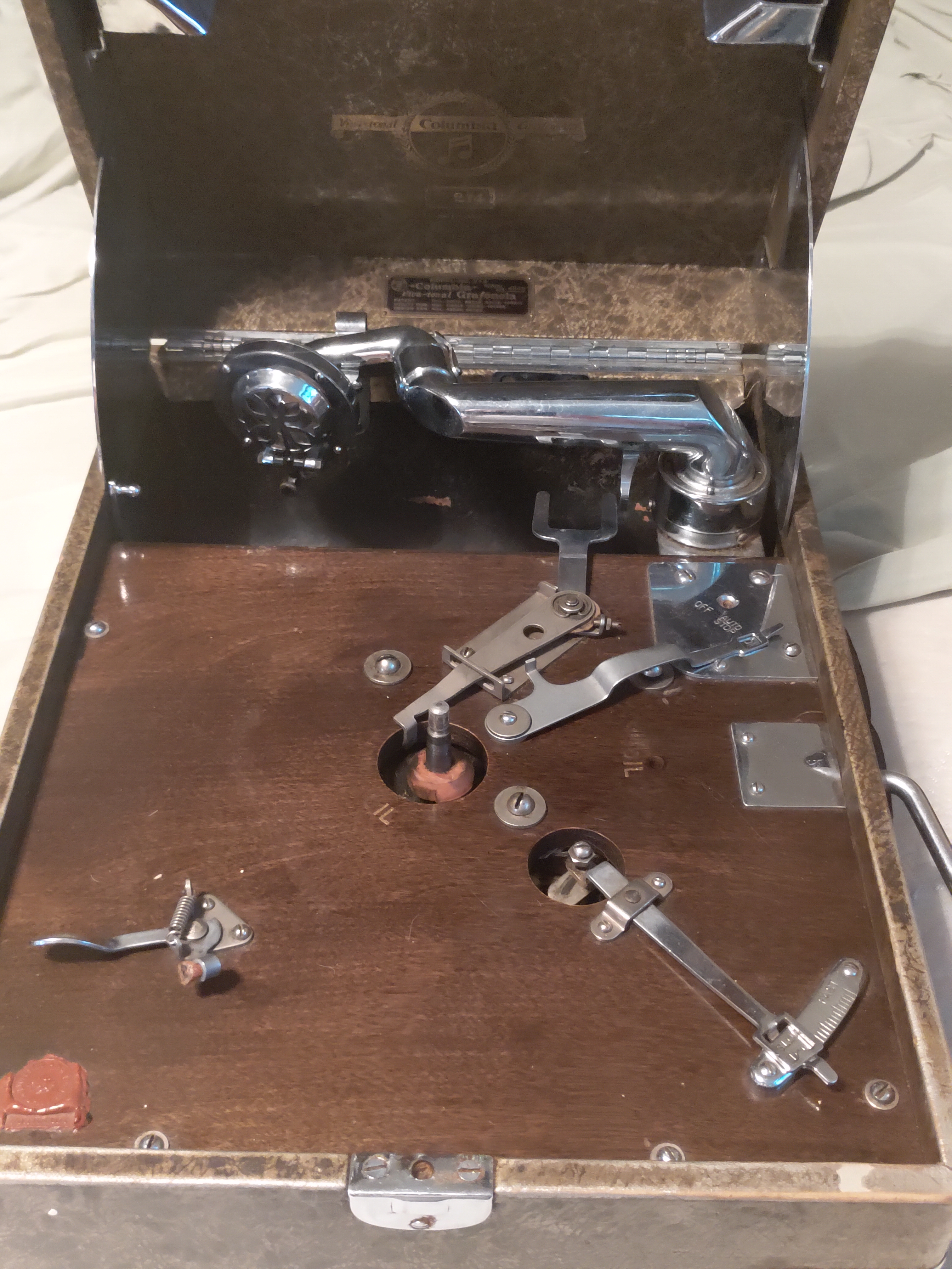 Looking back at that thread, in which I posted a photo of my 113, I see that apart from the covering material, it is identical to your 114. I can't imagine that a different model number would have been given just because of that, so it will be interesting to see what motor is fitted to yours, single or double spring?nostalgia wrote: Thu Jun 17, 2021 3:10 am I believe the machine is possibly a 1937 model, at least that is what I was able to find out when listing the model in the general Japan Columbia thread from March last year: viewtopic.php?f=11&t=44519&hilit=nippon ... a&start=10