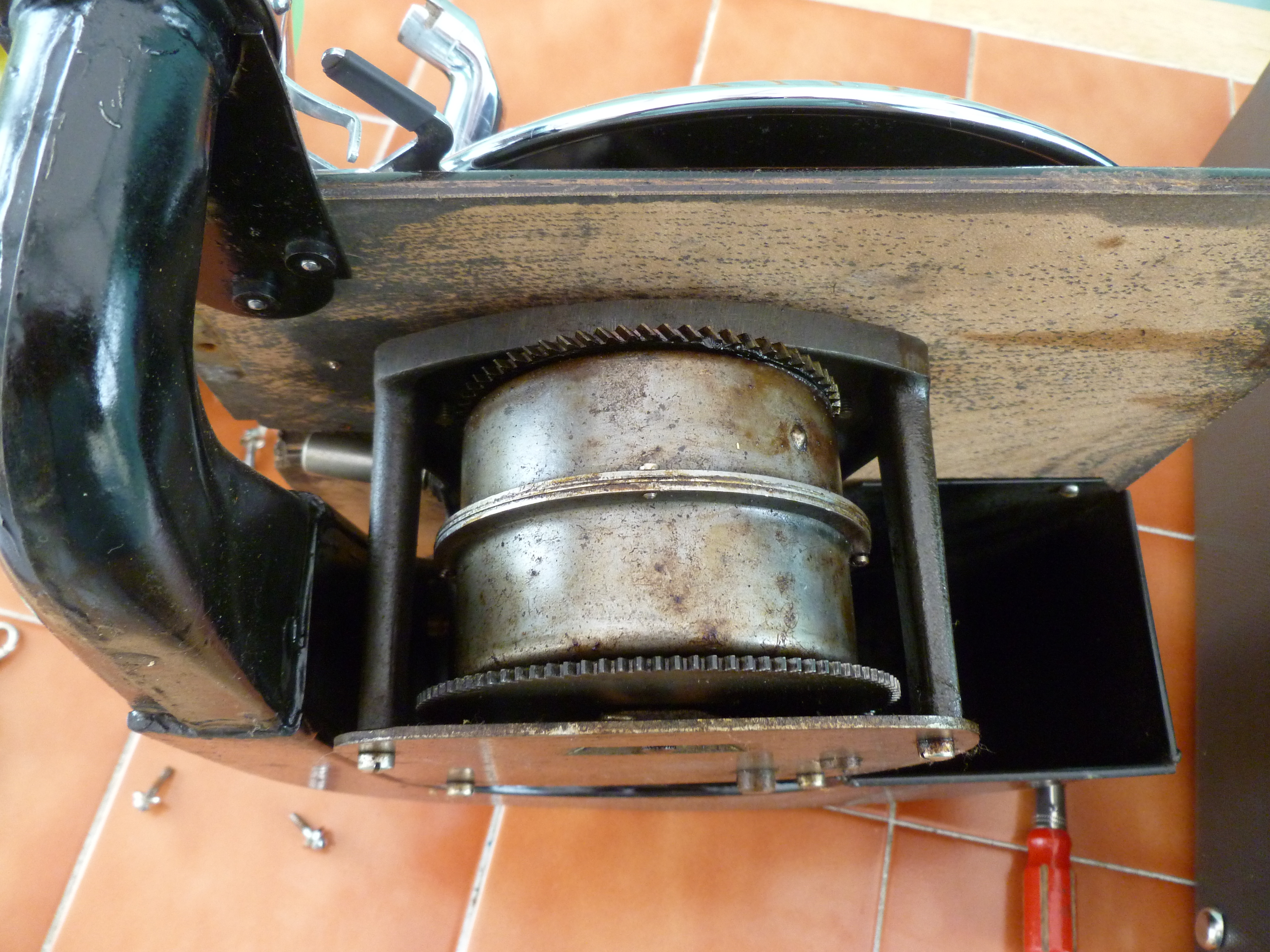 This machine was given to me without the crank, and also has no reproducer. The reproducer is relatively easy to replace, but I can’t get the motor out yet to have a look at it, so the crank end shape eludes me. There are a couple of rusty screws holding down the remains of the motor board that won’t come out, and I will need to soak with penetrating oil to get them free. If one of you could measure the crank, so I can seek out or make a replacement, I would be most grateful. The motor does spin freely, and the arm looks to be in decent shape.