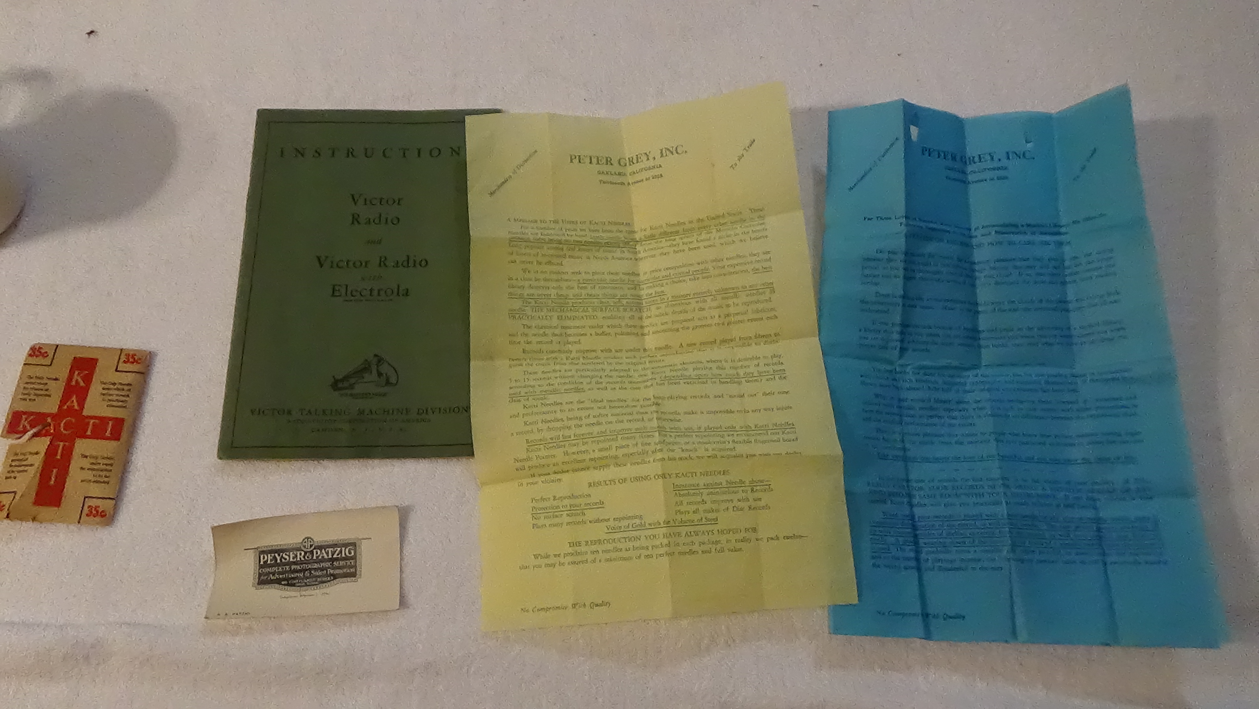 I found all this inside my first classic electric, an RE-45. I am not sure if it was a 1929 or 1930 model as it is made by the Victor Talking Machine Division of the Radio-victor Corporation of America (sic) but anyway to me it is still a "victrola," just one that I don't have to wind.