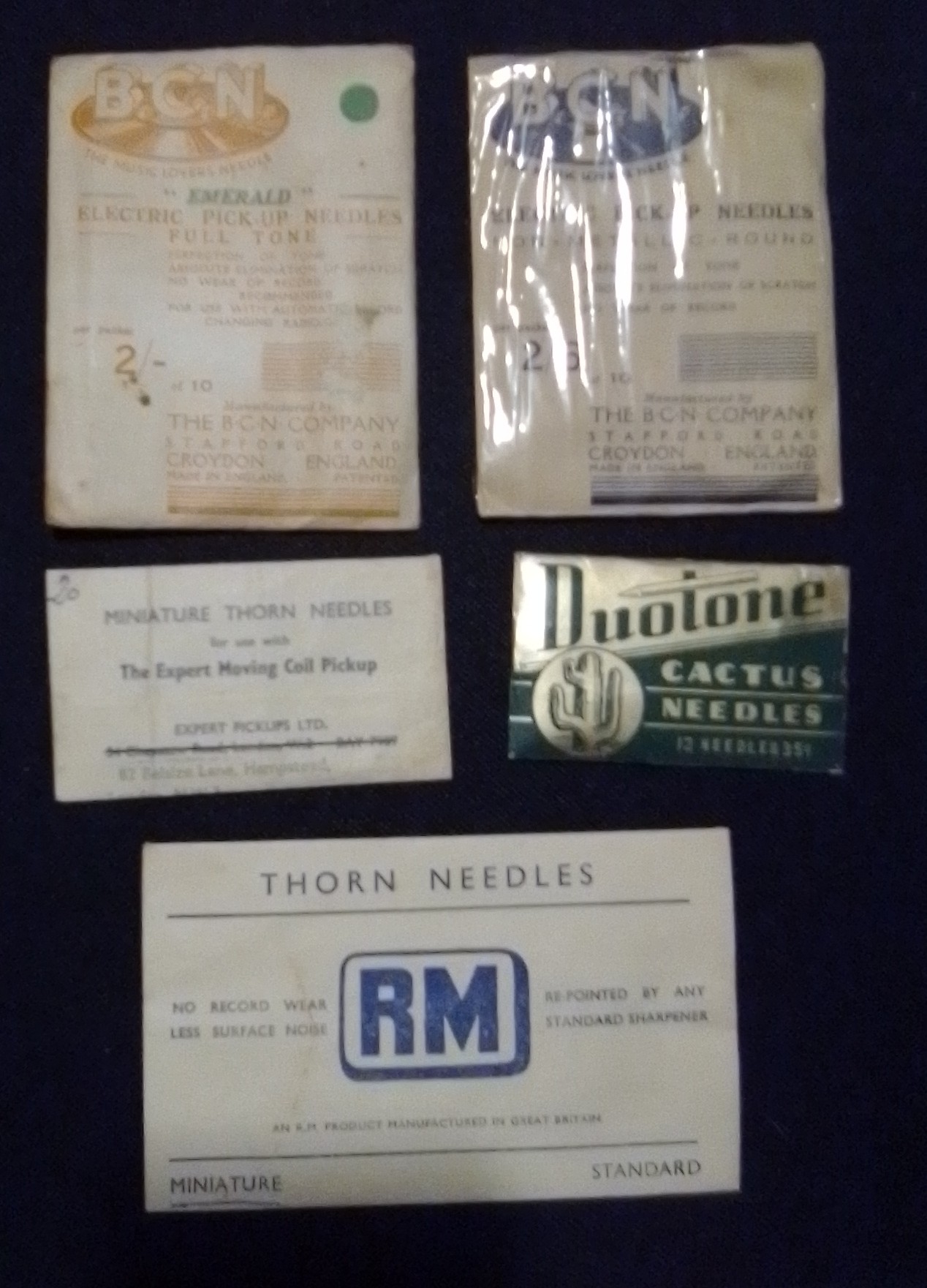 I guess the most unusual of them are the Apollon needles by the Apollon Talking Machine Co Ltd of Tokyo. These are bamboo needles with a turned shaft so they can be used in soundboxes not designed for fibre needles and have a round hole in the needle chuck.