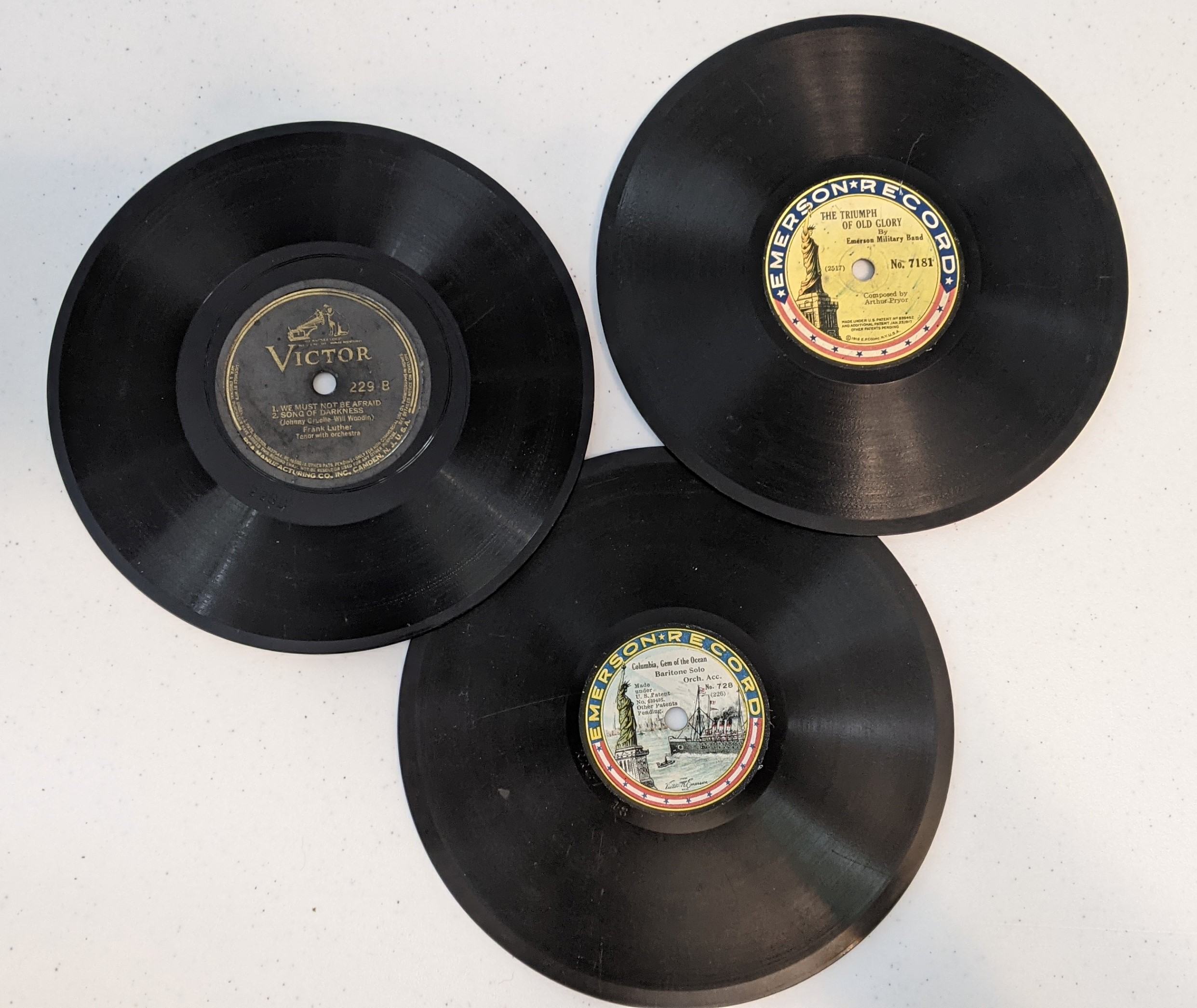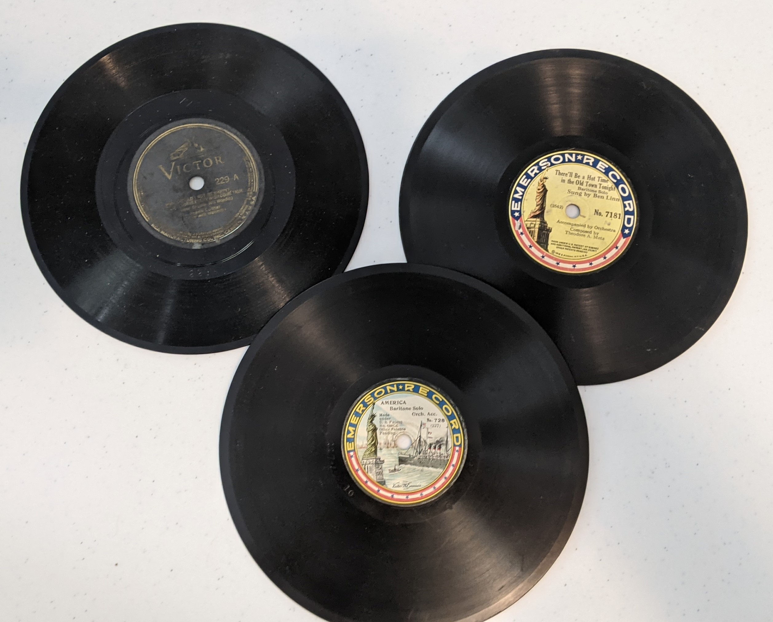 Here we have three seven inch records. Two are Emerson, and one is a very unusual Victor Electric record. All three are double sided, and the pictures show both sides so you can see the actual titles and records. Double click on the pictures to see a large version.
