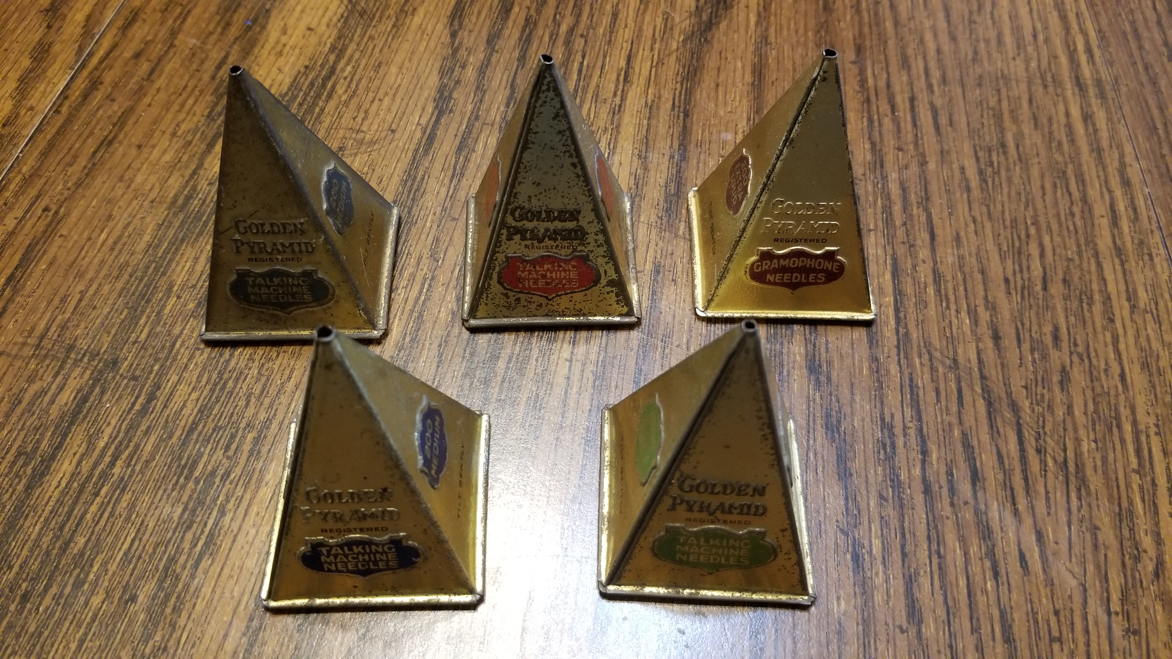 Here are a couple of Golden Pyramid needle tins. Three of them are in very nice condition, and the other 2 were my "B" stock :) All 5 for $60 shipped within the cont. US. PayPal F&F works best.