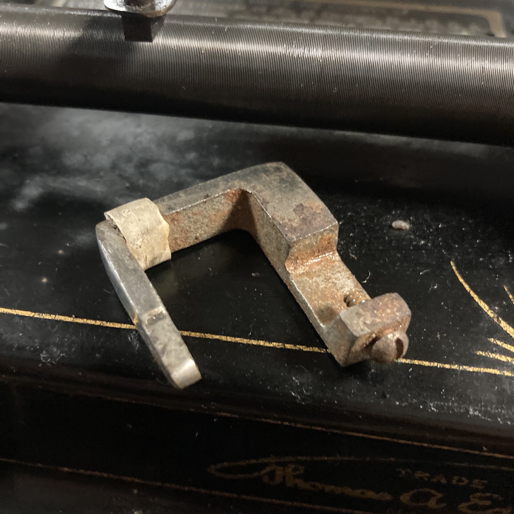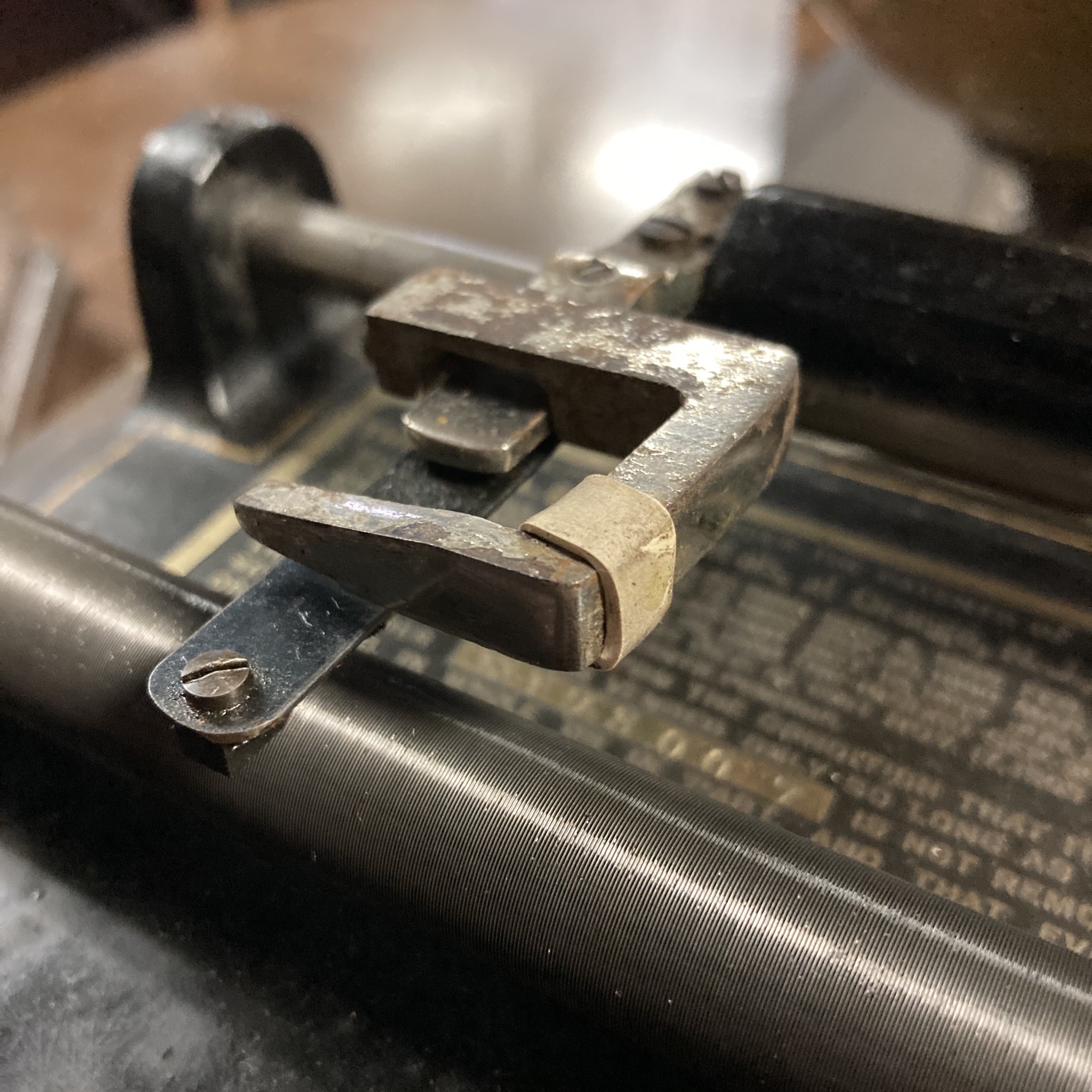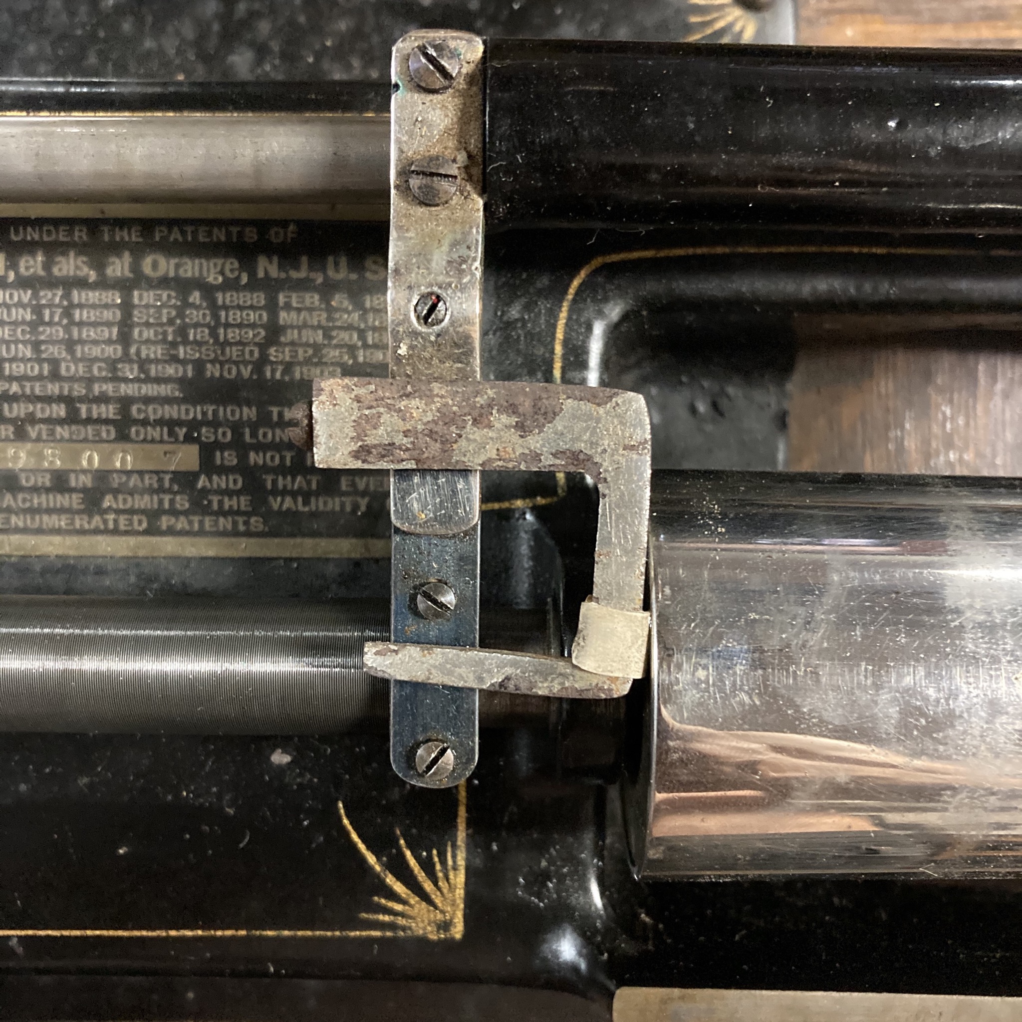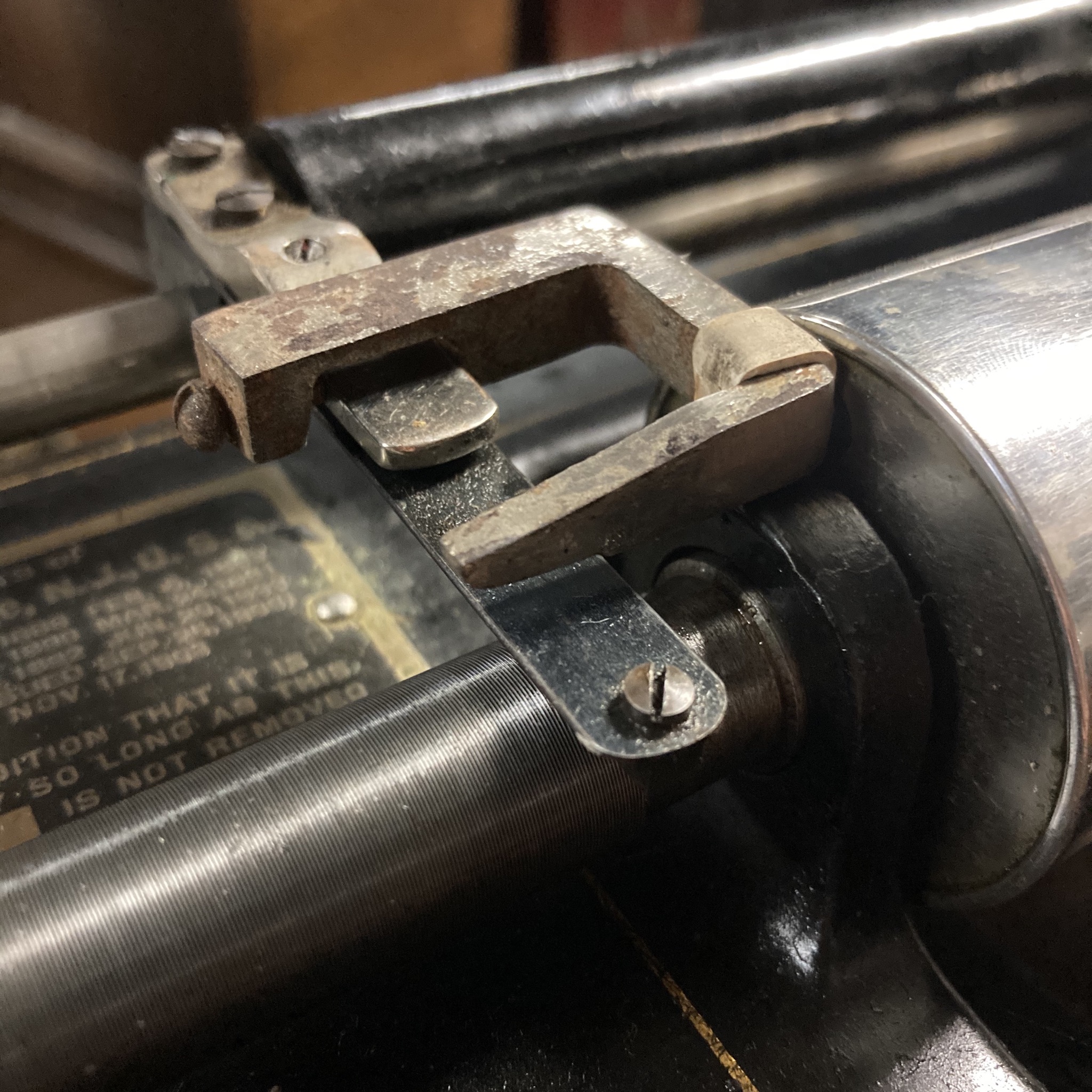 Here is an obscure auto-stop device for the Edison Home cylinder phonograph- a Utica brake, which is a cast piece mounted to the half-nut adjustment bar. When the phonograph is operating and halfnut is tracking the carriage, a section of rubber on the Utica brake will make contact with the mandrel and near instantly stop it from rotating, effectively turning the motor off, bypassing the on/off switch. A clever tool.