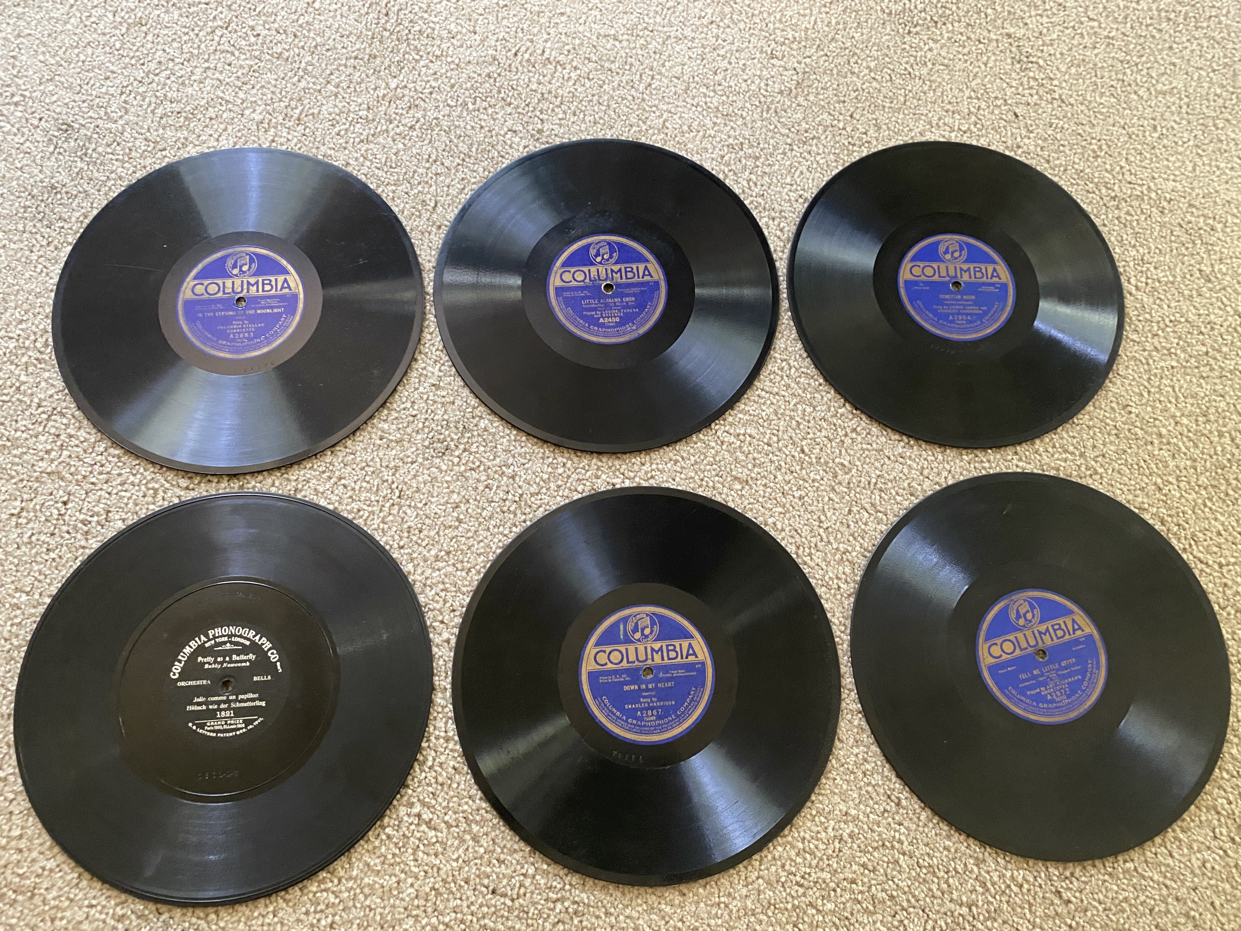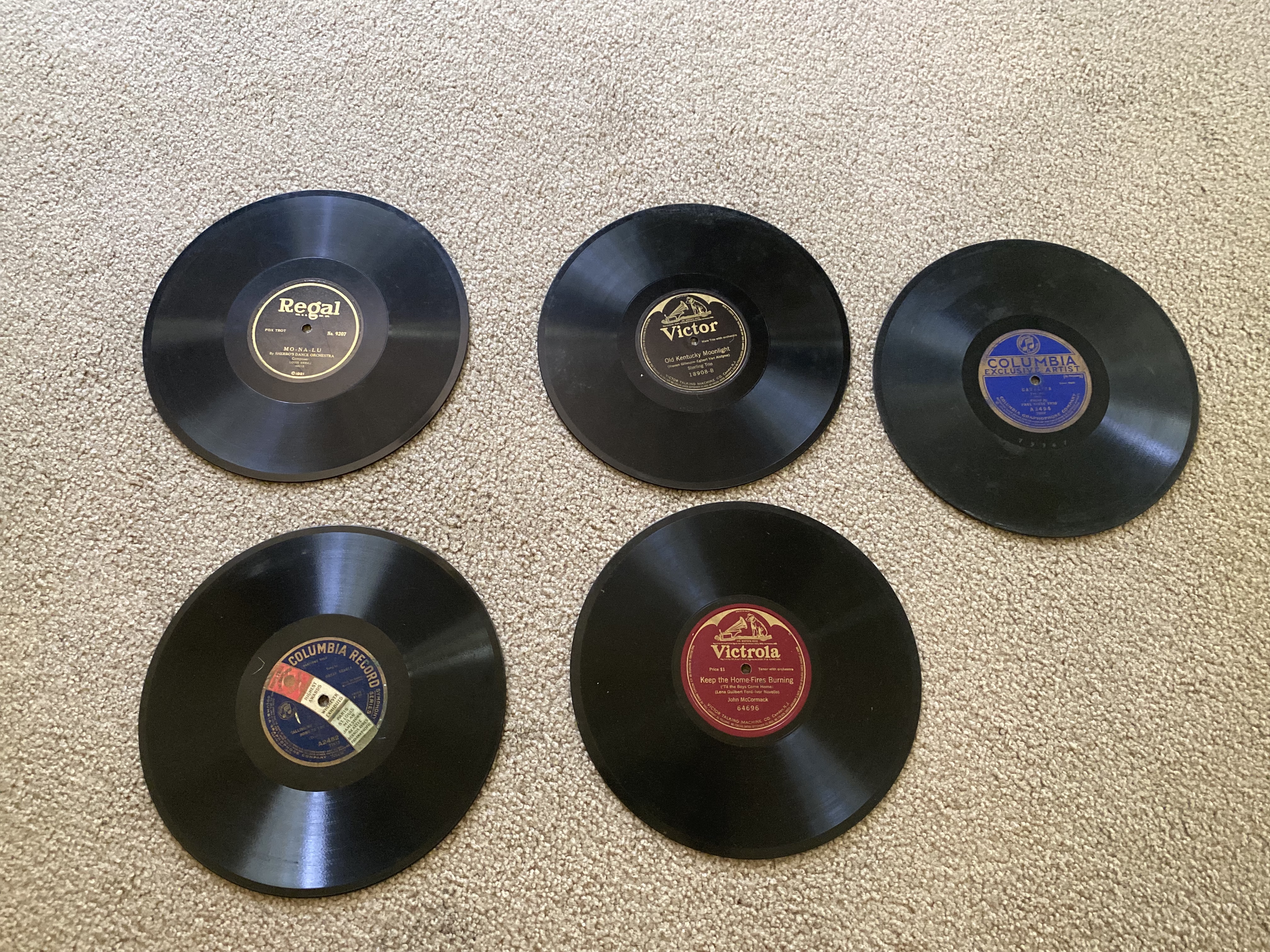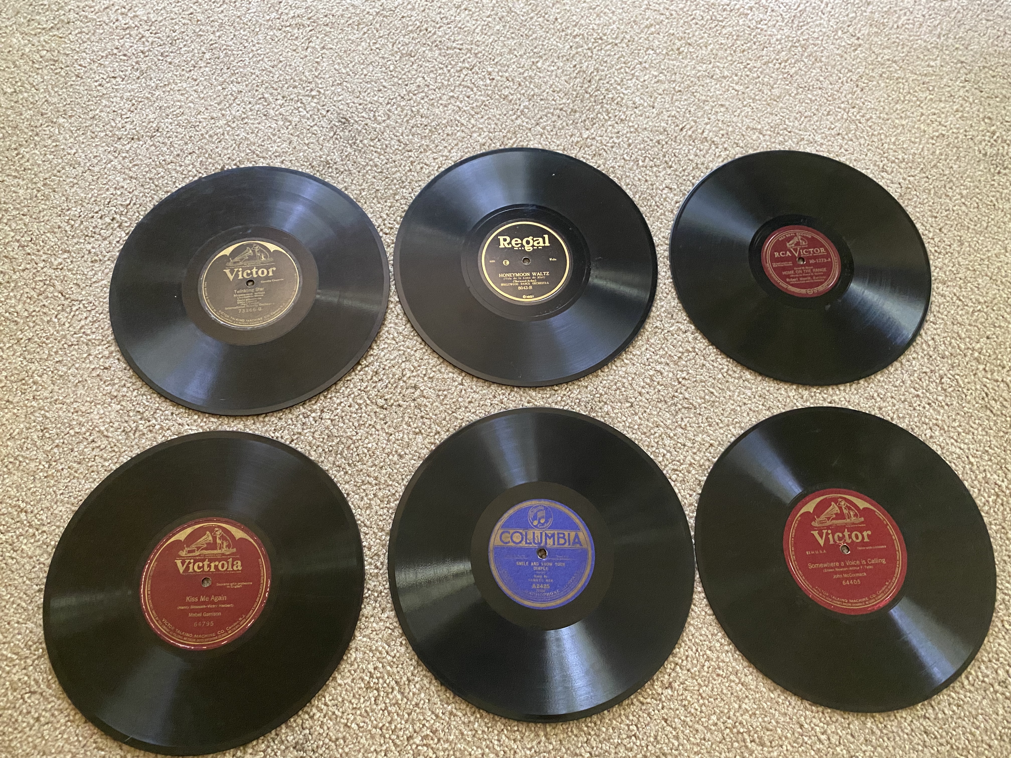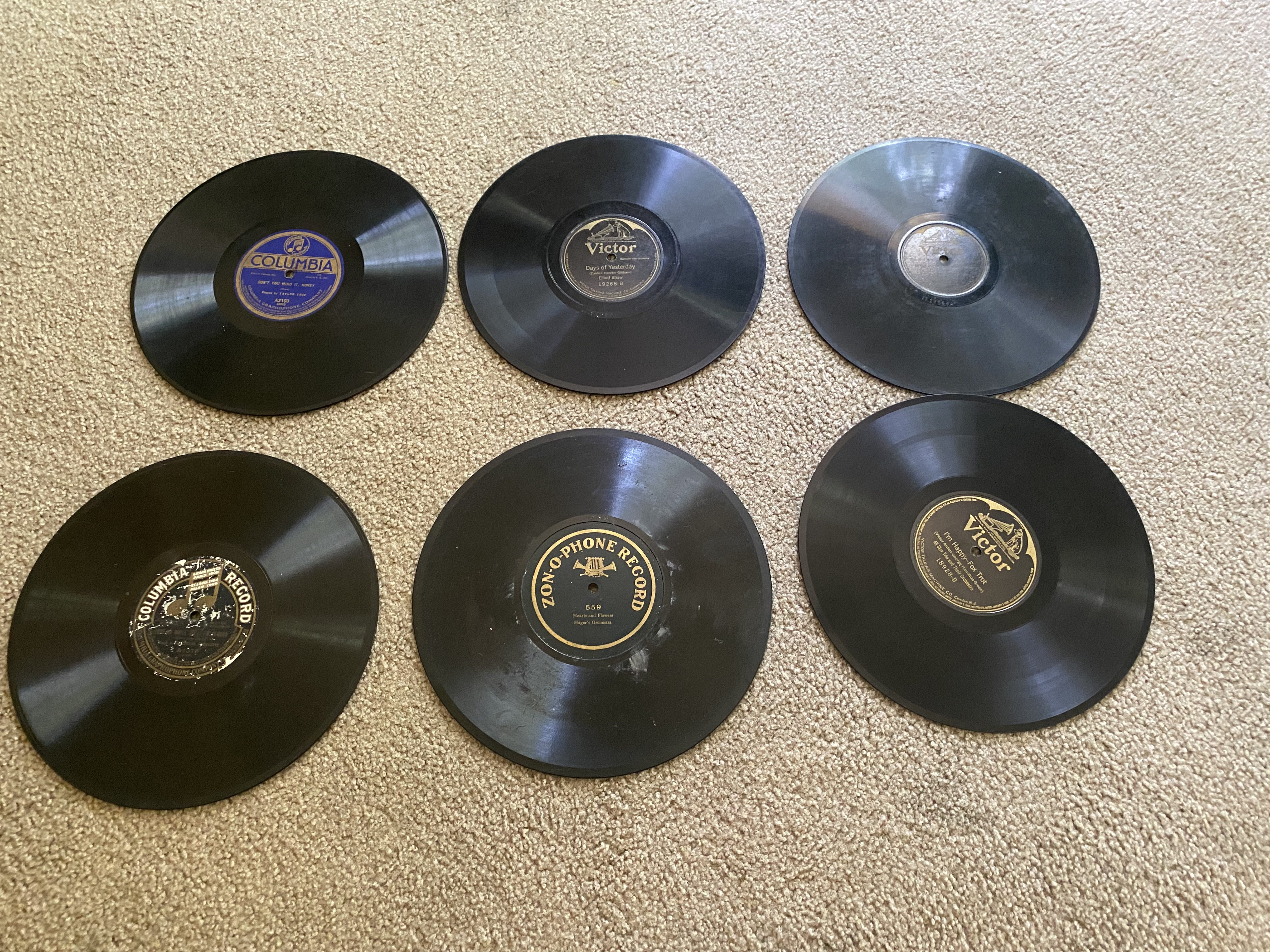 Early 78 rom records, many early labels from 1900’s to 1920’s. Good for the talking machine.