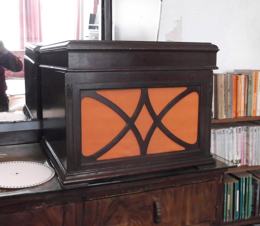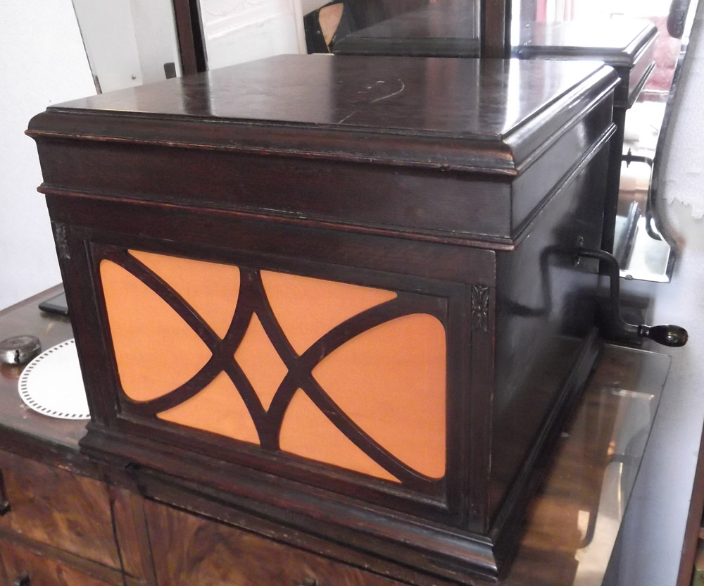 I have often seen the His Master's Voice Model 130 described as the best table gramophone ever made, but this model usually sells for over £200 in Britain and I could not justify the outlay to myself. Recently, however, I found an oak-cased example on eBay for little more than half this price. (The listing did identify the model; I surely cannot have been alone in recognising it from the photographs, but it seems that nobody else who did so was interested enough to bid against me.) The machine, sold by a reputable British charity, was not ideally packed – the box was solid enough, but the machine was free to slide about inside it – and it emerged with the back panel of the lid completely detached and one corner of the case split. Fortunately I have been able to repair most of the damage; there is still a slight gap in the left-hand corner of the lid (that is why the front of the lid is significantly off-centre, as my pictures will show), but once I have remedied this I will have a very fair-looking machine apart from the dreadful carrot-coloured grille-cloth and some rather vicious gouges on the top. The motor and sound-box (this being a 5B and so presumably a later substitute) are both excellent, and the machine has fully justified its reputation in performance; it is clean, well-balanced and not too loud, and it picks up some deep orchestral tones – soft drum-beats and double-bass pizzicati – which I have never been able to hear before; this is exactly what I hoped to find.