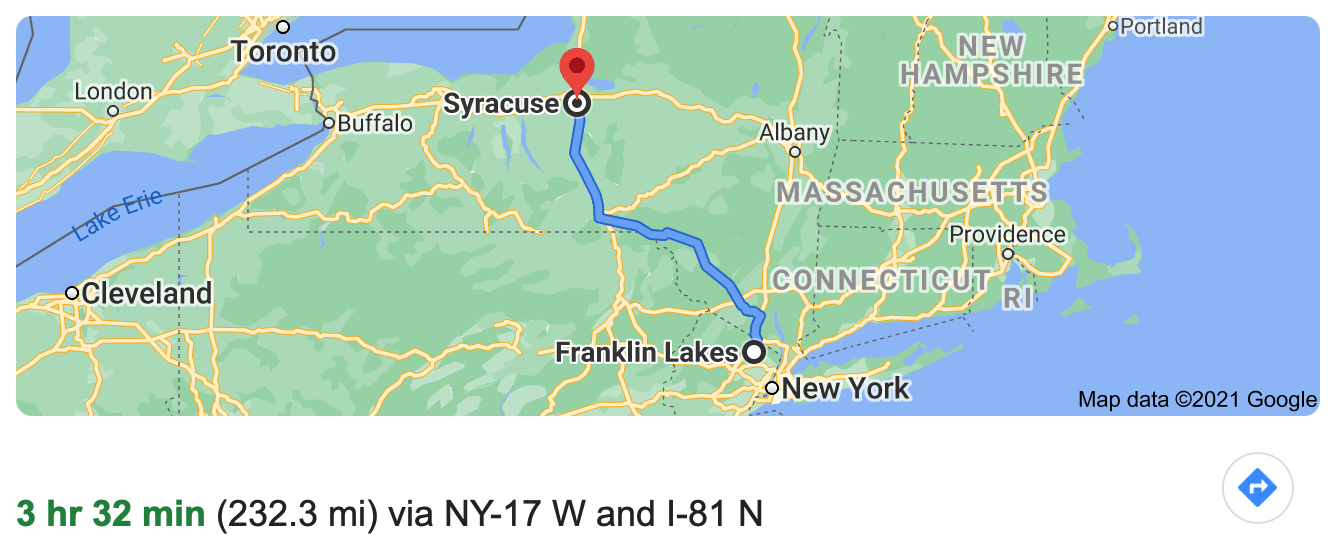 It's in New Jersey, so it could get to Syracuse without too much trouble...