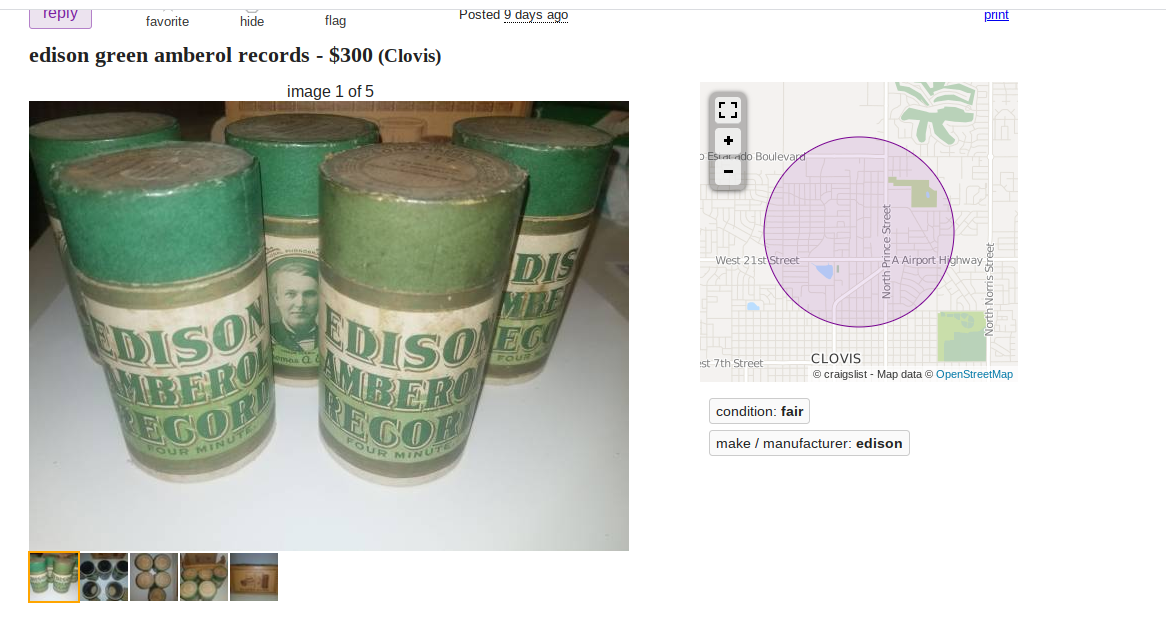 Craigslist ad from Clovis, New Mexico for 5 Edison cylinders. Not my ad, and I don't know or collect cylinders but thought it was neat coming with the box.