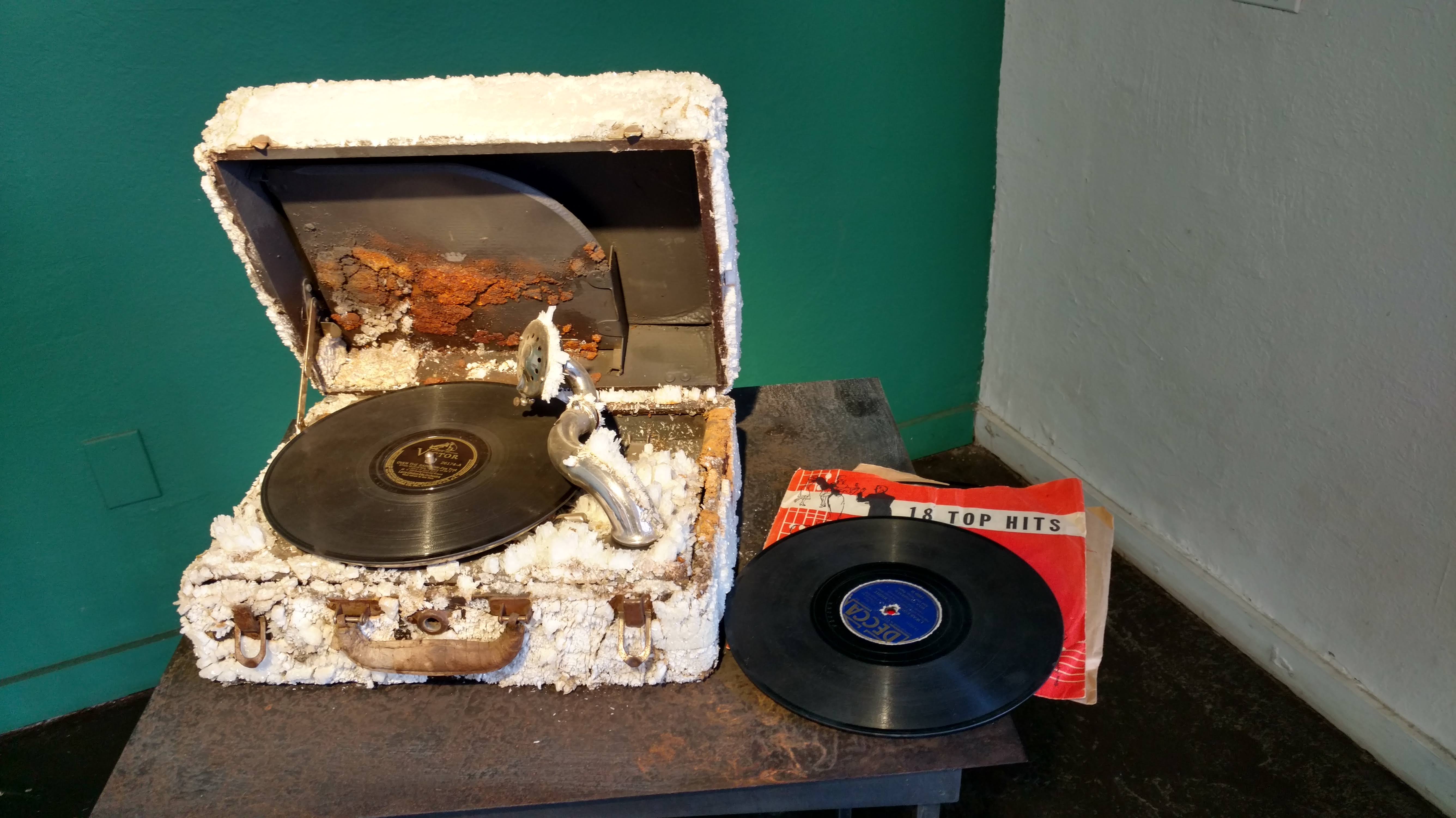 Guy Pederson, an artist in Calistoga, California, creates unusual pieces, often from found objects. One path he takes is to encrust machines by placing them in hot springs to rust and to accumulate mineral deposits. Here is what he did to a a phonograph!