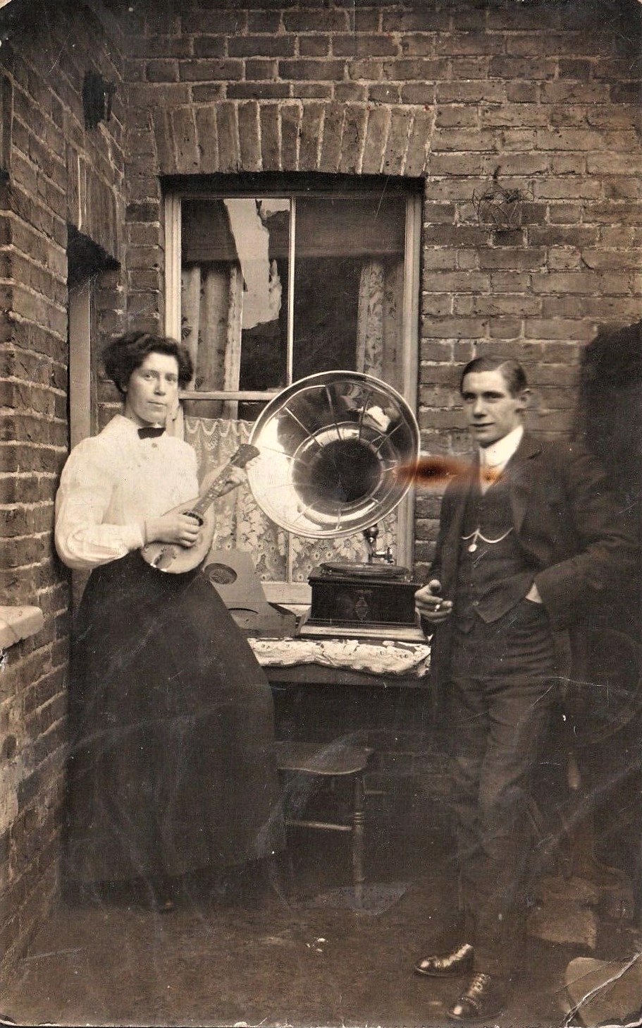 In the time before most people had access to flash photography the best results were obtained outside. This couple have moved the gramophone into the back yard, where the lady is accompanying the record on the mandolin whilst the gentleman, [cigarette] in hand, looks on. For some unknown reason the word "cigarette" has been substituted for the three letter word which I posted.