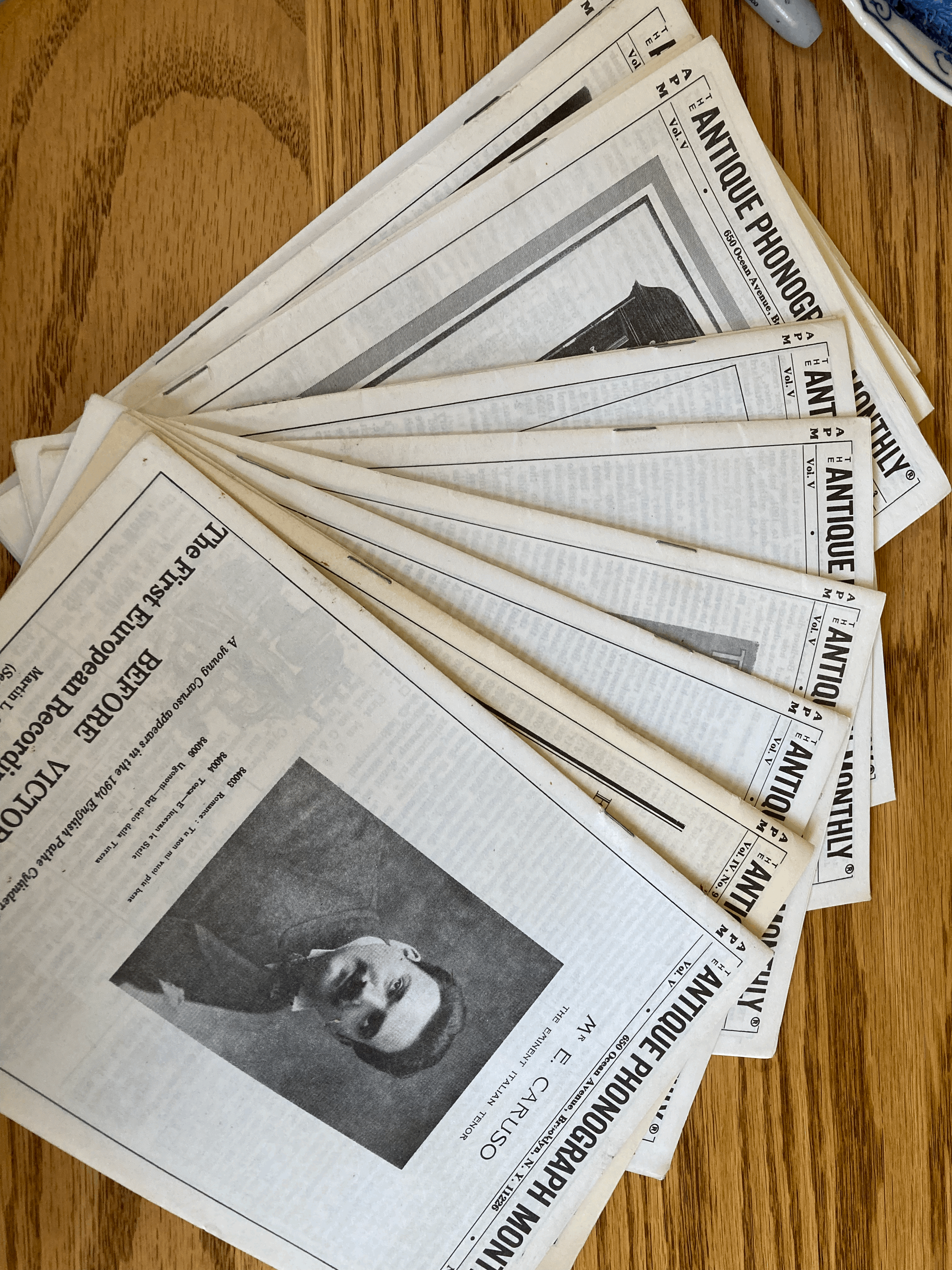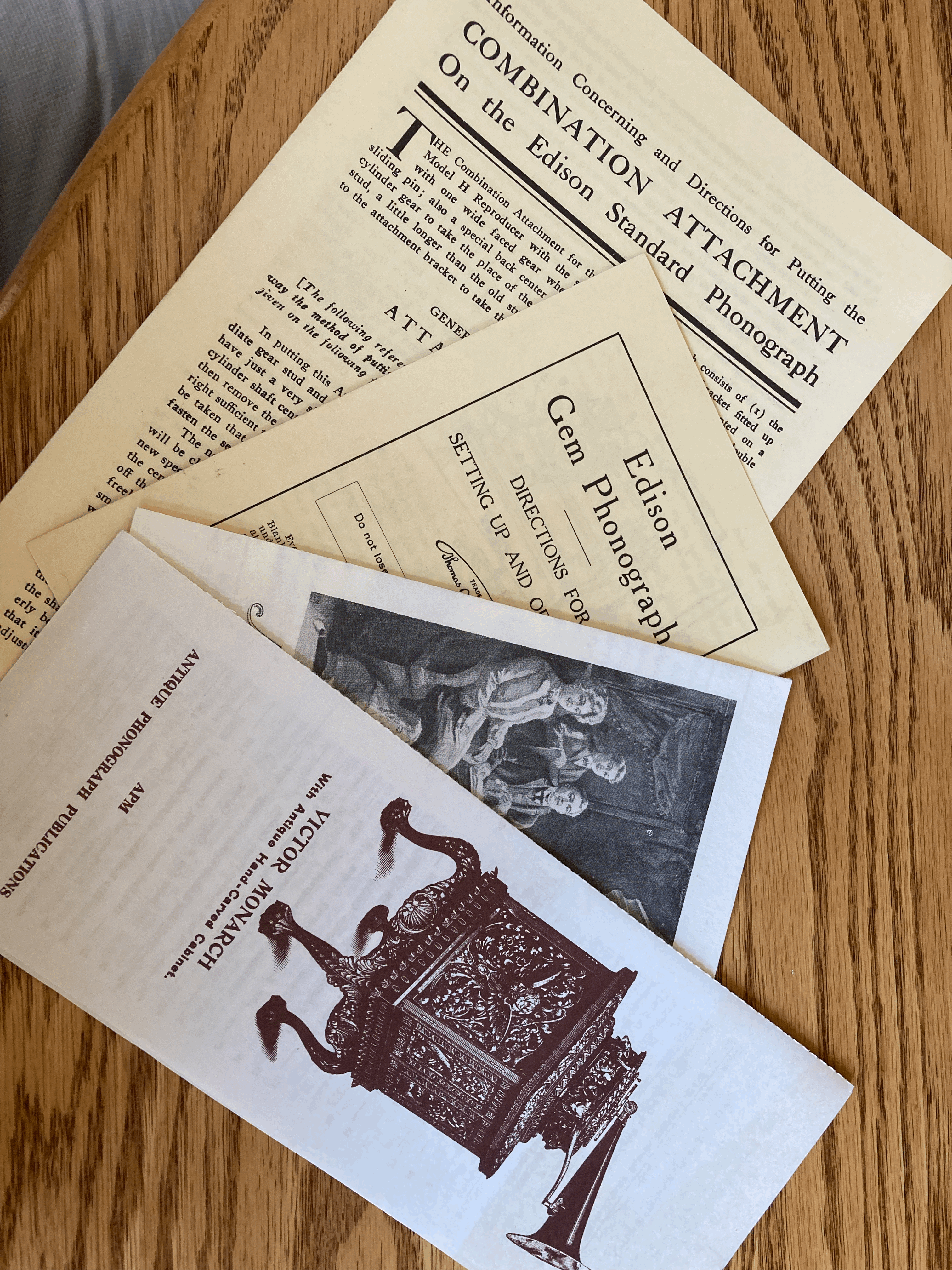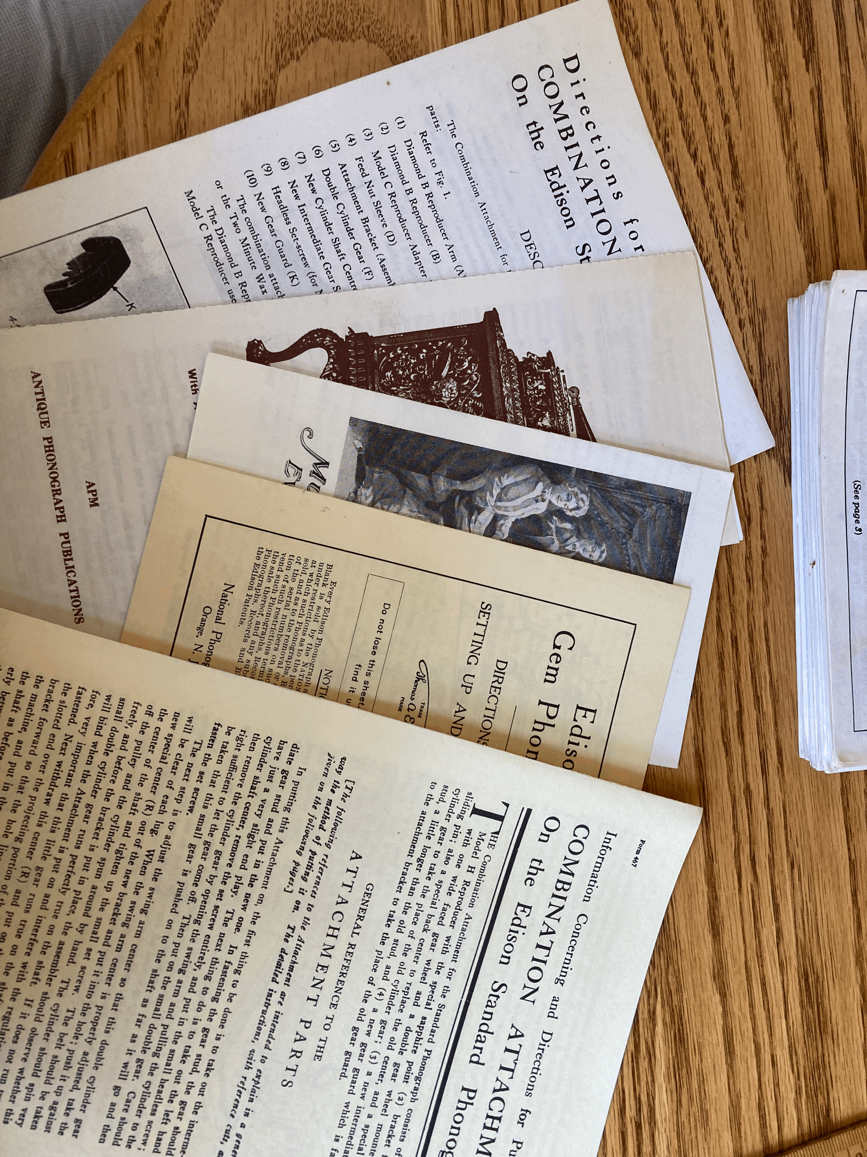 I am selling a good amount of reproduction paper as well as sixteen issues if The Antique Phonograph Monthly. The reproduction paper includes two different directions for installing combination attachments on the Edison Standard, Gem instructions, and a flier for "Music for Every Home."