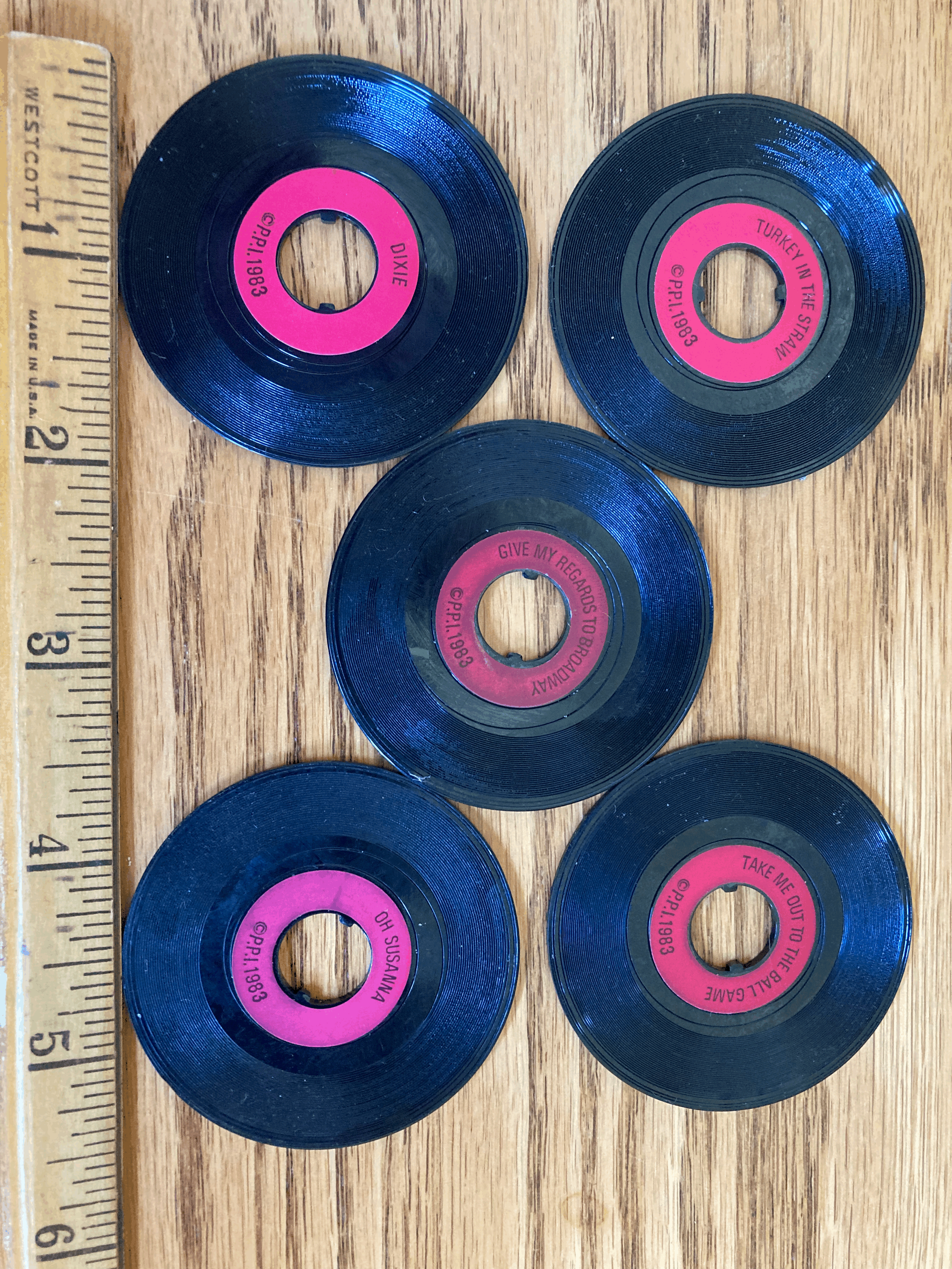 The small records are for the Poynter Toys Old Fashioned Victrola. I have one, bought years ago from a lady from Boca Raton FLA. I believe it came with six of these records. Mine has an extra one (repeated). They sound as played by a banjo...