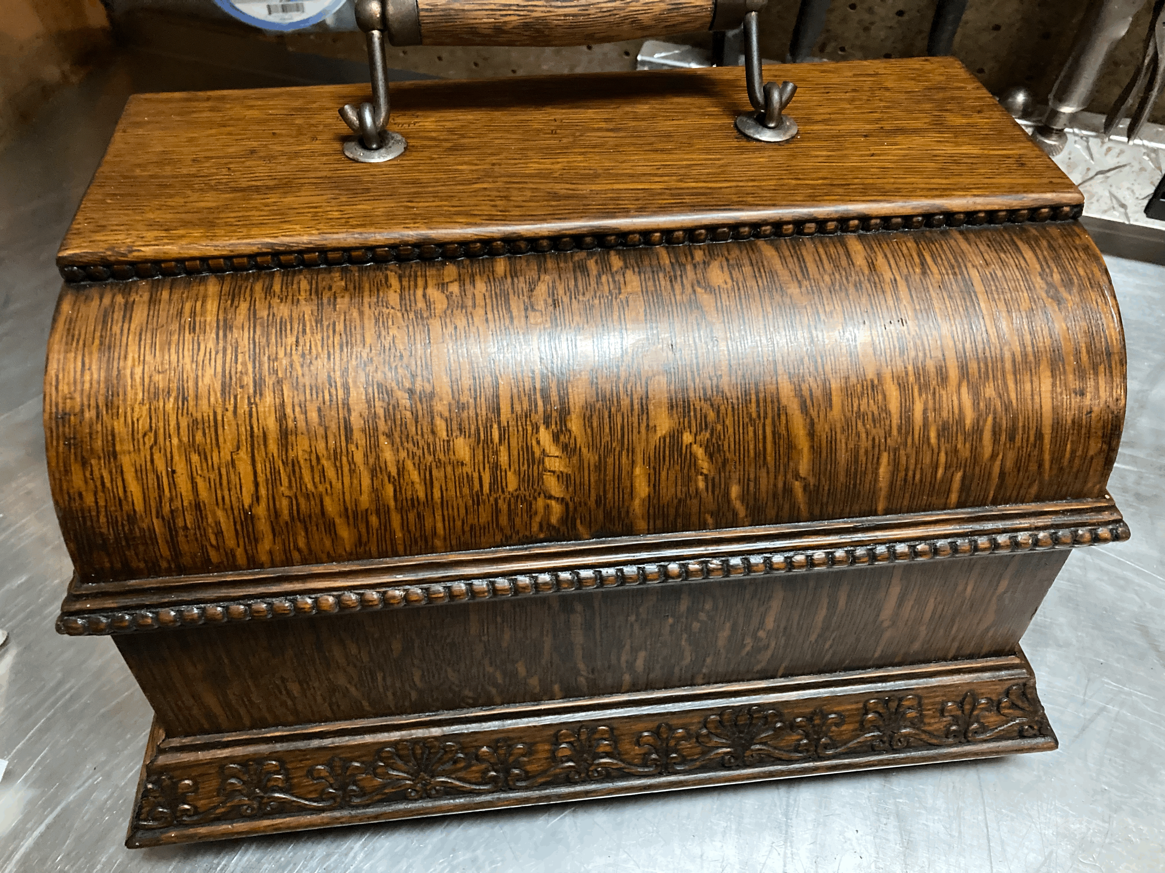 I clean cabinets with Goop or GoJo. For a light cleaning I apply the cleaner with a rag. But I frequently use 0000 steel wool that is soaked with cleaner. It seems like there are always a few paint specks on a finish. I clean one panel at a time, generally with soaked steel wool, and the cleaner softens the paint speck. I've found that if you disturb a paint speck and go over it again with soaked steel wool the speck is gone. I have a few dental tools that I disturb any specks. The lid for this Columbia AB was freckled with specks and now it looks terrific.