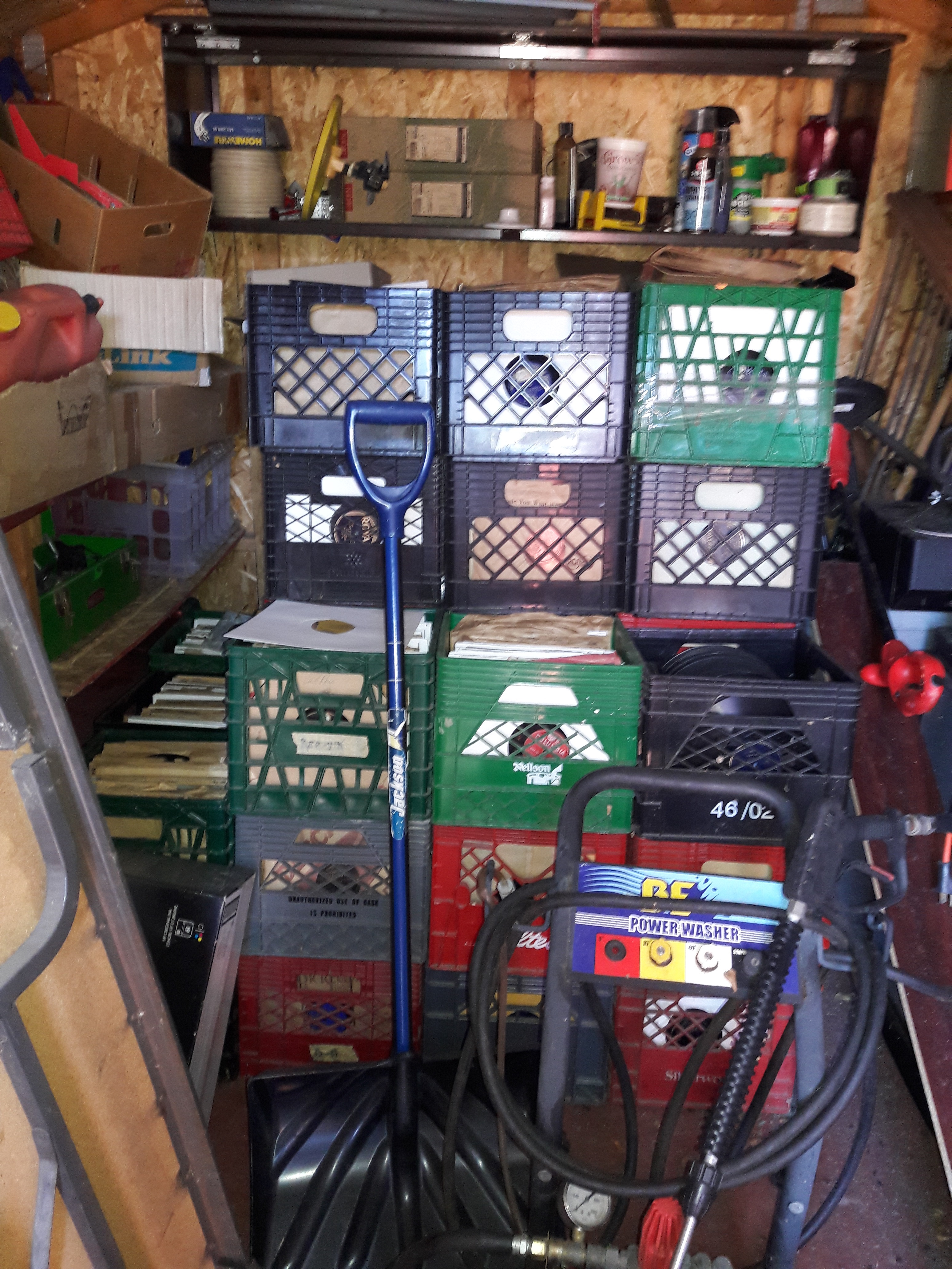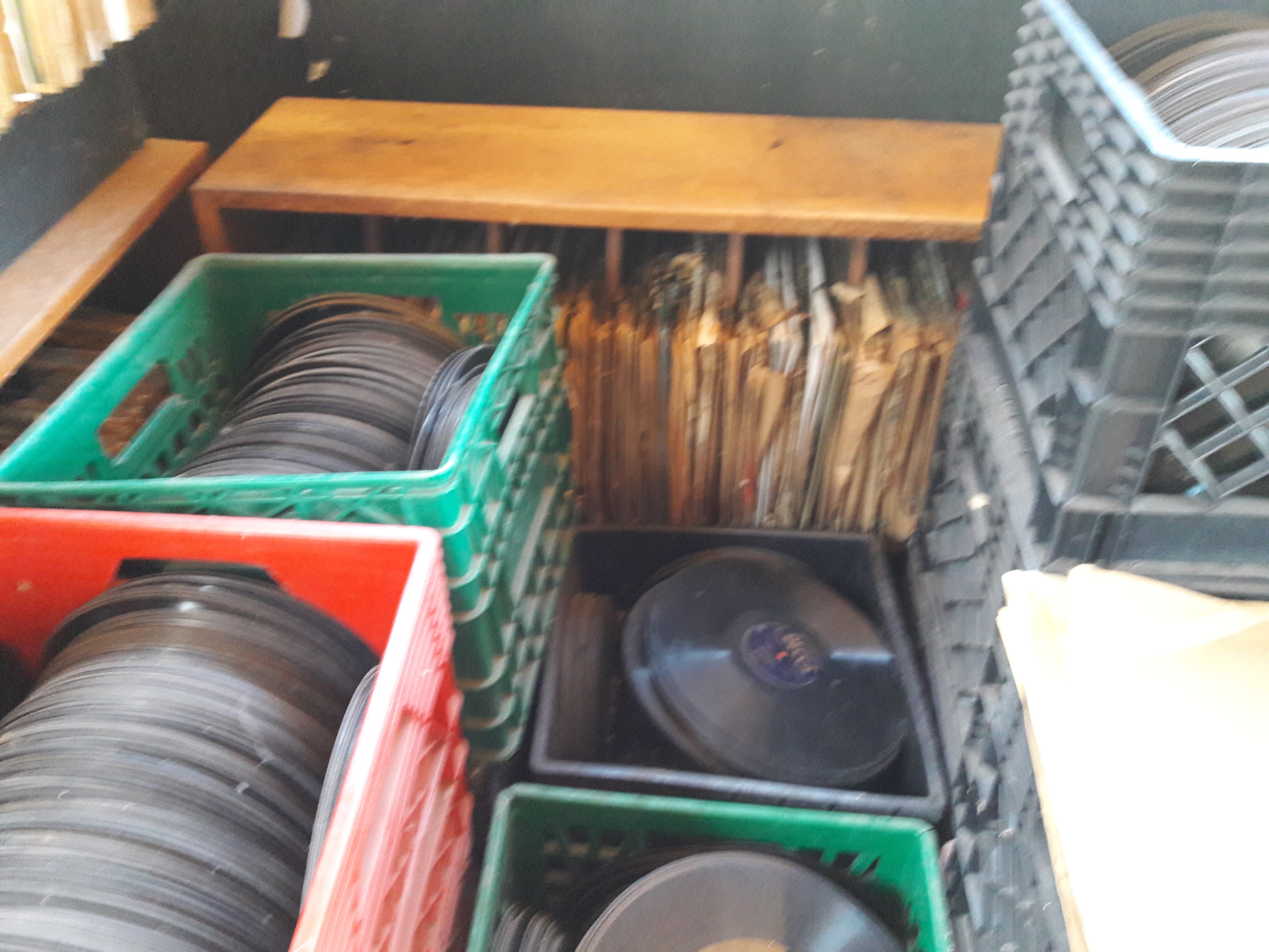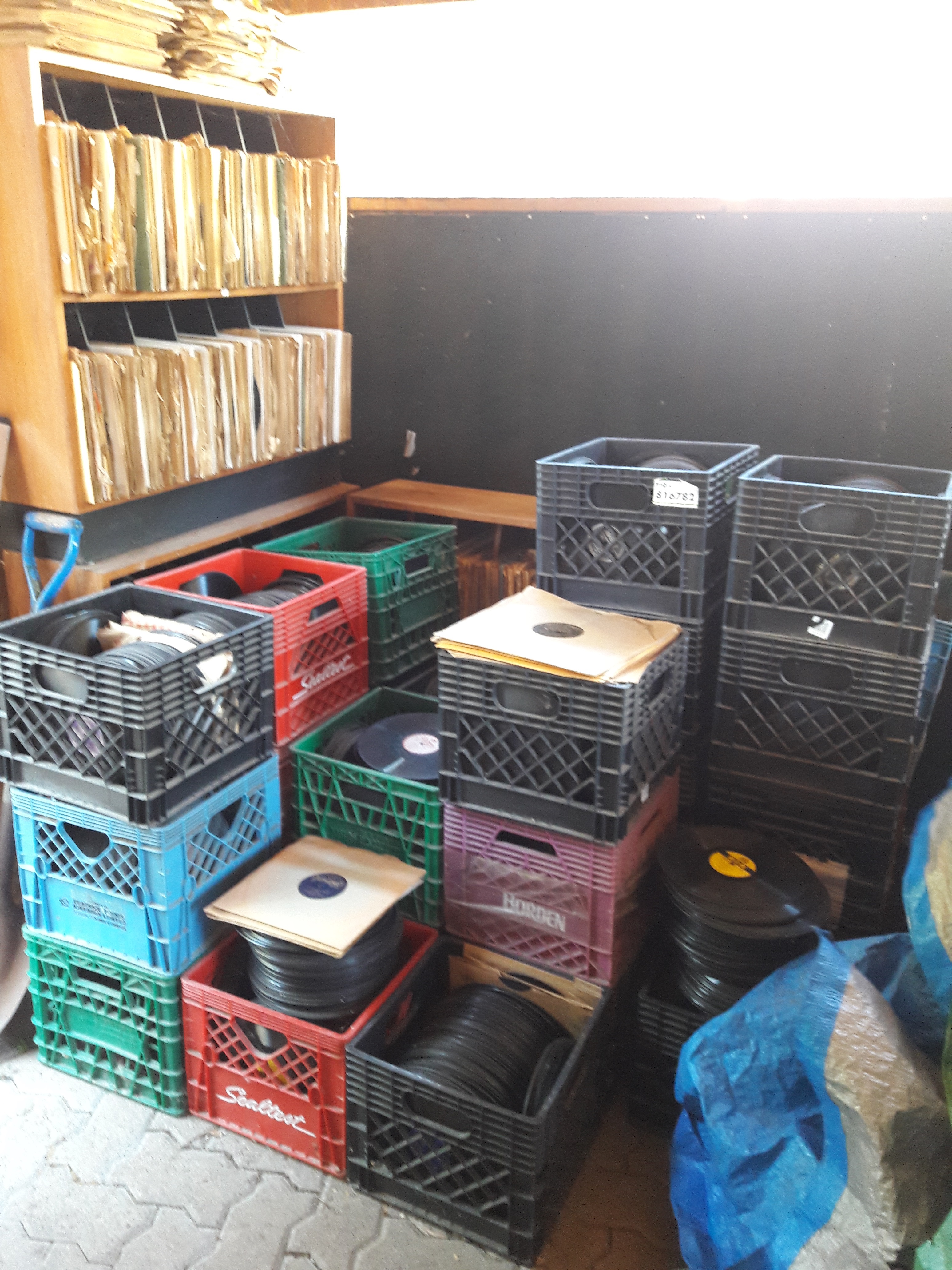 Some of the pictures are deceiving in the volume of discs. The first photo is five milk crates of discs wide with full stacked shelves either side going back some 15 feet with stacked shelves of discs across the back. In between there is only crates of discs as far back as I could see.