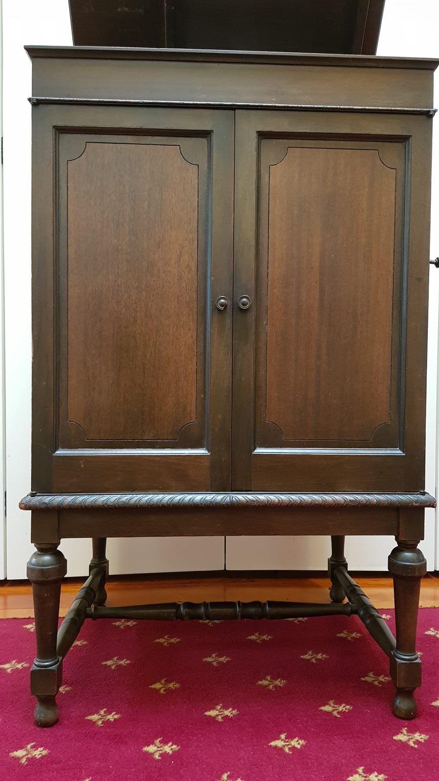 There is one of these available here in N.Z But towards the end of the D/D disc era, these machines were dumped in Australia and in NZ The rise and fall were dumped. The large horn screw down somehow, and the rachet drive removed.. Canablised to some extent! Only made to play 78s Realise D/D horns are much bigger on these. So is the rise and fall, longer. Will need a reproducer also. Never came with no ID tag either. Anybody out there has , parts for one of these? Cabinet appears nice. Or do I need this Misson Impossible, like I need a hole in the head? Cherrio Markie