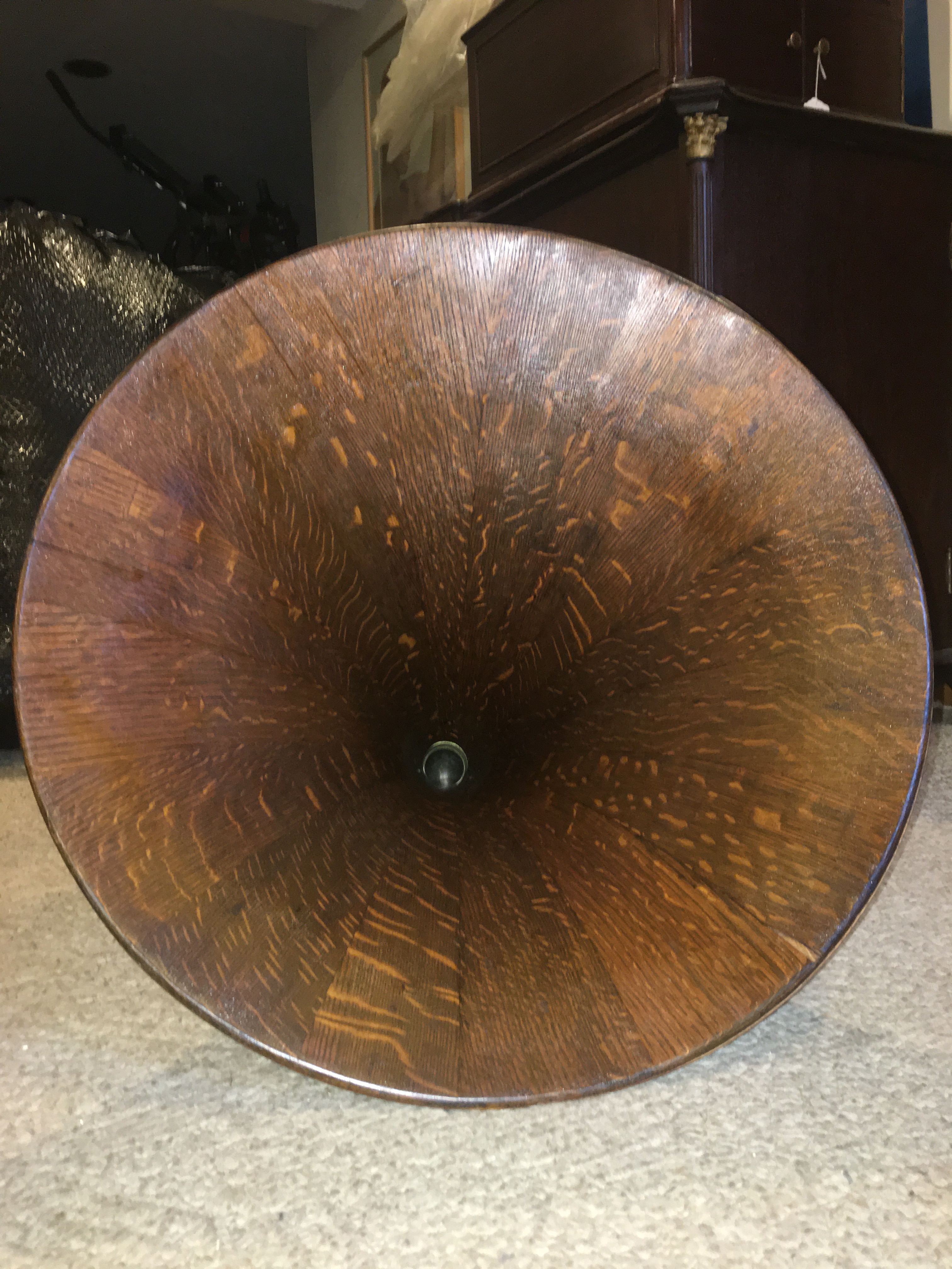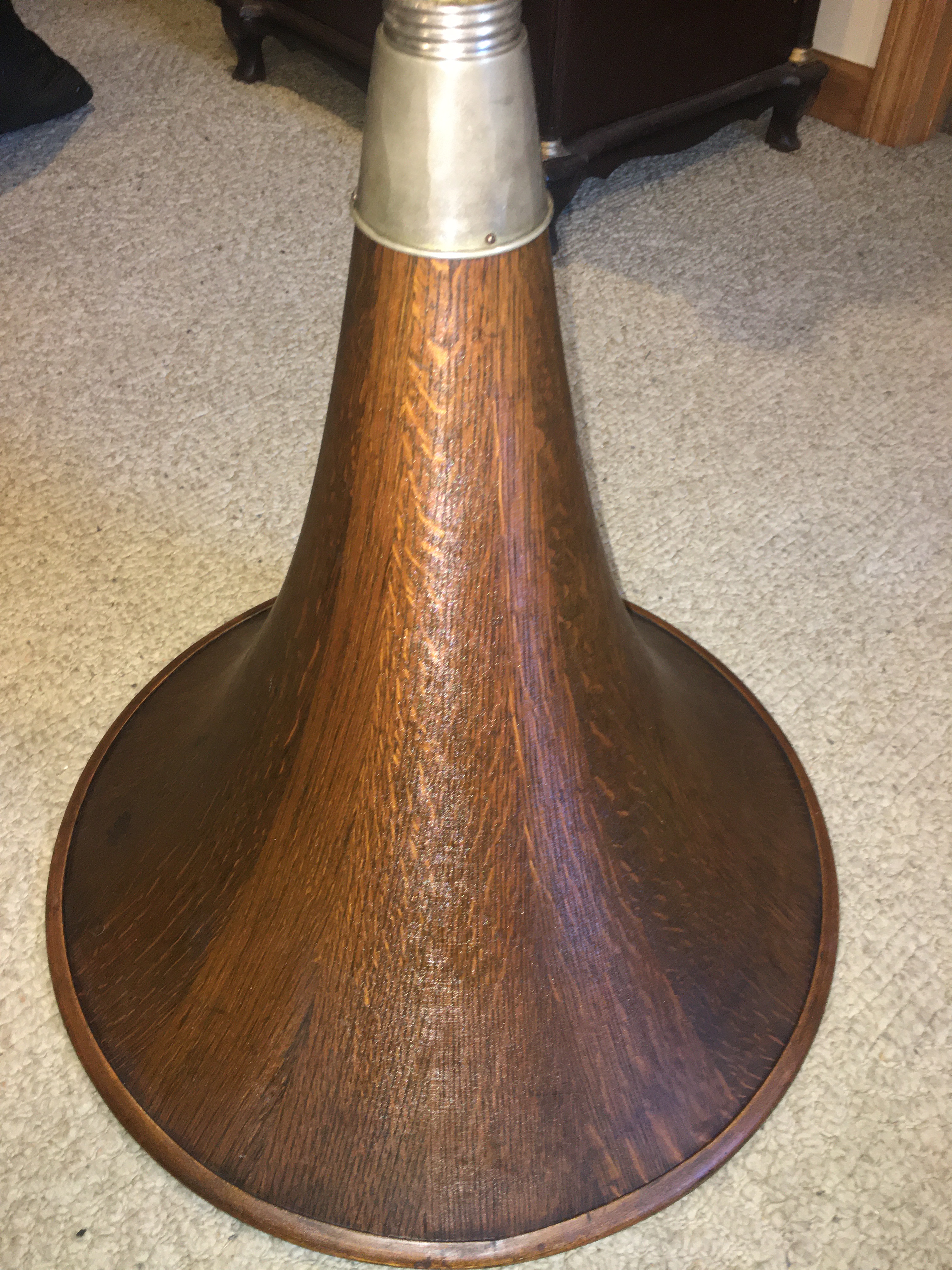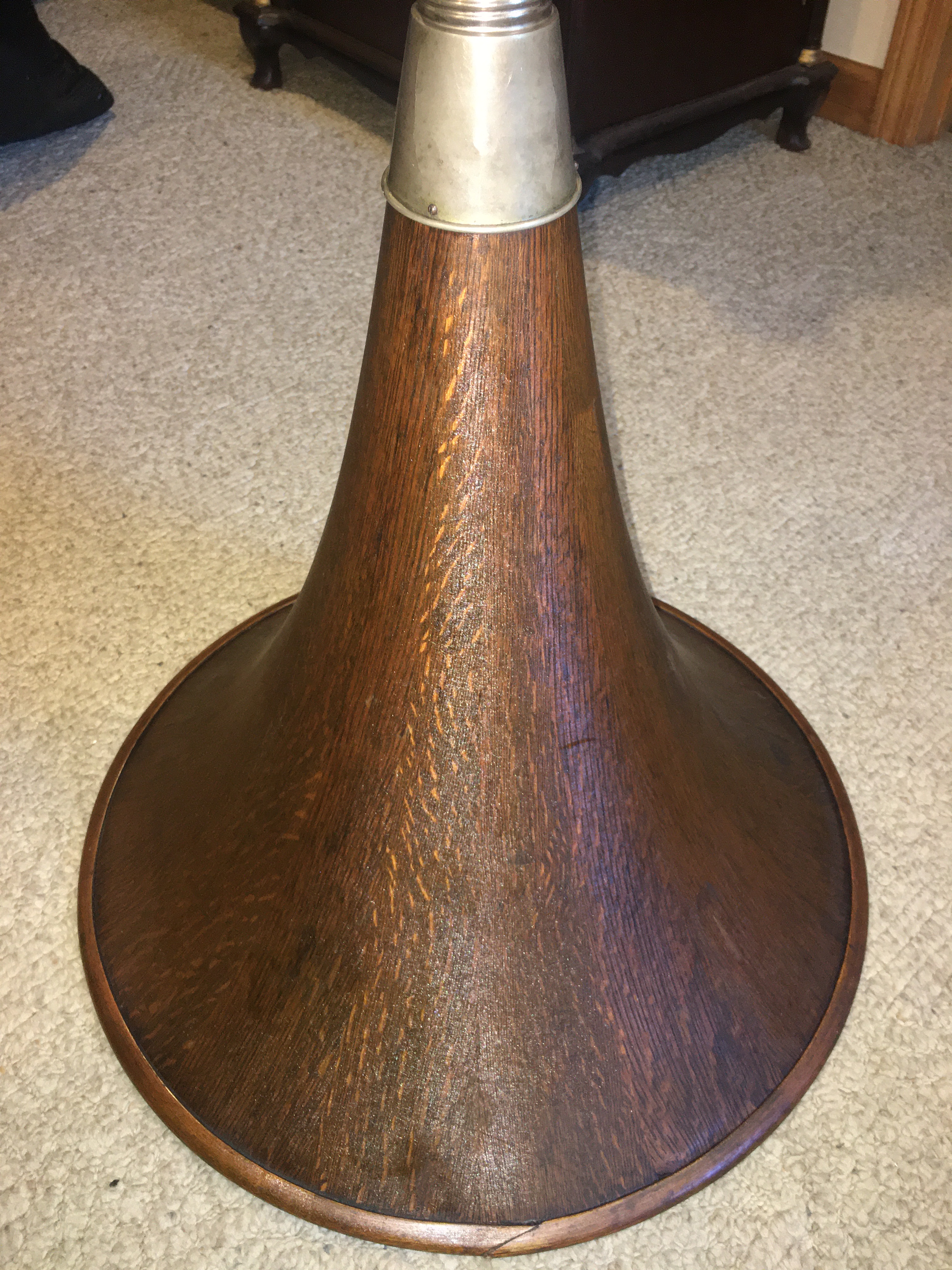 Hi, Here is a really nice Columbia Smooth Oak Horn. It is 21.5" diameter with some beautiful grain on many of the panels. There is one small chip about ½" long as seen on the interior bell picture. It is the standard screw in Columbia end with the little bit later elbow. I can sell the horn without the elbow for $850 plus shipping. or with the elbow for $950 Please PM. Call. Text or email to purchase or questions. Thanks. John Duffy 860-966-2827