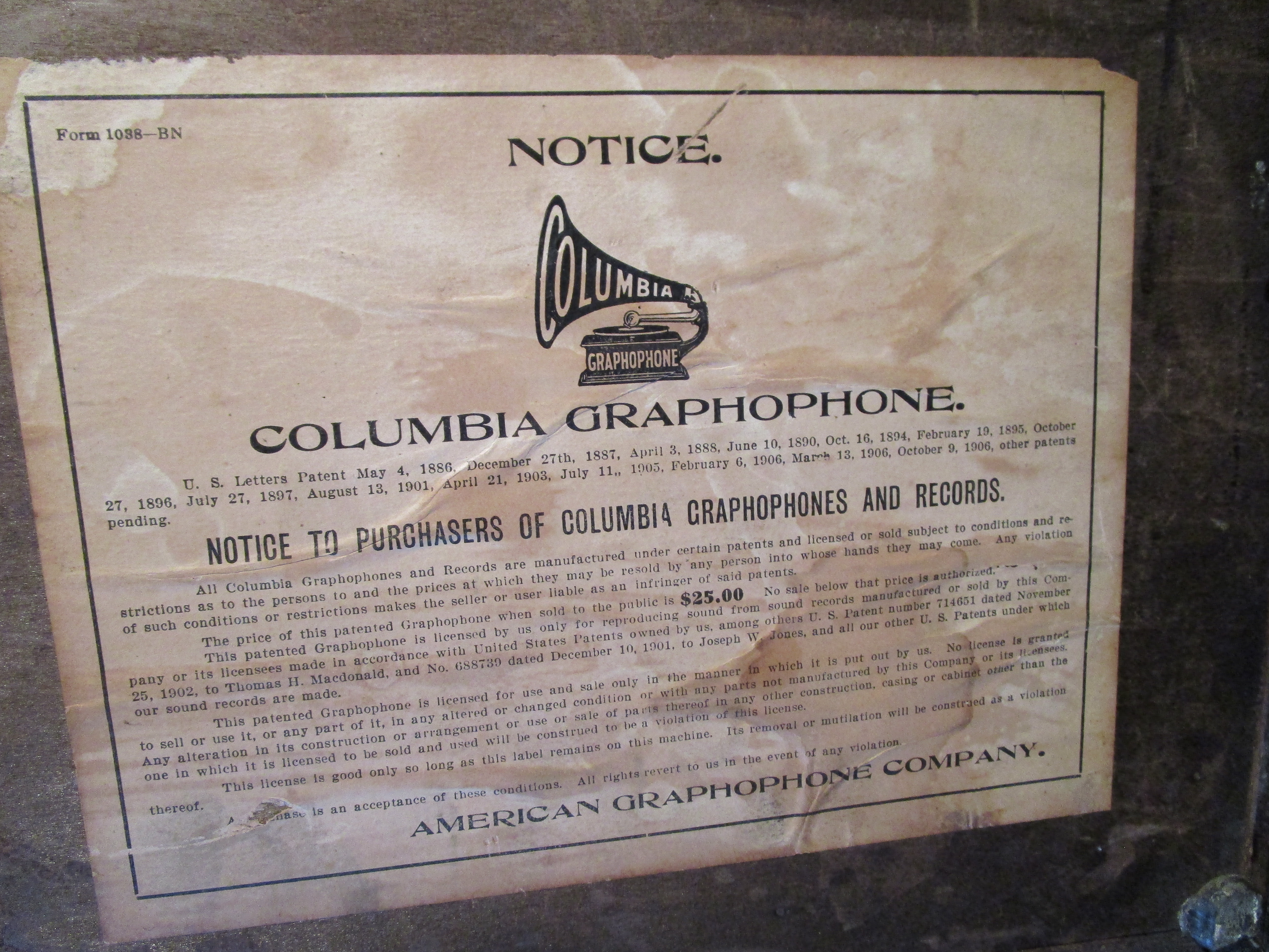 [$575 WITHOUT HORN (which will considerably reduce USPS Shipping Cost. Note the unusually nice and intact original Columbia Factory NOTICE sticker on the bottom of the cabinet!]