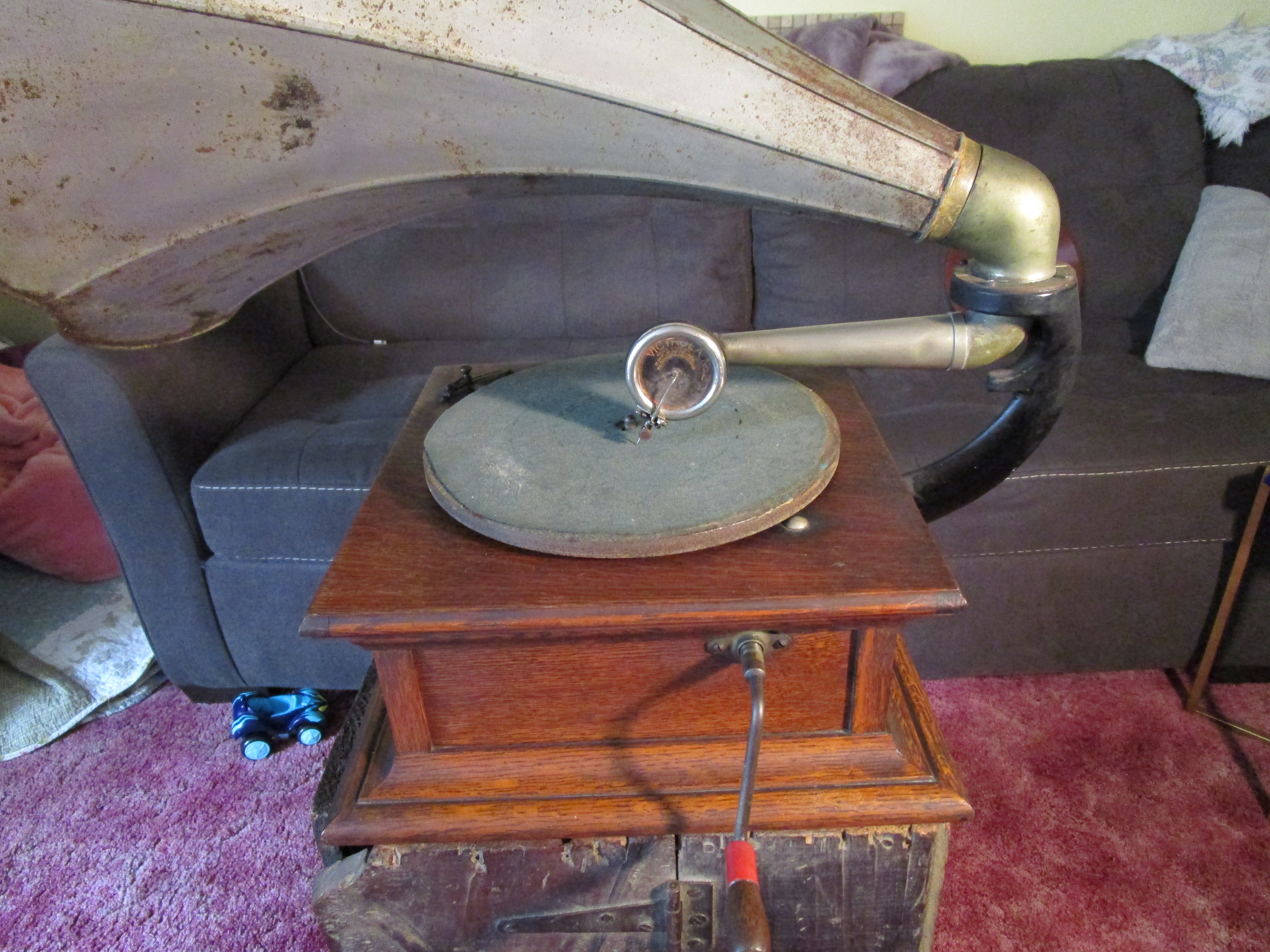 The original cabinet finish and original attractive Columbia-Horn decal are especially nice on this. The motor cranks up nicely and is quiet and has plenty of power, cast iron turntable rotates perfectly true, back mount has its original paint, elbow is nice.