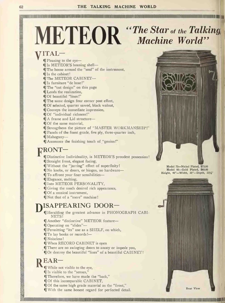 Here’s the only ad that I can find theat Meteor bought in “Talking Machine World” on pages 62 and 63 of the May 1917 issue, available for download from the World Radio History site: https://worldradiohistory.com/Archive-T ... 917-05.pdf