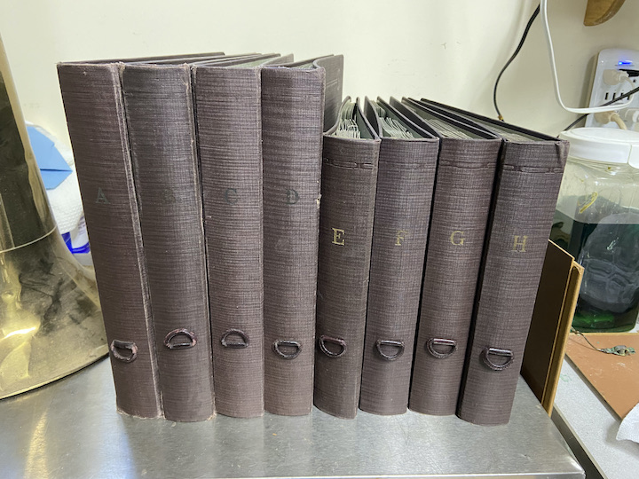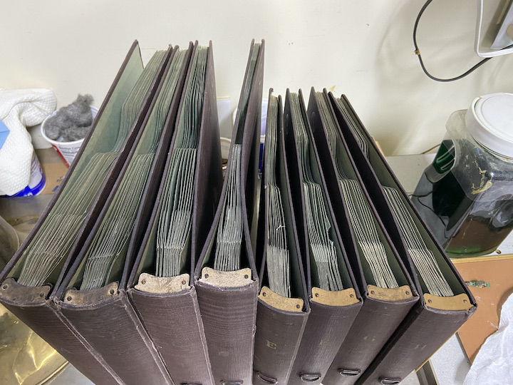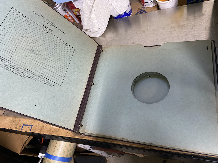 This is an excellent set of Victor record albums - A thru H, A thru D are for 12" records and E thru H are for 10 " records. They are in very good condition. There is only one minor tear on one of the sleeves. It is about 1" long and ¼" wide. There is also d small spot of damage to one of the album covers that could be pushed out and glued. The sleeves are all intact and not torn out. it does look like the bottom of several sleeves in one of the 12" albums appeared to have been repaired (See pic). All of the pull tabs for the albums are intact and in good shape. It is rare to find these albums in such good condition. I want $55 plus shipping.