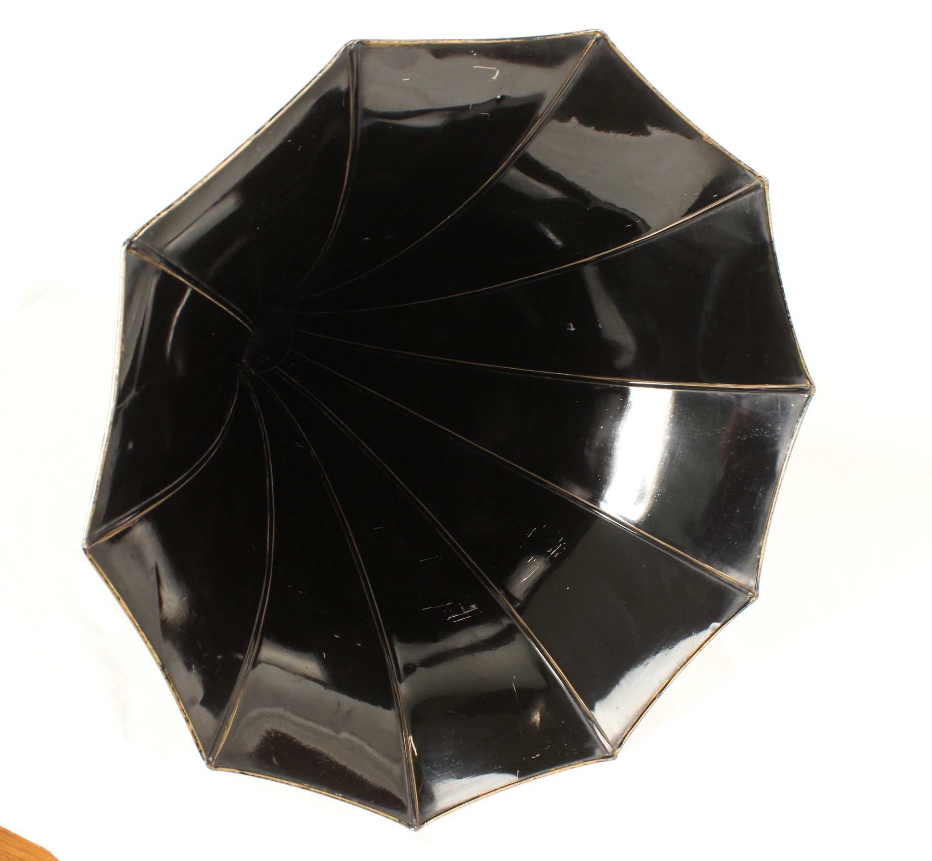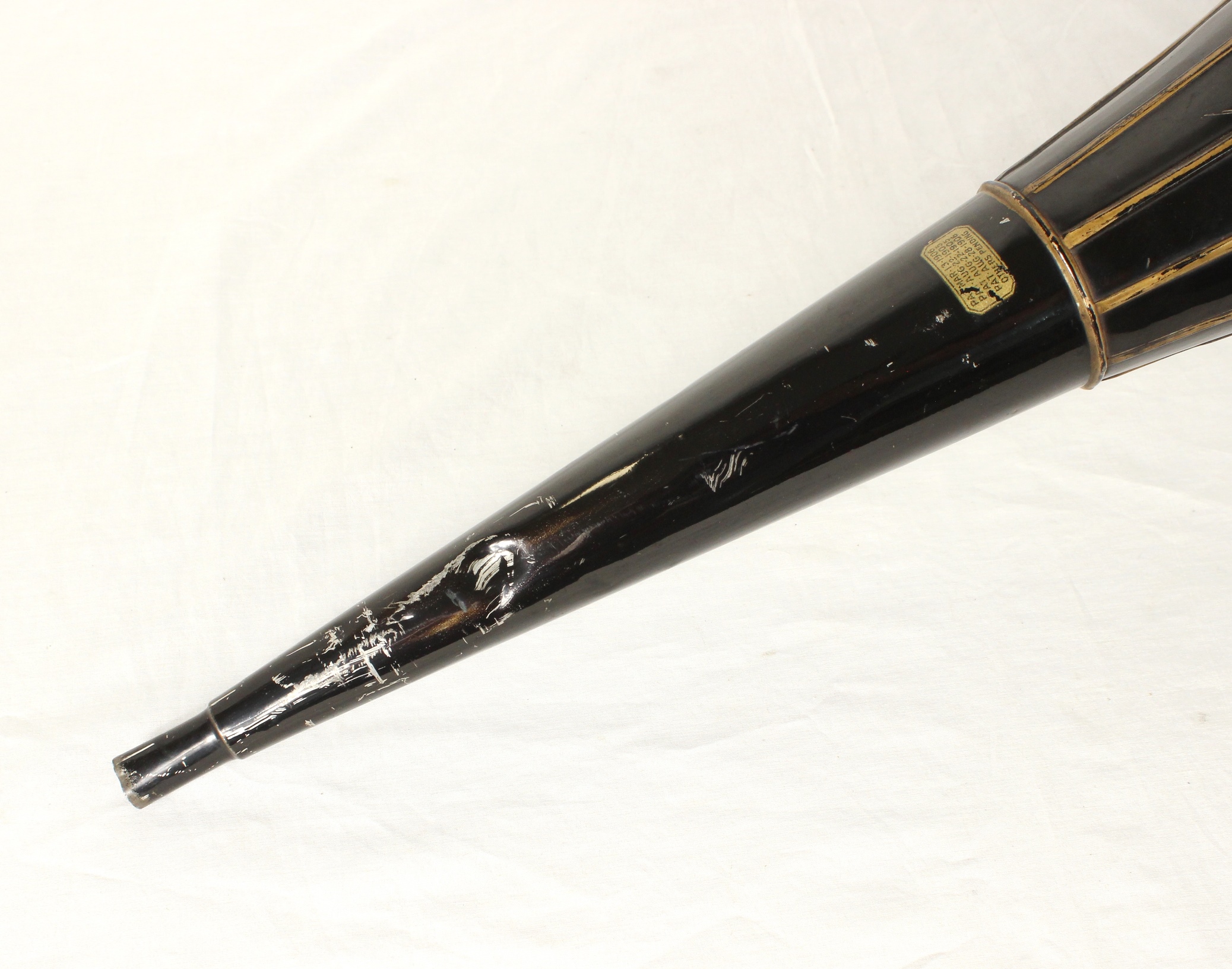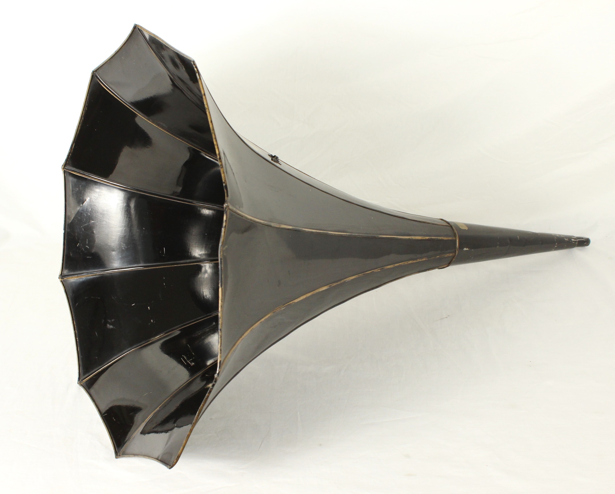 I am offering this all original, mint condition, 10-panel Edison Standard Horn. There are only minimal scratches and one ding down by the reproducer end. Otherwise, this horn has a very shiny and beautiful original finish including the gold pin striping. In all my years collecting phonographs, I have never seen such a pristine example of an Edison panel horn. So often they are dull, faded, rusty, or repainted. But not this one.