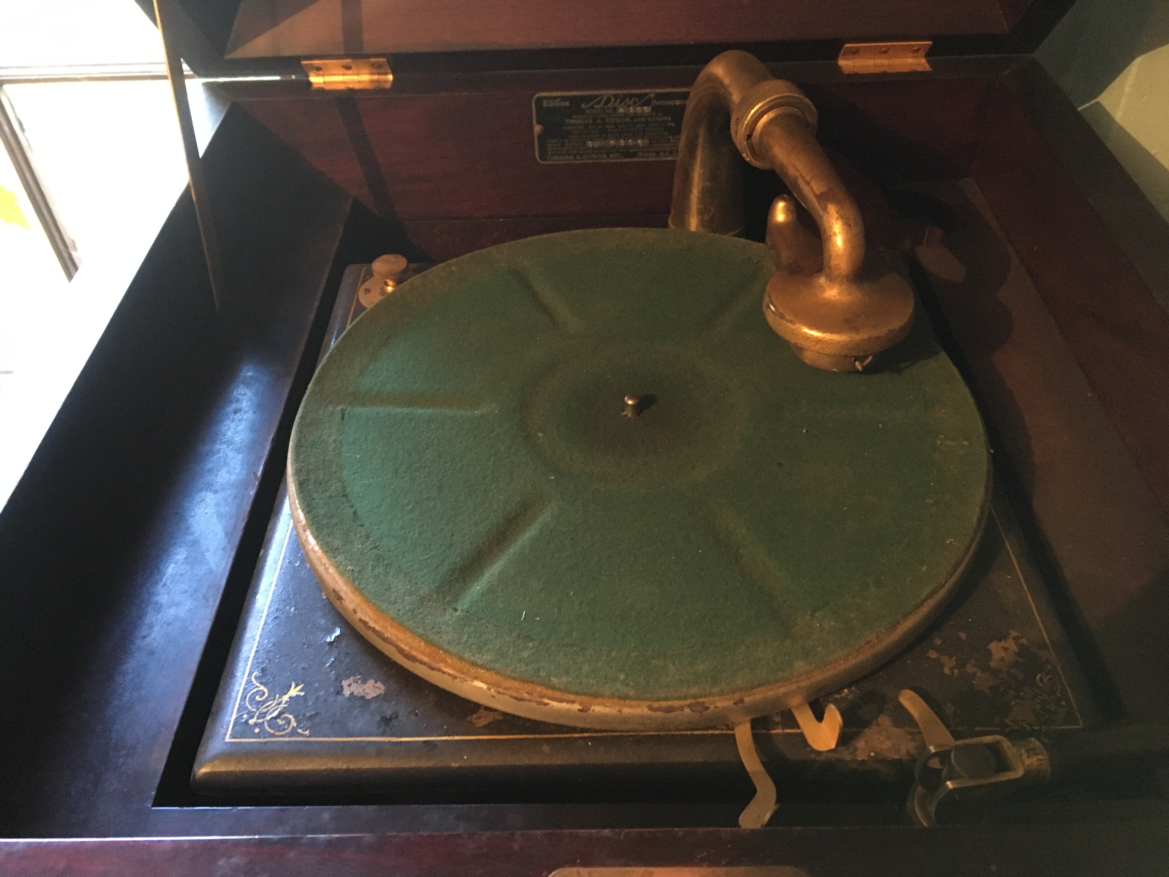 The bad: The horn and bedplate in my opinion need repainting as the paint has mostly flaked off, the motor needs a thorough cleaning, The veneer on the drawer front needs reglueing but neither the veneer nor the base wood are warped. Reproducer is complete but is the later style without the screwed down plate usually seen on the early reproducers and will need a complete rebuild.