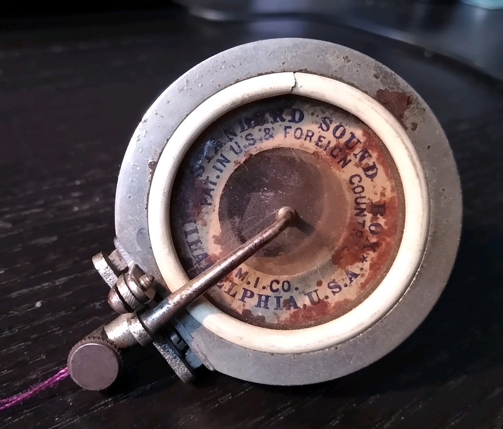 This reproducer is exactly the same as an Eldridge Johnson New Century. The only difference is the paper under the diaphragm… Says Standard Sound Box. It was sold for the secondary market as n upgrade to existing reproducers. This one was found on a Zonophone. It has been re-built. The nickel is in very good condition with a minor blemishes and a great patina.
