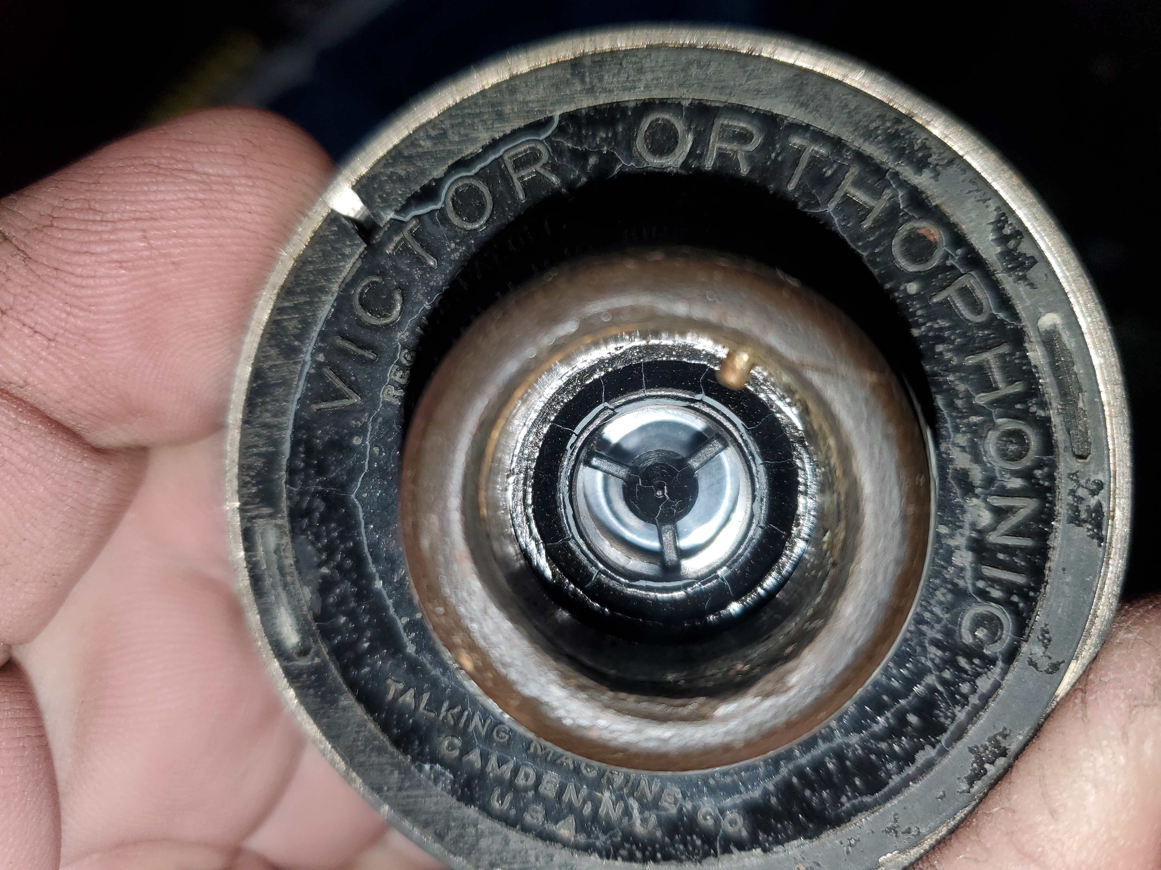 Here is my offering: potmetal Orthphonic reproducer, no cracks, swelling or chipping. The needle bar pivot bearings have been cleaned, lubed and new rubber cushions installed. I believe I changed the diaphragm gaskets at the same time but I am not certain of that. The rubber isolator has also been replaced. It plays very well without distortion and gives good sound. There is wear to the gold finish especially around the edge but overall presents well. The price is $75.00 plus shipping, most likely via Priority Mail.